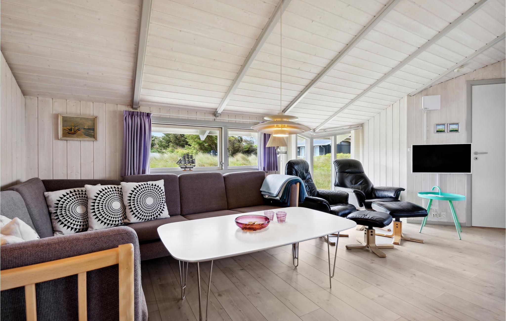 Skønt feriehus i Houvig tæt på Vesterhavet med sauna, spabad og to terrasser for afslapning i naturskønne omgivelser.