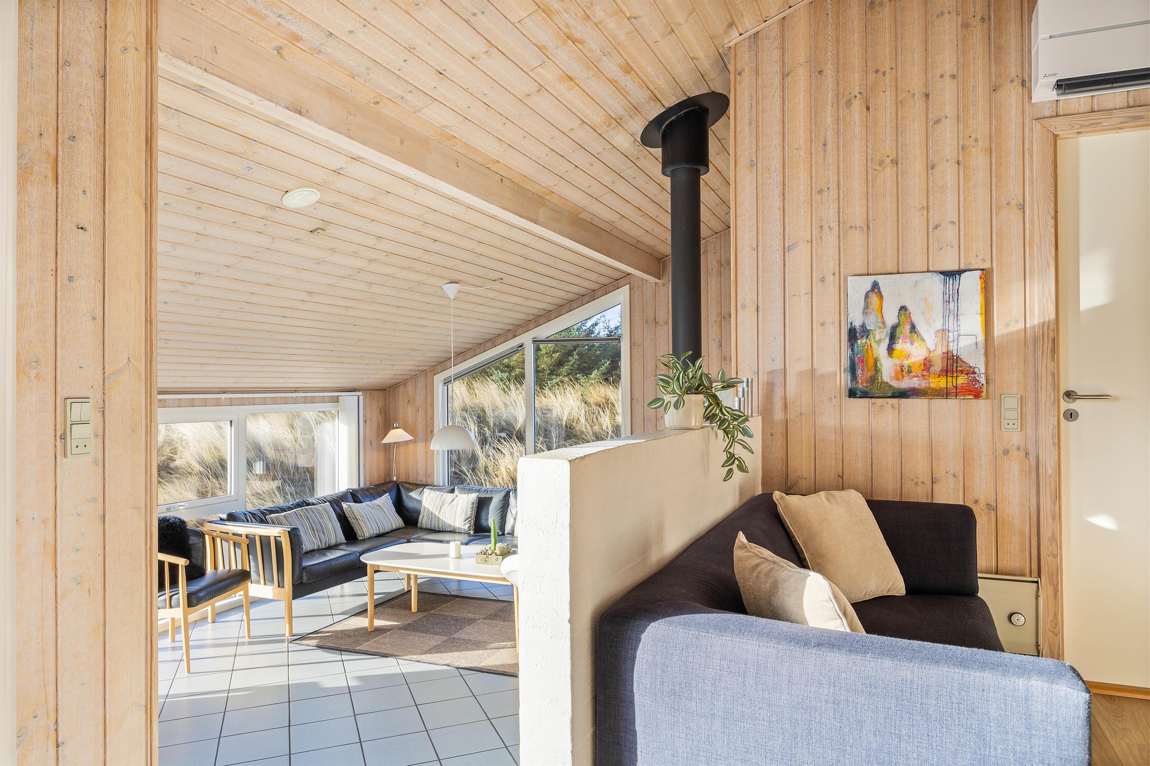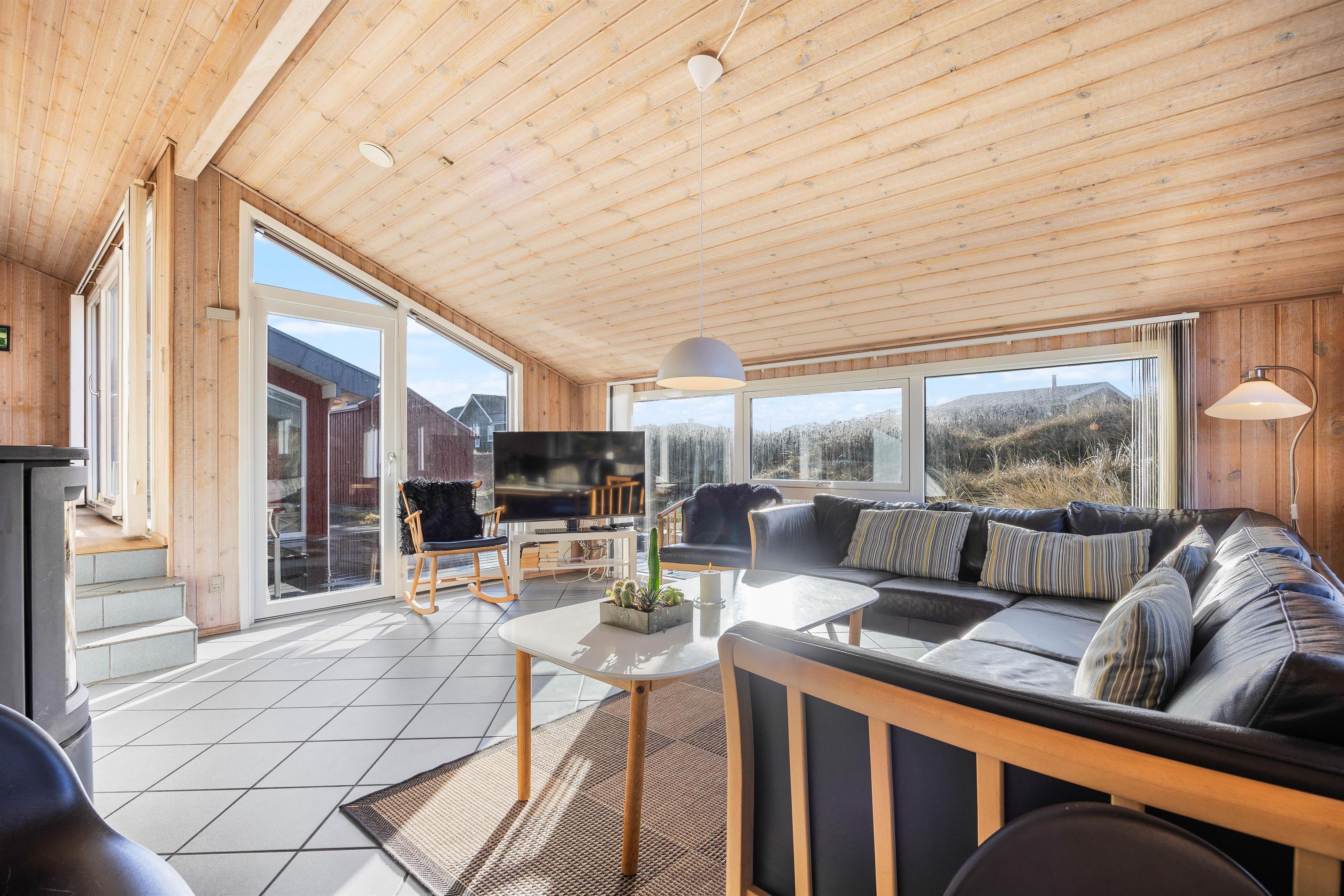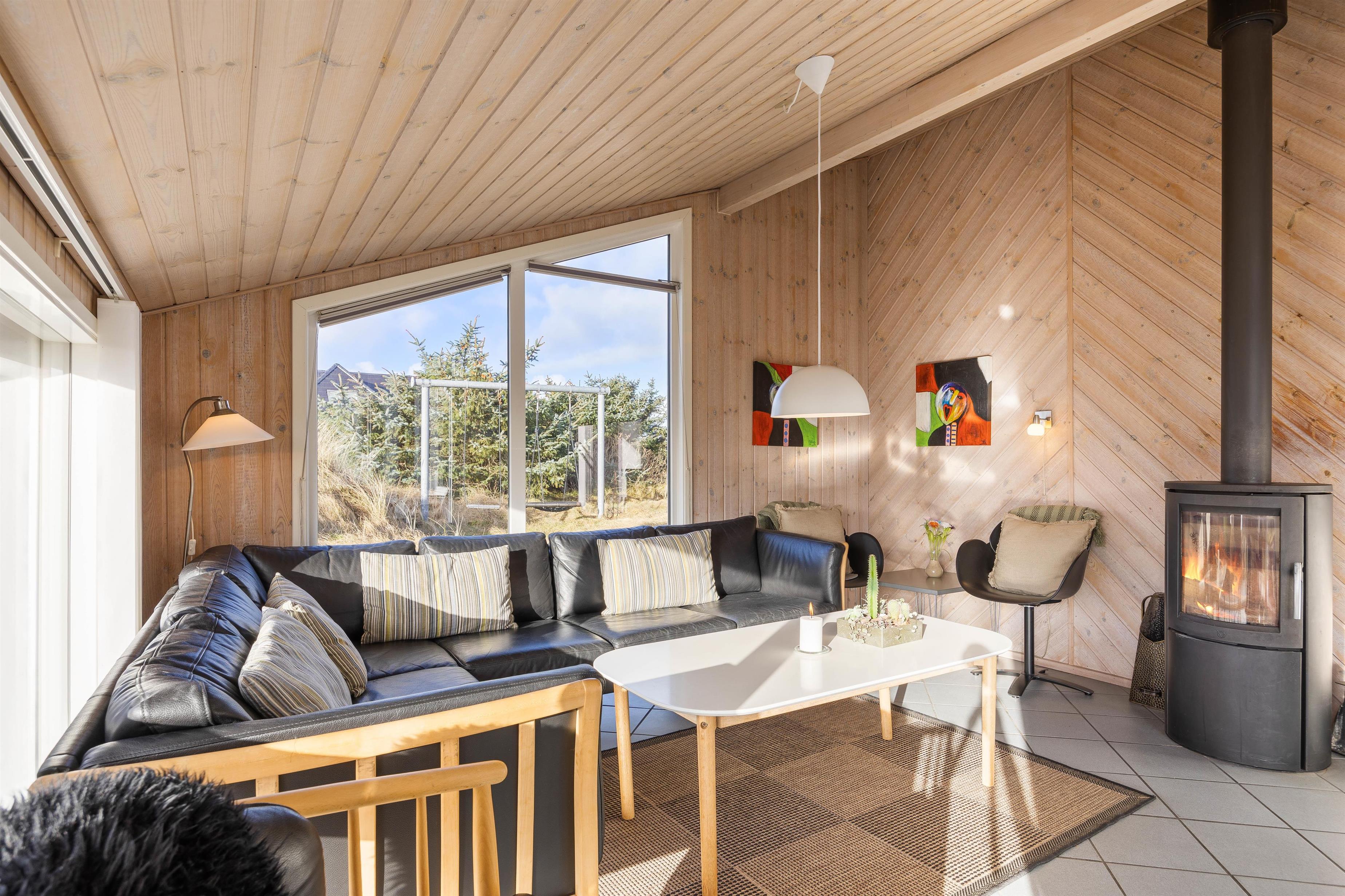 Spiseafdelingen ligger i forbindelse med køkkenet, og stuen er beliggende 3 trin lavere, hvilket giver en rigtig god effekt og skaber masser af hygge. I stuen står der en flot brændeovn, et fladskærms-TV og en DVD. Prikken over i'et i stuen, er uden tvivl de gode vinduespartier, hvor der kommer en masse god dagslys ind, samtidig med at det giver en god udsigt til de omkringliggende klitarealer.