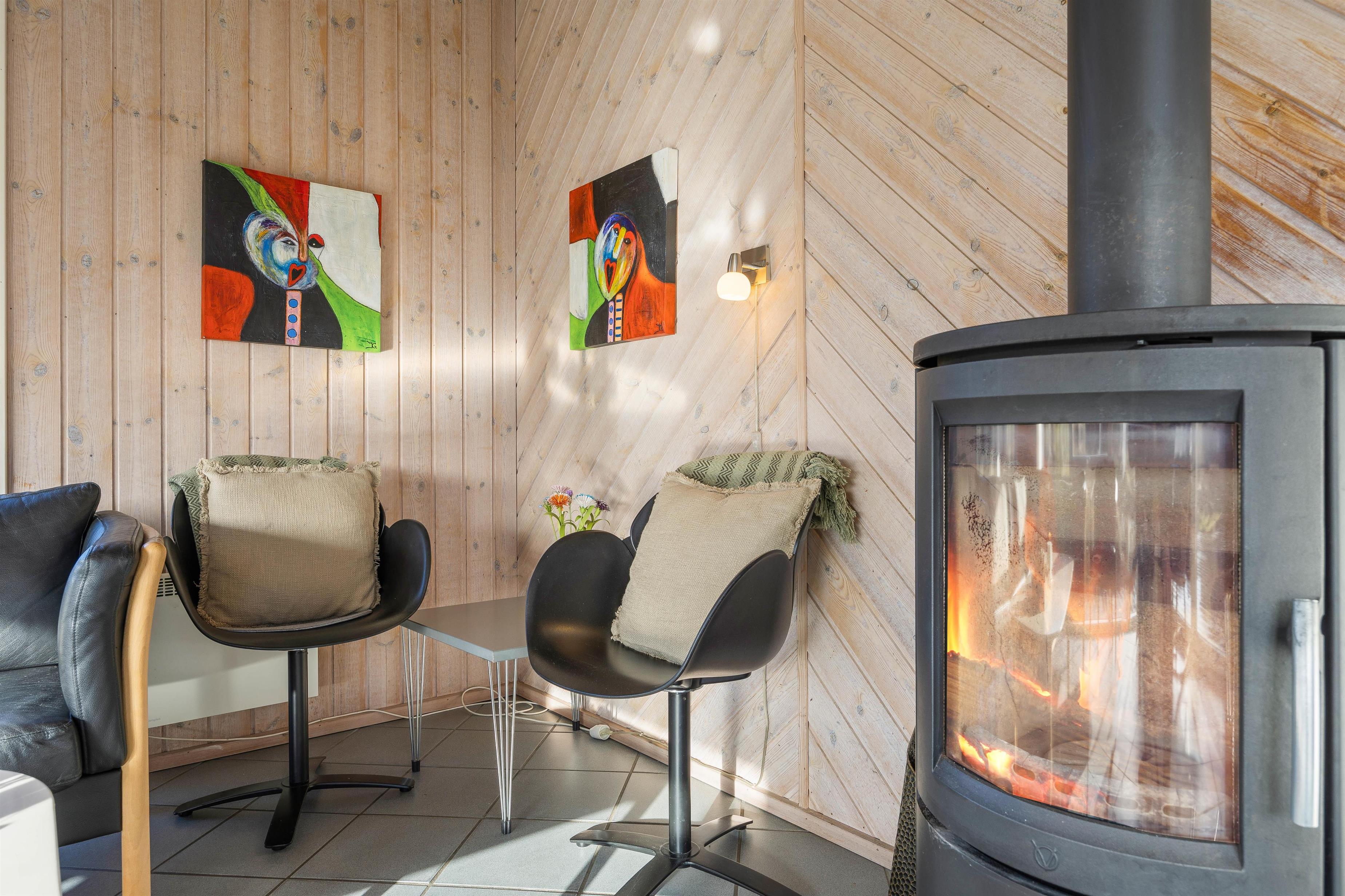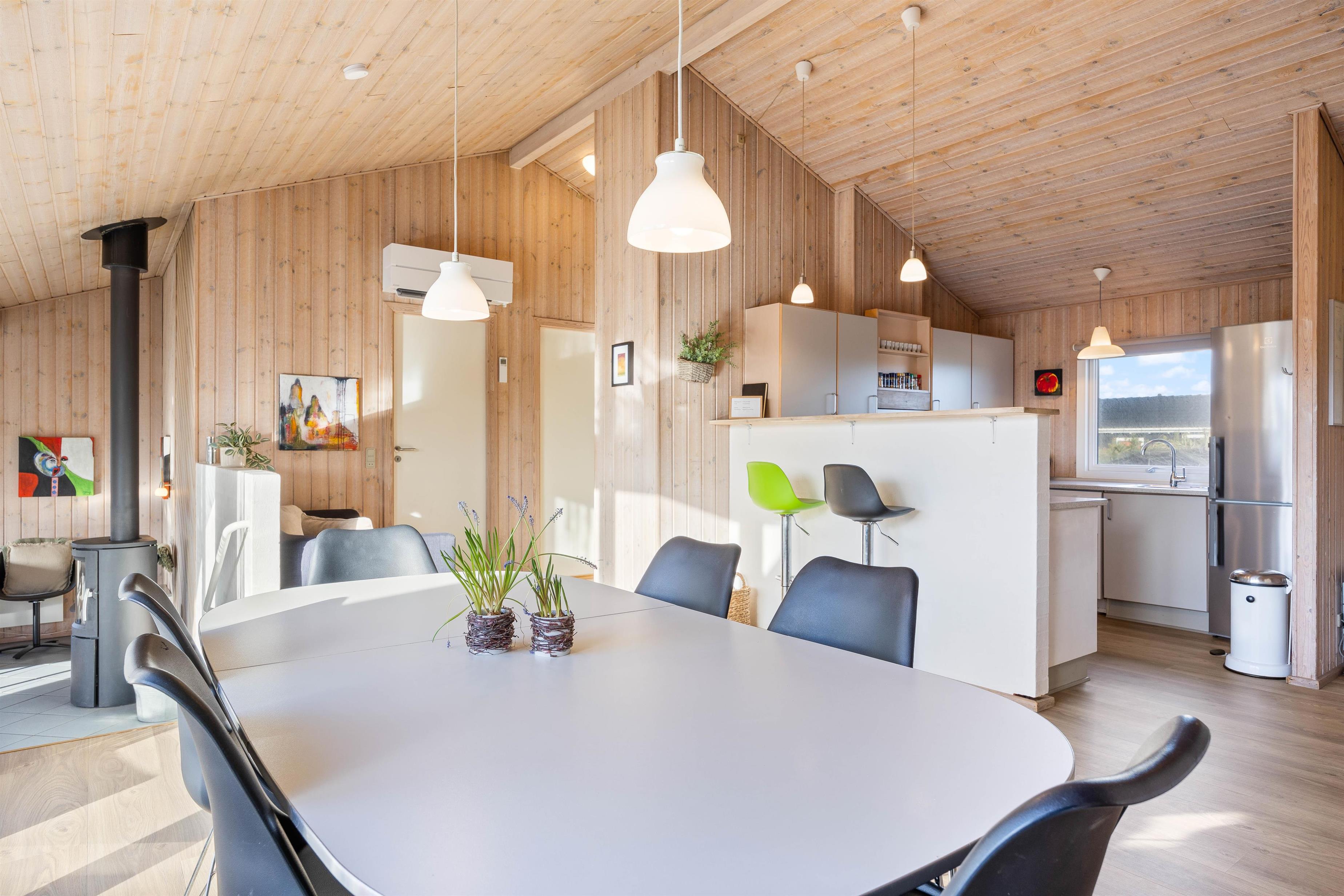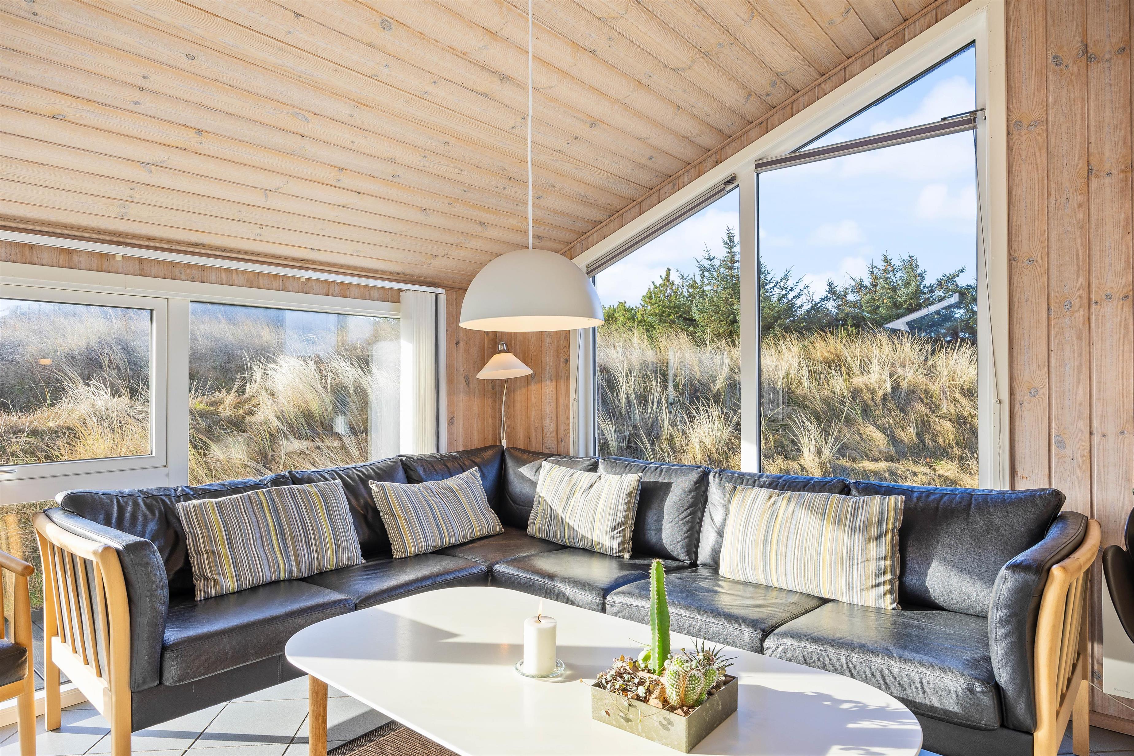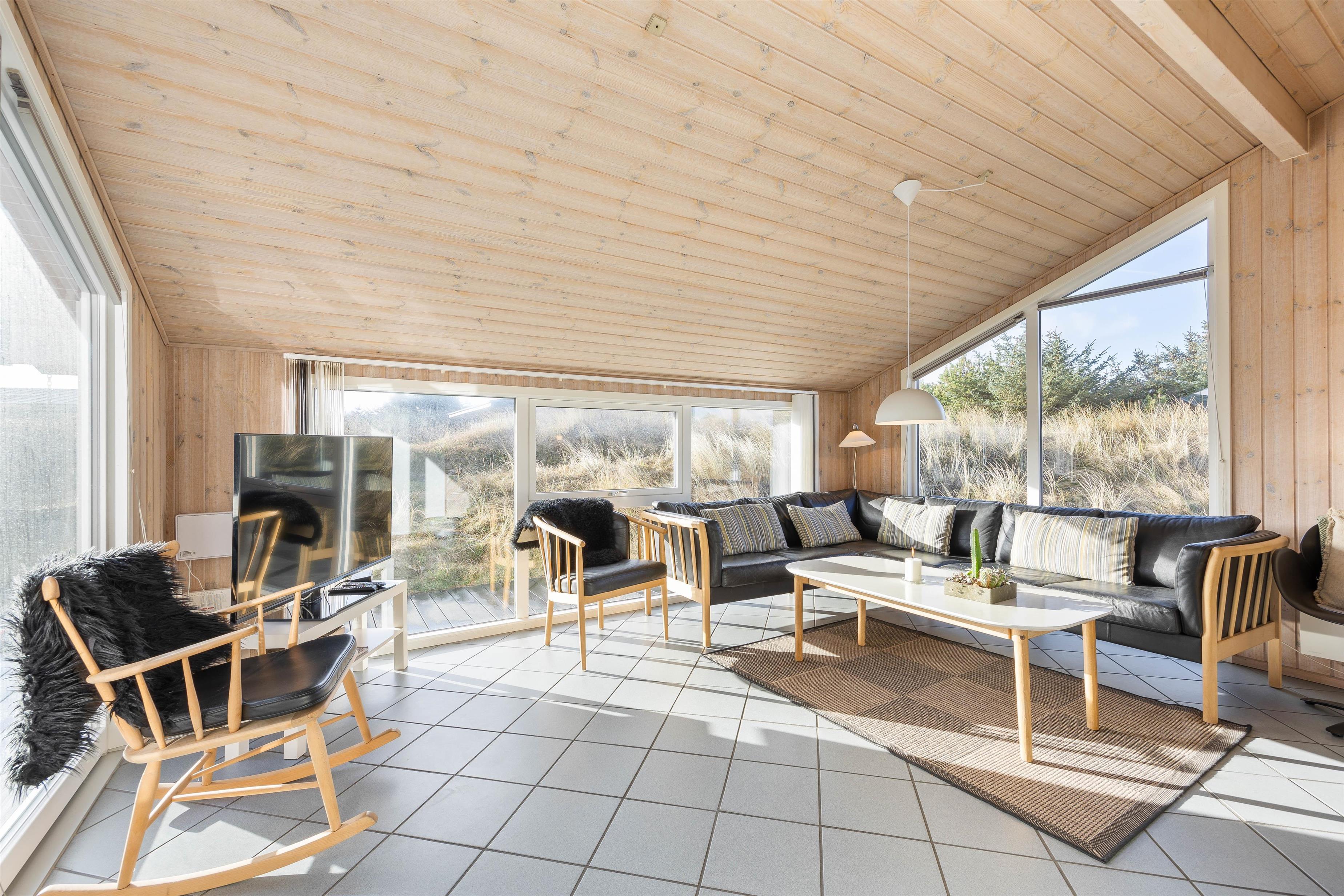 Spiseafdelingen ligger i forbindelse med køkkenet, og stuen er beliggende 3 trin lavere, hvilket giver en rigtig god effekt og skaber masser af hygge. I stuen står der en flot brændeovn, et fladskærms-TV og en DVD. Prikken over i'et i stuen, er uden tvivl de gode vinduespartier, hvor der kommer en masse god dagslys ind, samtidig med at det giver en god udsigt til de omkringliggende klitarealer.