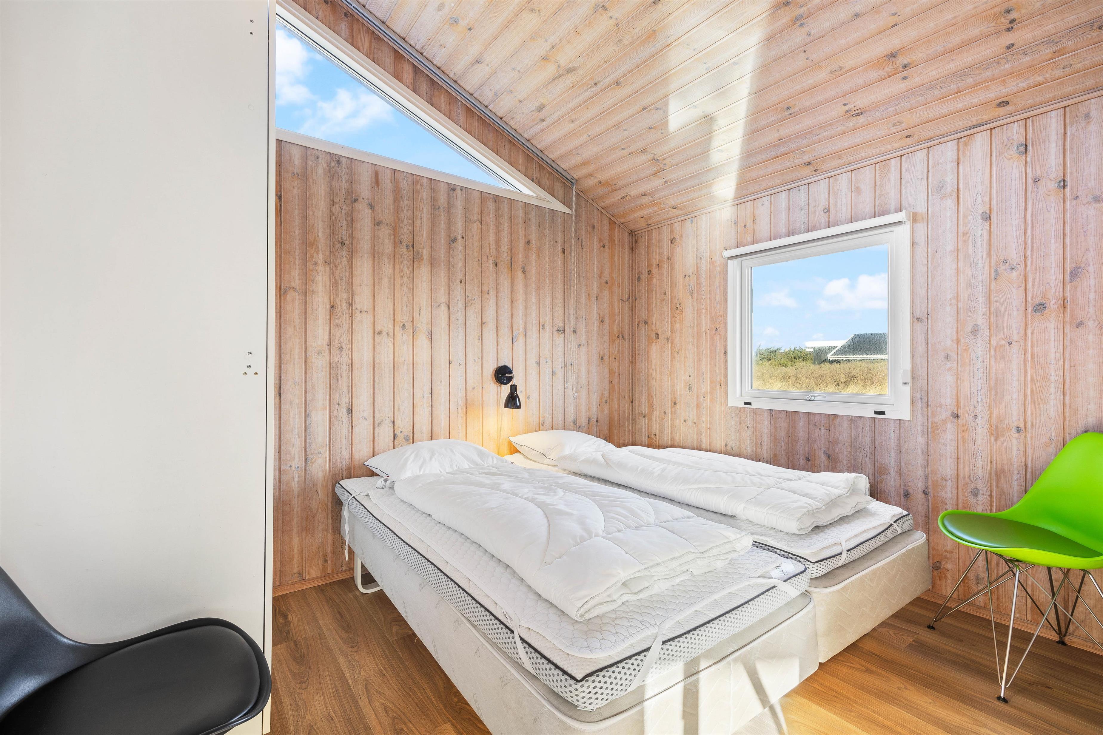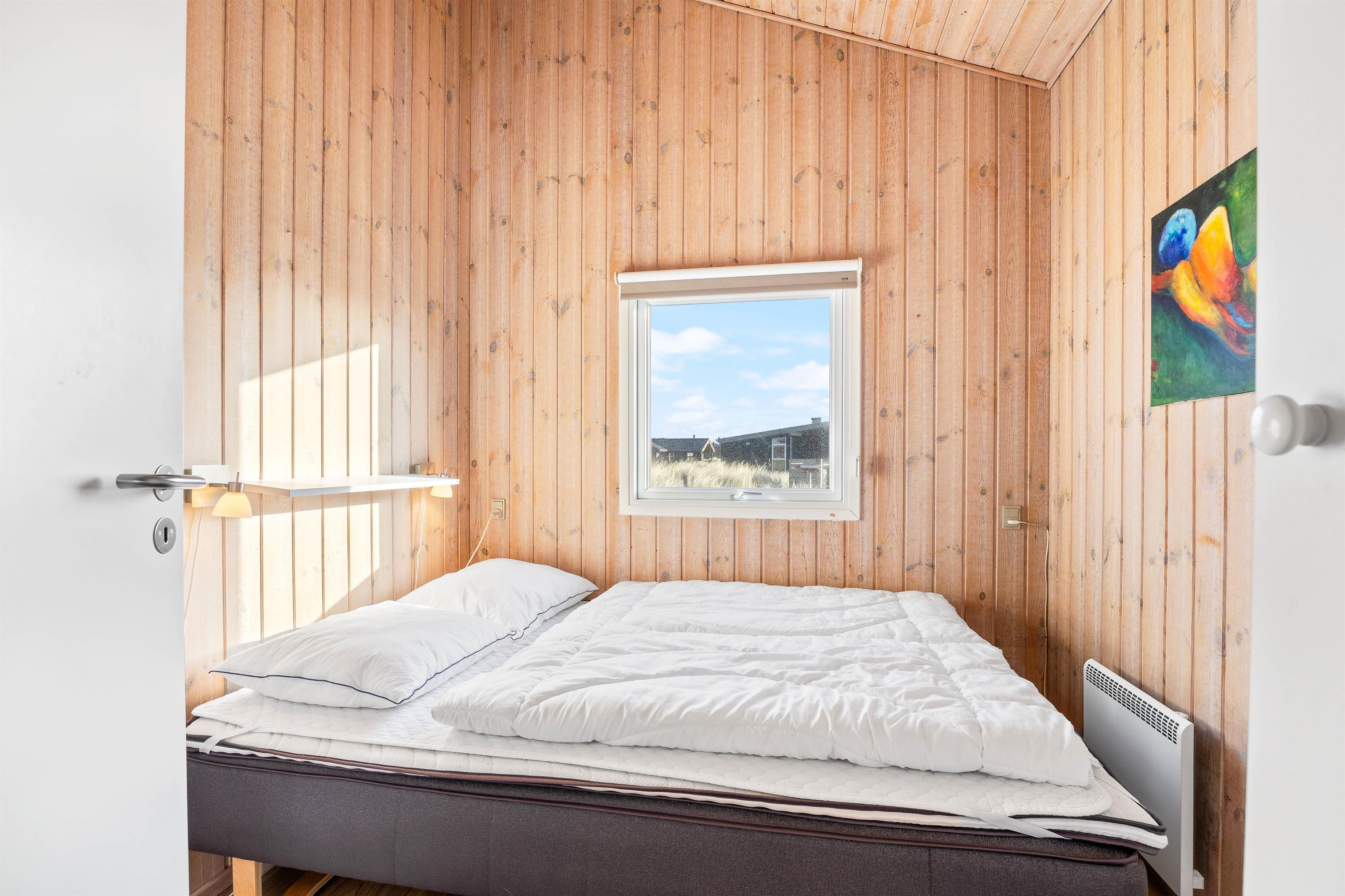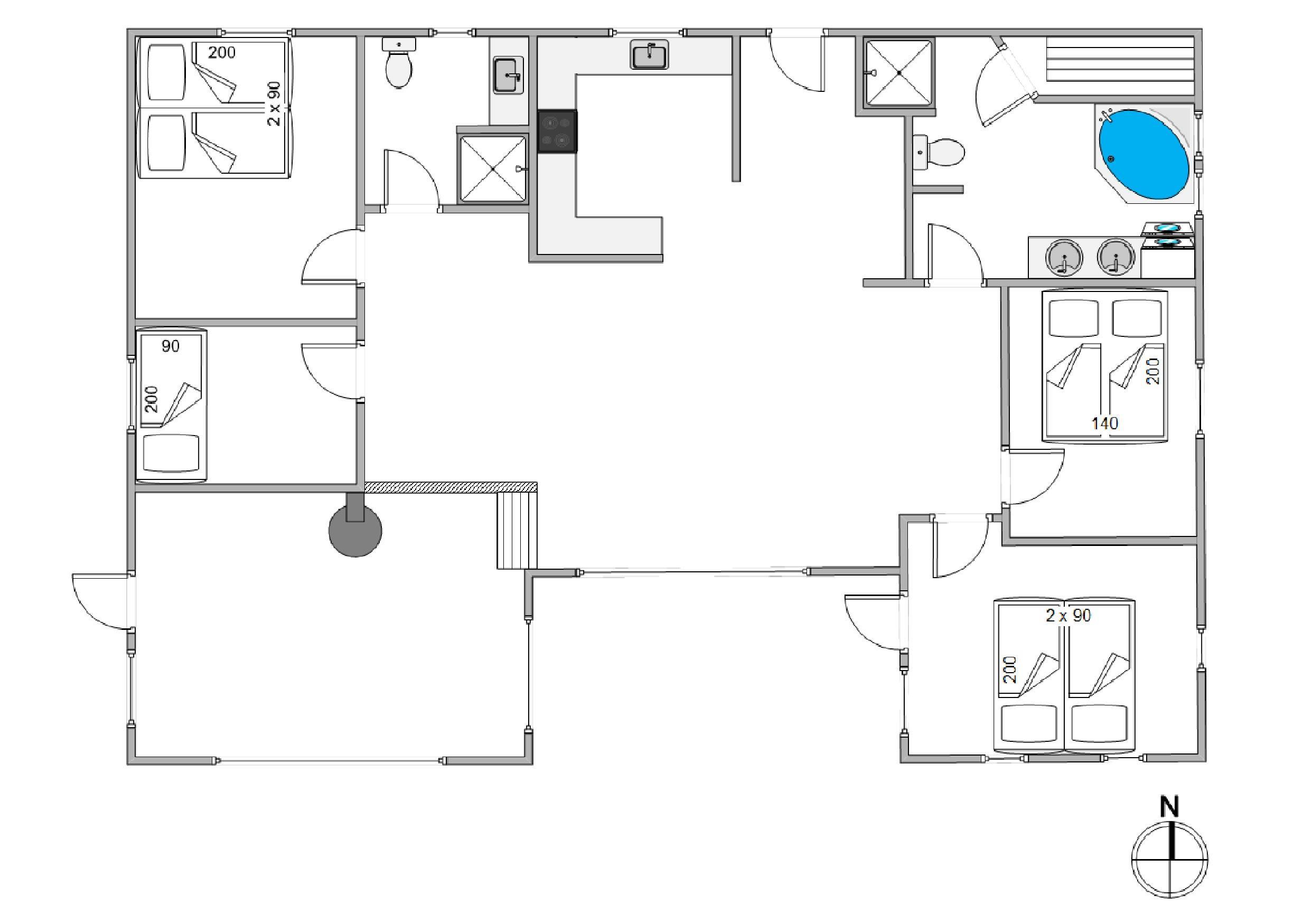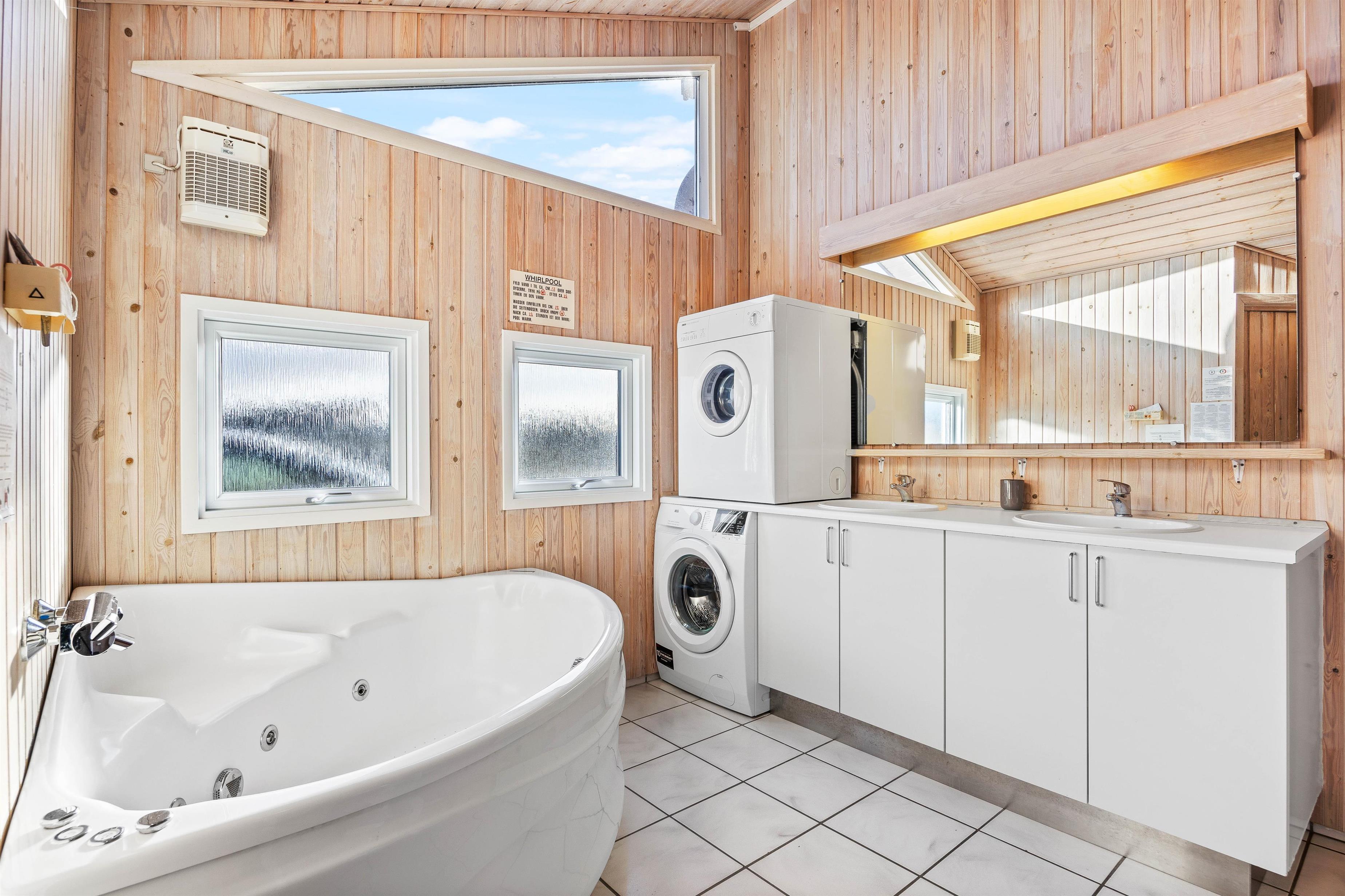 Der er 4 soveværelser i dette sommerhus, 2 i hver ende af huset, hvilket er ideelt hvis 2 familier tager på ferie sammen. 2 af værelserne er indrettet med dobbeltseng, et har 2 enkeltsenge og det sidste værelse, som altid er populært hos børnene, er udstyret med en enkeltseng og en madras på en hems. De 2 badeværelser har begge bruseniche og gulvvarme. I det store badeværelse er der desuden en 2 pers. hjørnespa, sauna, vaskemaskine og tørretumbler. Køkkenet, som er placeret midt i huset, er bl.a. udstyret med mikroovn, fryser på 80 l og en opvaskemaskine.