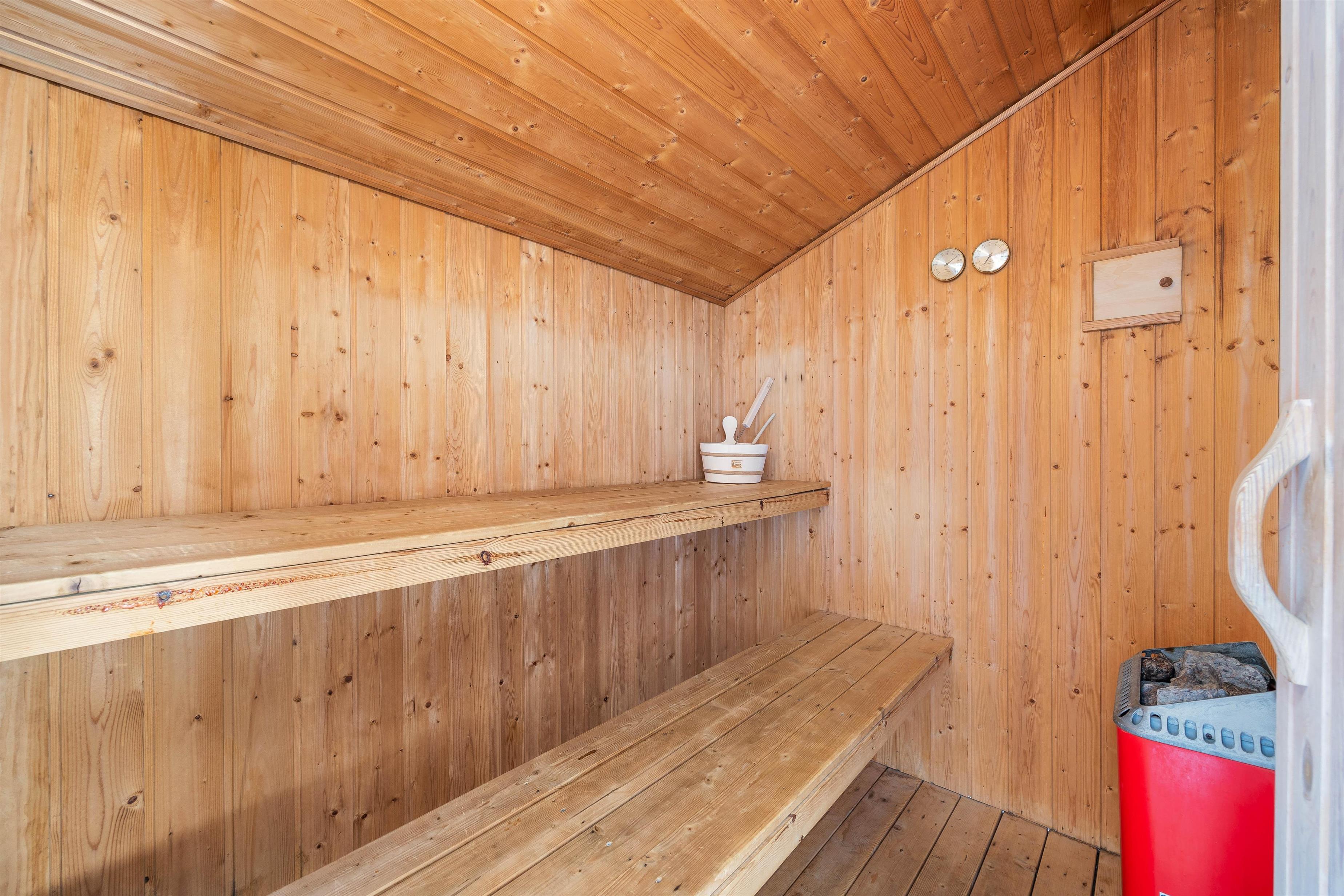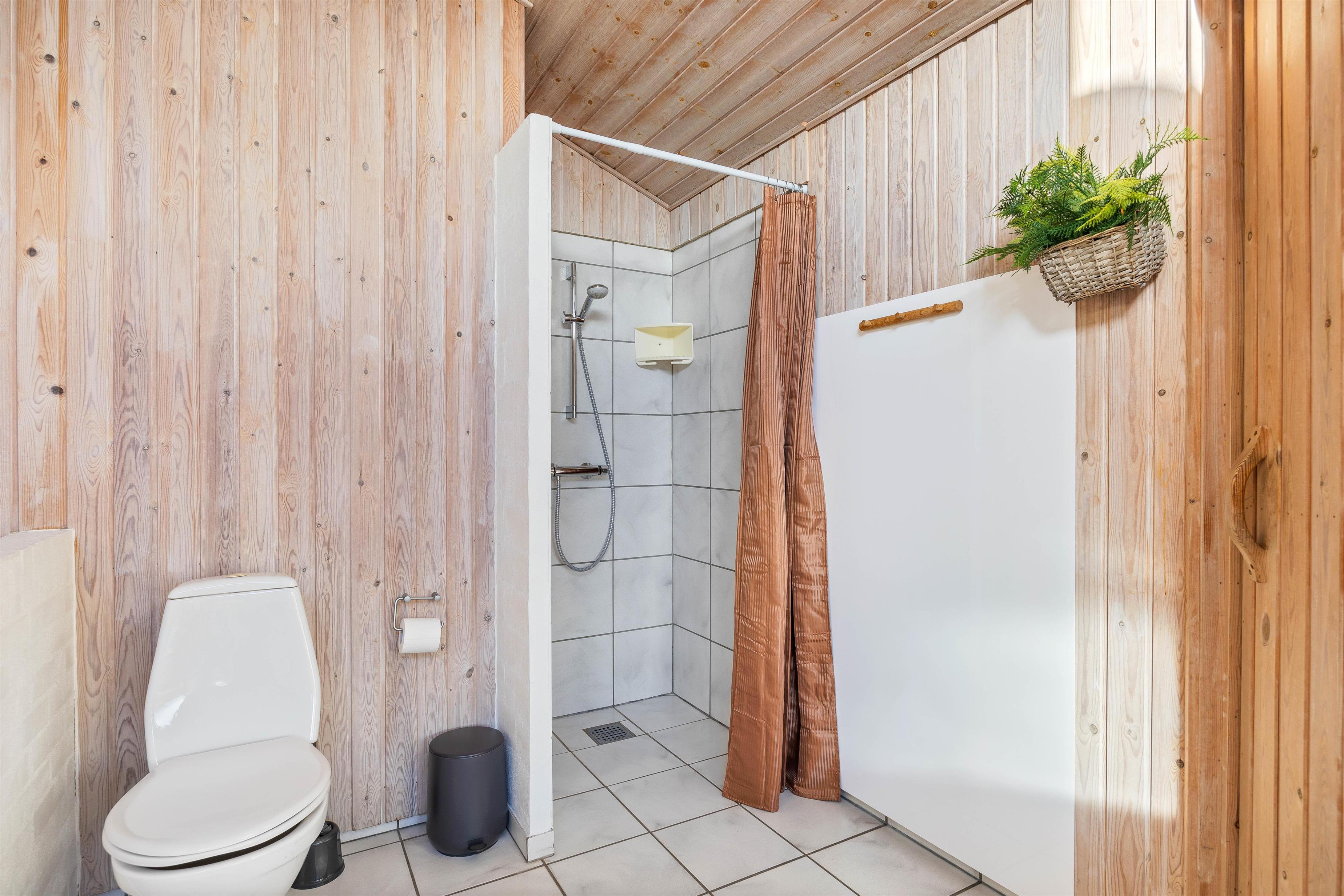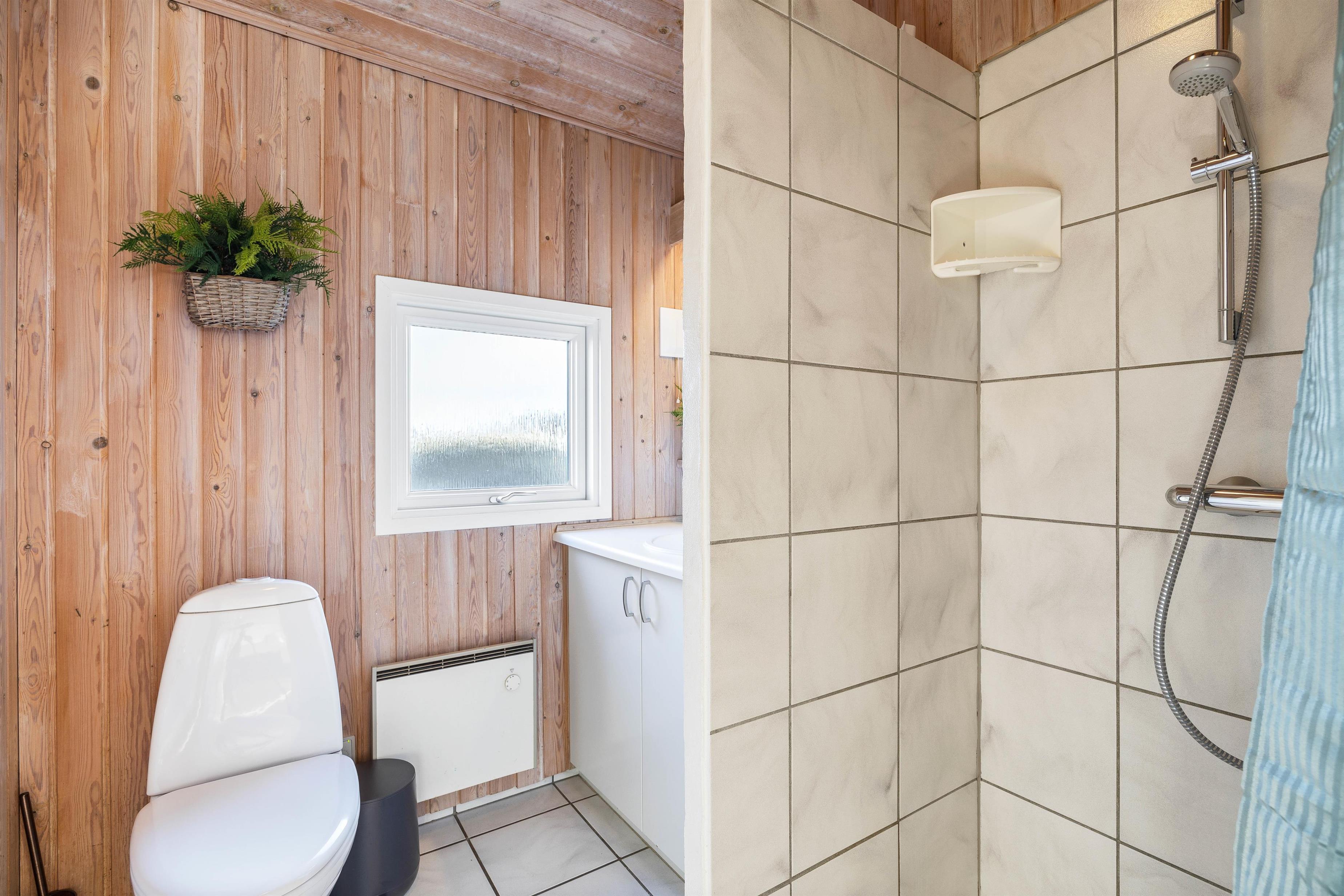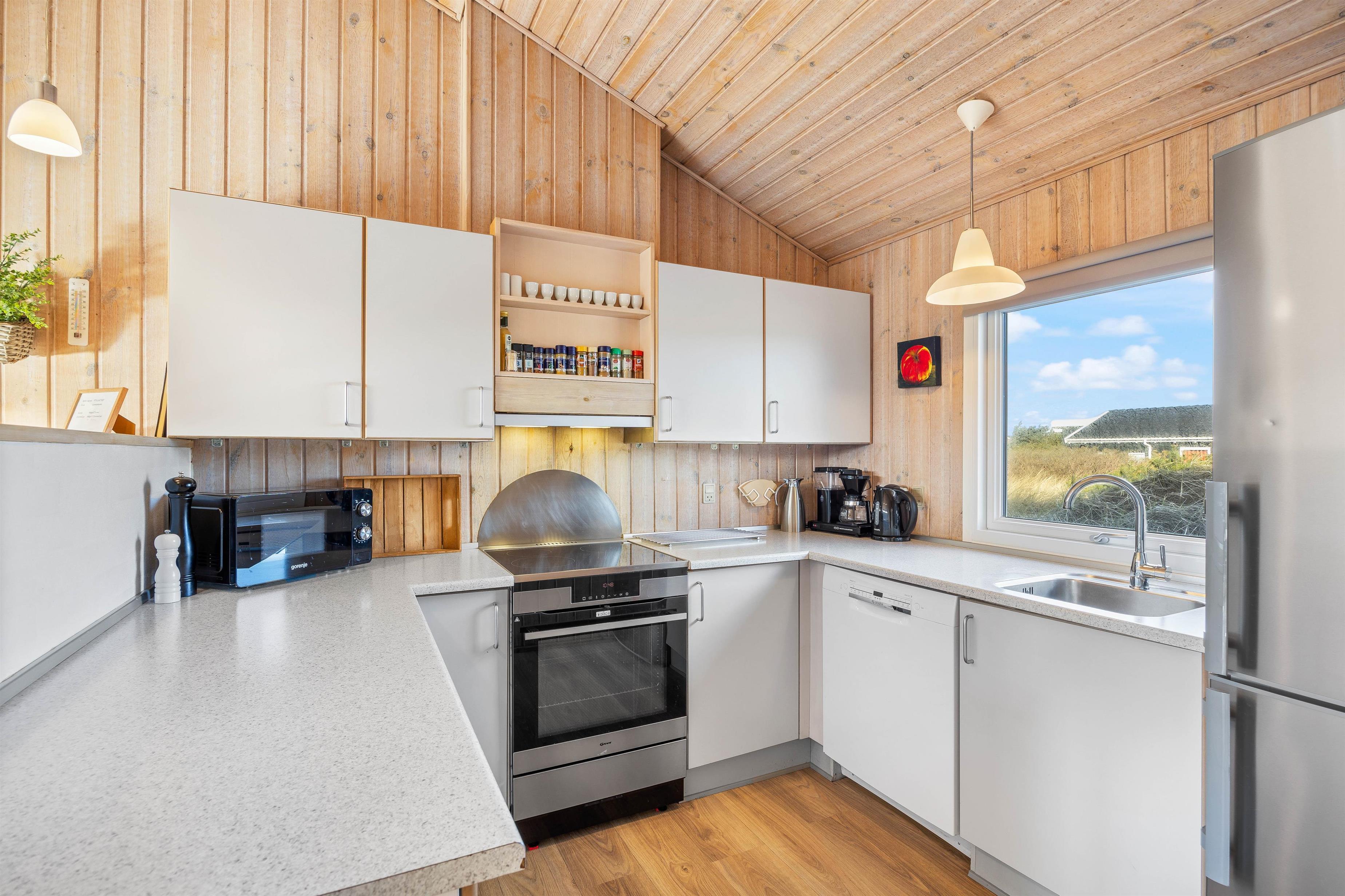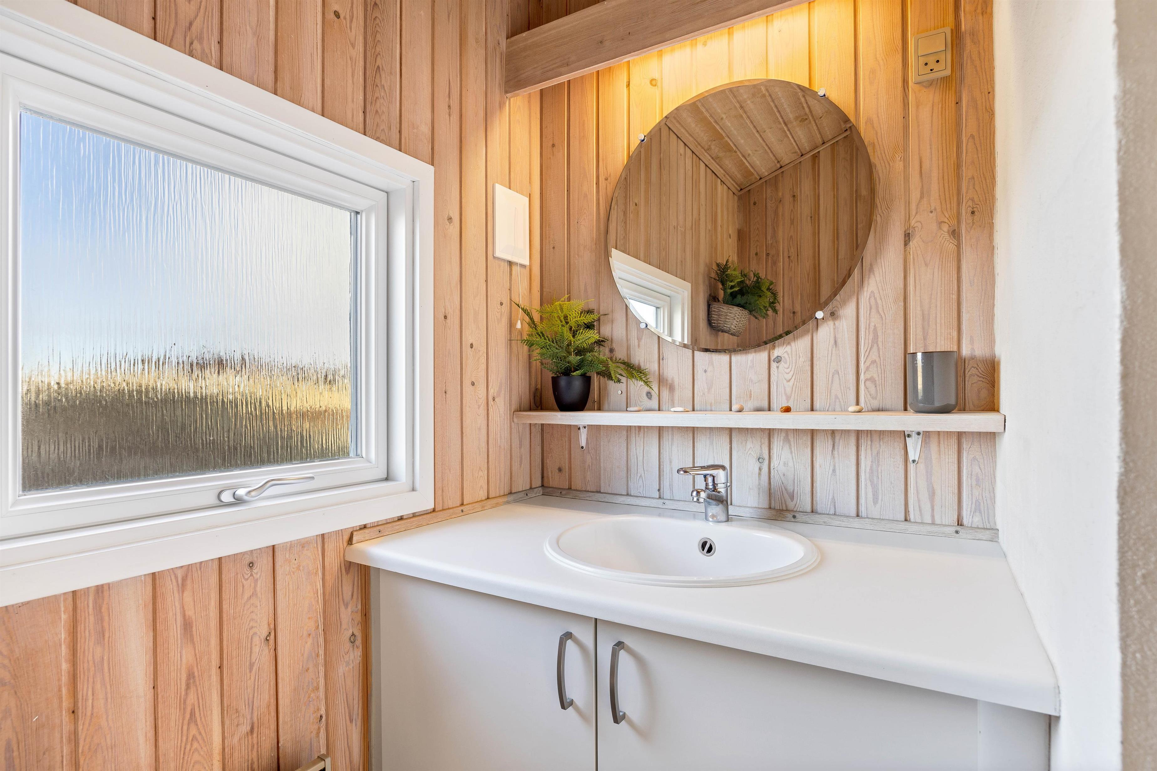 Der er 4 soveværelser i dette sommerhus, 2 i hver ende af huset, hvilket er ideelt hvis 2 familier tager på ferie sammen. 2 af værelserne er indrettet med dobbeltseng, et har 2 enkeltsenge og det sidste værelse, som altid er populært hos børnene, er udstyret med en enkeltseng og en madras på en hems. De 2 badeværelser har begge bruseniche og gulvvarme. I det store badeværelse er der desuden en 2 pers. hjørnespa, sauna, vaskemaskine og tørretumbler. Køkkenet, som er placeret midt i huset, er bl.a. udstyret med mikroovn, fryser på 80 l og en opvaskemaskine.