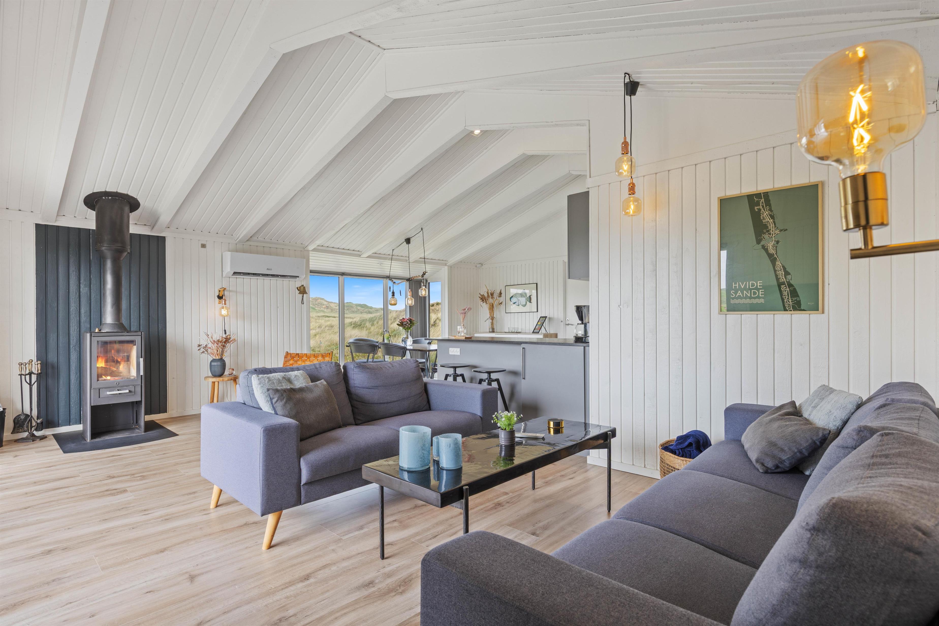 Fra alrummet kan I betragte Houvigs åbne vidder fra sofaen gennem de store vinduer, mens brændeovnens ild knitrer i baggrunden og sender feriestemningen helt til vejrs. En energibesparende varmepumpe sikrer, at I altid har et behageligt indeklima uden de store omkostninger.