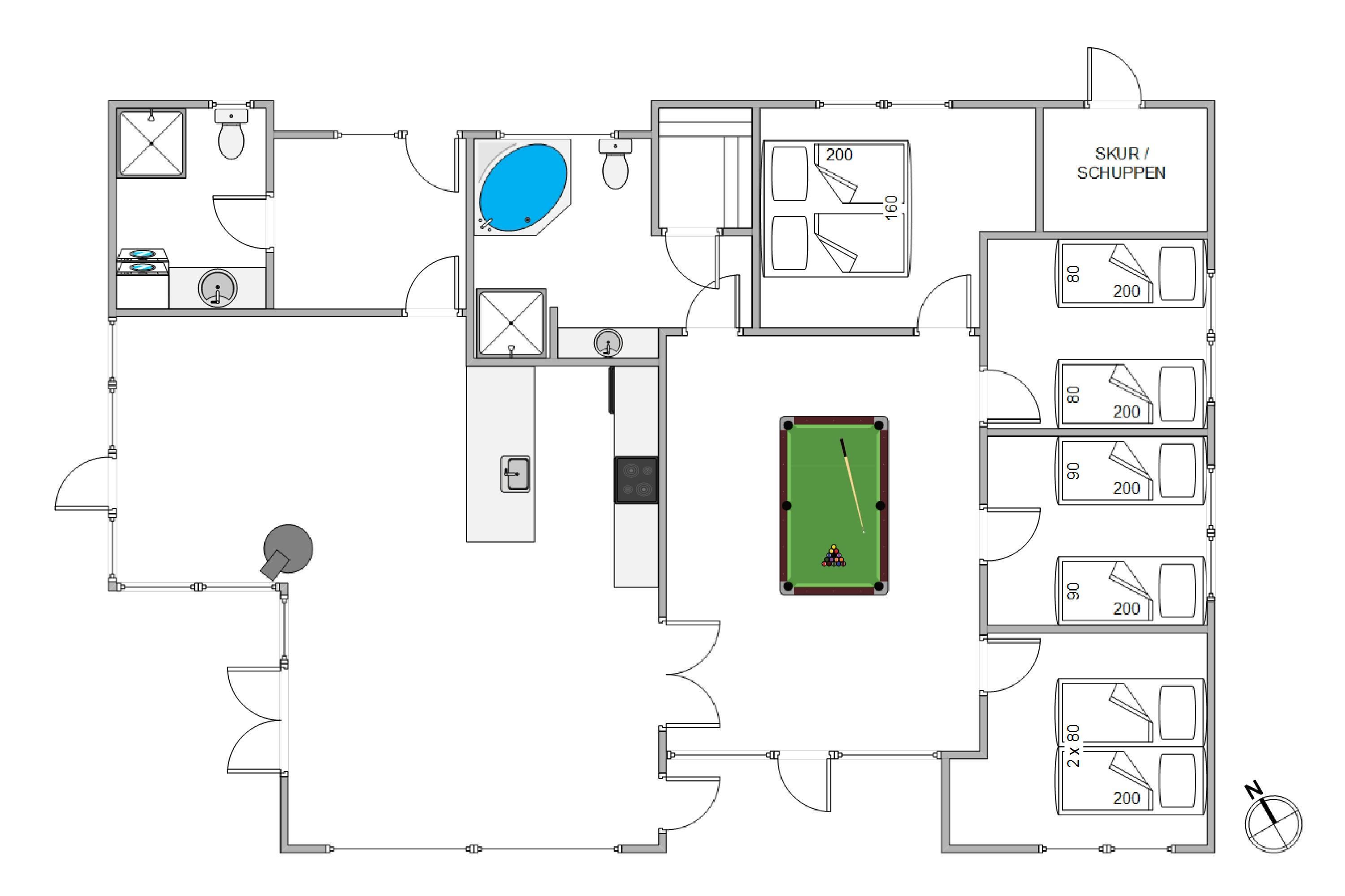 Feriehuset byder på både afslapning og underholdning. Det største af husets to badeværelser er udstyret med spabad, og herfra er der også indgang til saunaen. Det er altså en lille wellness-krog i sig selv, hvor I kan tanke nye kræfter og nyde feriefreden i fulde drag. Underholdningen kommer i centrum i aktivitetsrummet, der er indrettet med billardbord.