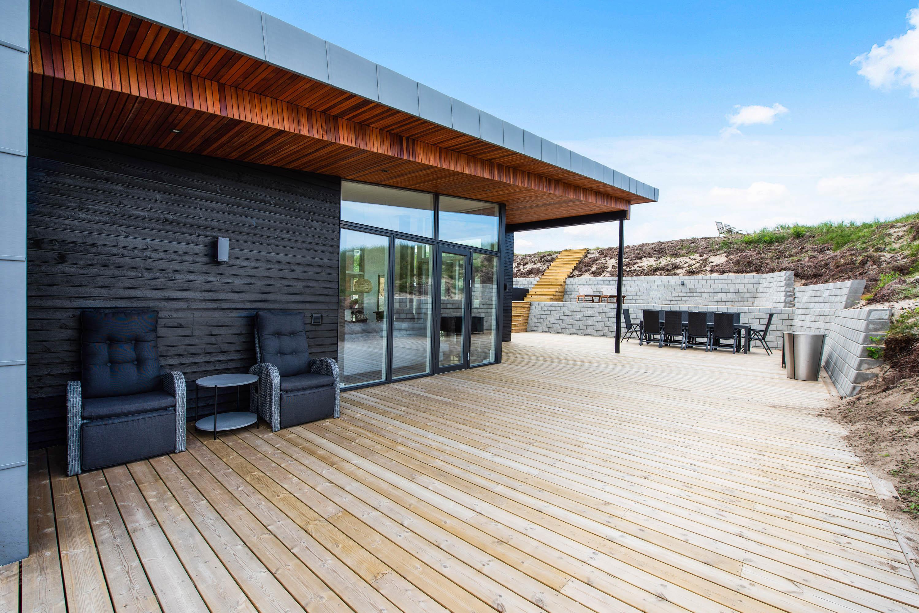 Rundt om feriehuset finder I flere gode siddekroge, blandt andet to overdækkede terrasser mod vest og syd. Her finder I både lækre loungemøbler og et udendørs spabad. På de dejlige sommerdage finder alle feriegæster uden problemer en plads i solen, og overdækningen gør det muligt at tilberede gode måltider på grillen i al slags vejr.