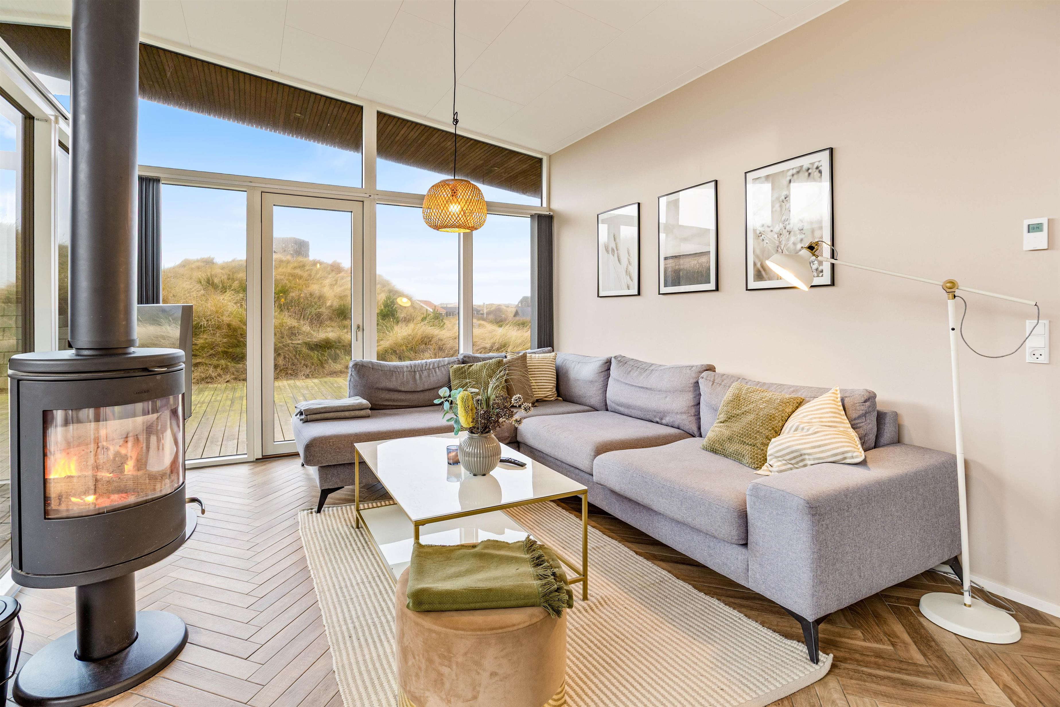 Moderne, stilfuldt og indbydende er tre ord, der meget præcist indfanger omgivelserne på Klitdalen 35. Sommerhuset er opført i 2020, og de 130 kvadratmeter er virkelig lækkert indrettet i lyse farver, med masser af vinduer og flot interiør. Det er nemt at se, at der er lagt stor vægt på, at I skal føle jer godt tilpas på jeres nye ferieadresse.