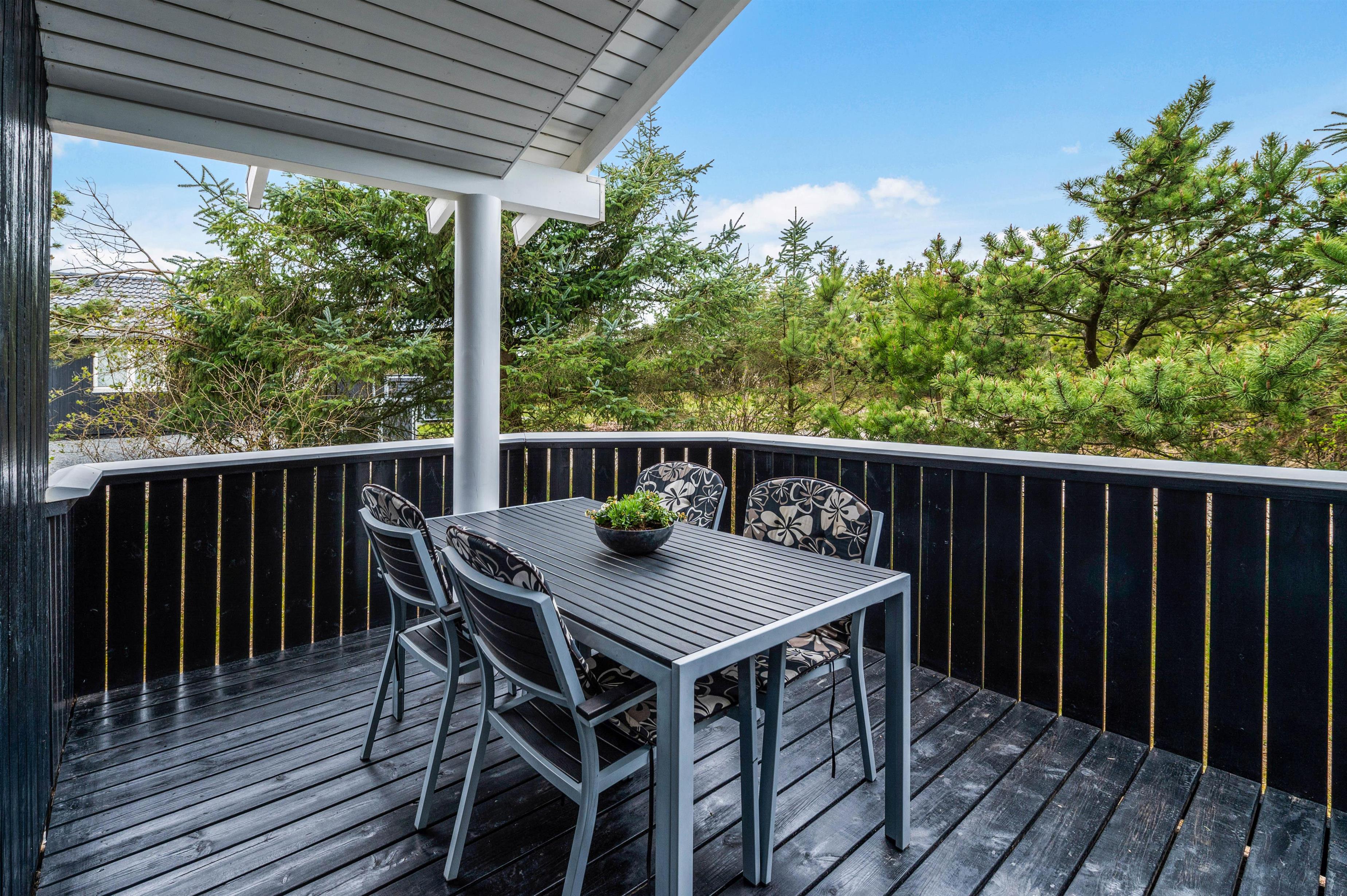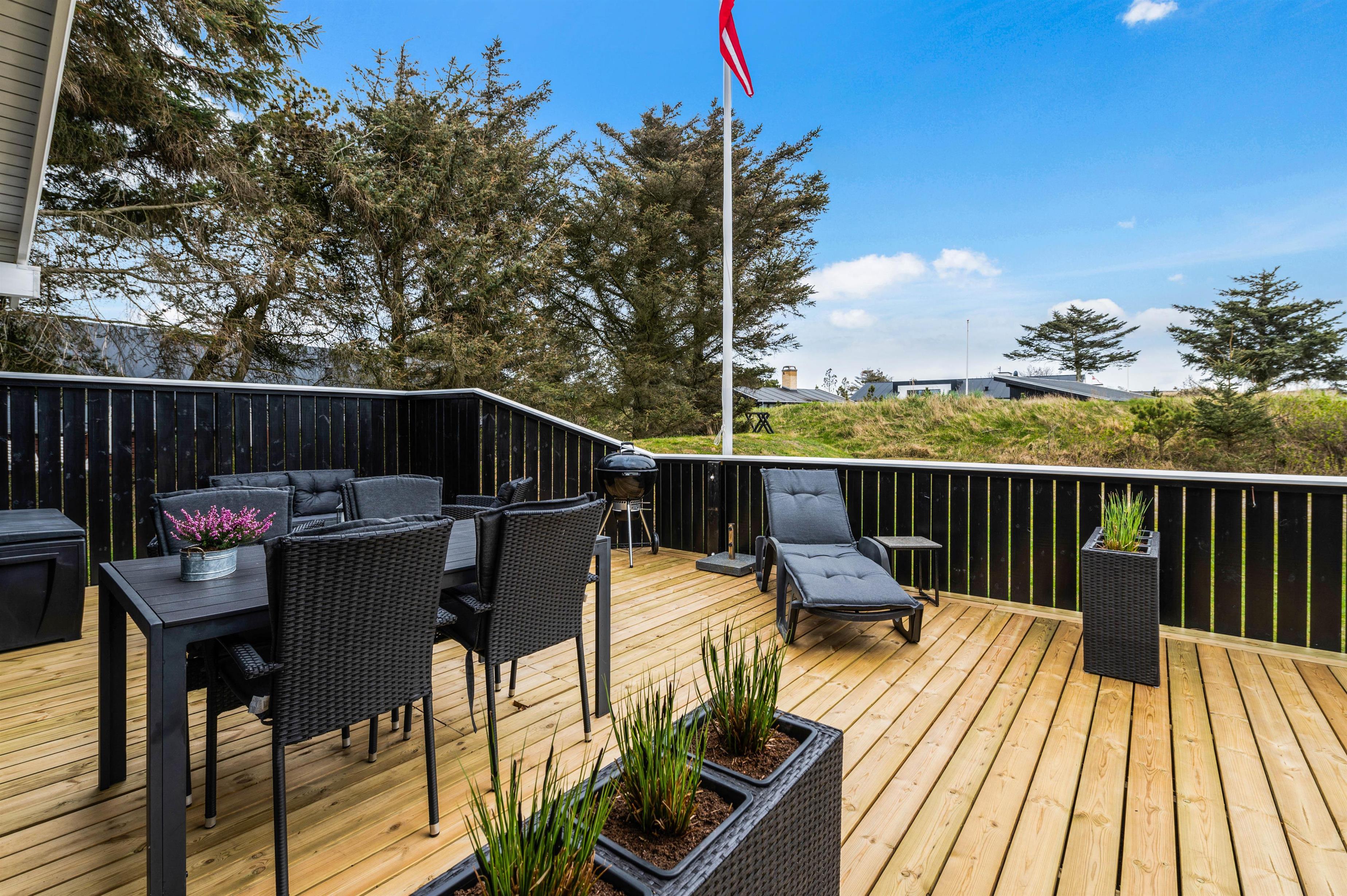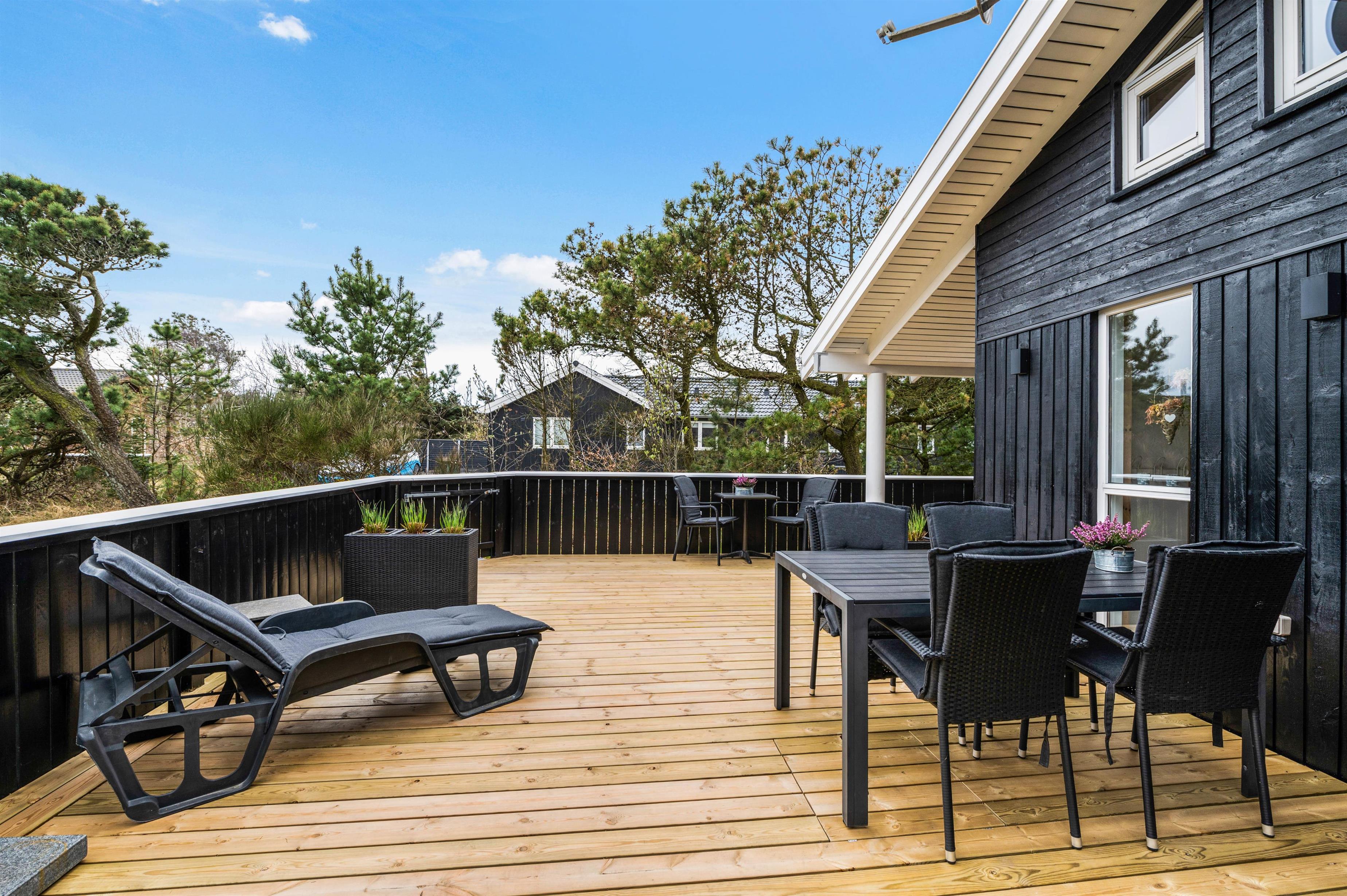 Huset har to dejlige lukkede terrasser, så der er rig mulighed for at tilbringe hele dagen i solen og den friske luft. Den ene terrasse er placeret i den østlige ende af huset, så her kan man nyde både morgenmaden og frokosten i det fri. Den anden terrasse ligger vest for huset og er delvist overdækket. Denne er helt ideel til hyggelige grillaftener med Vesterhavets brusen i baggrunden.