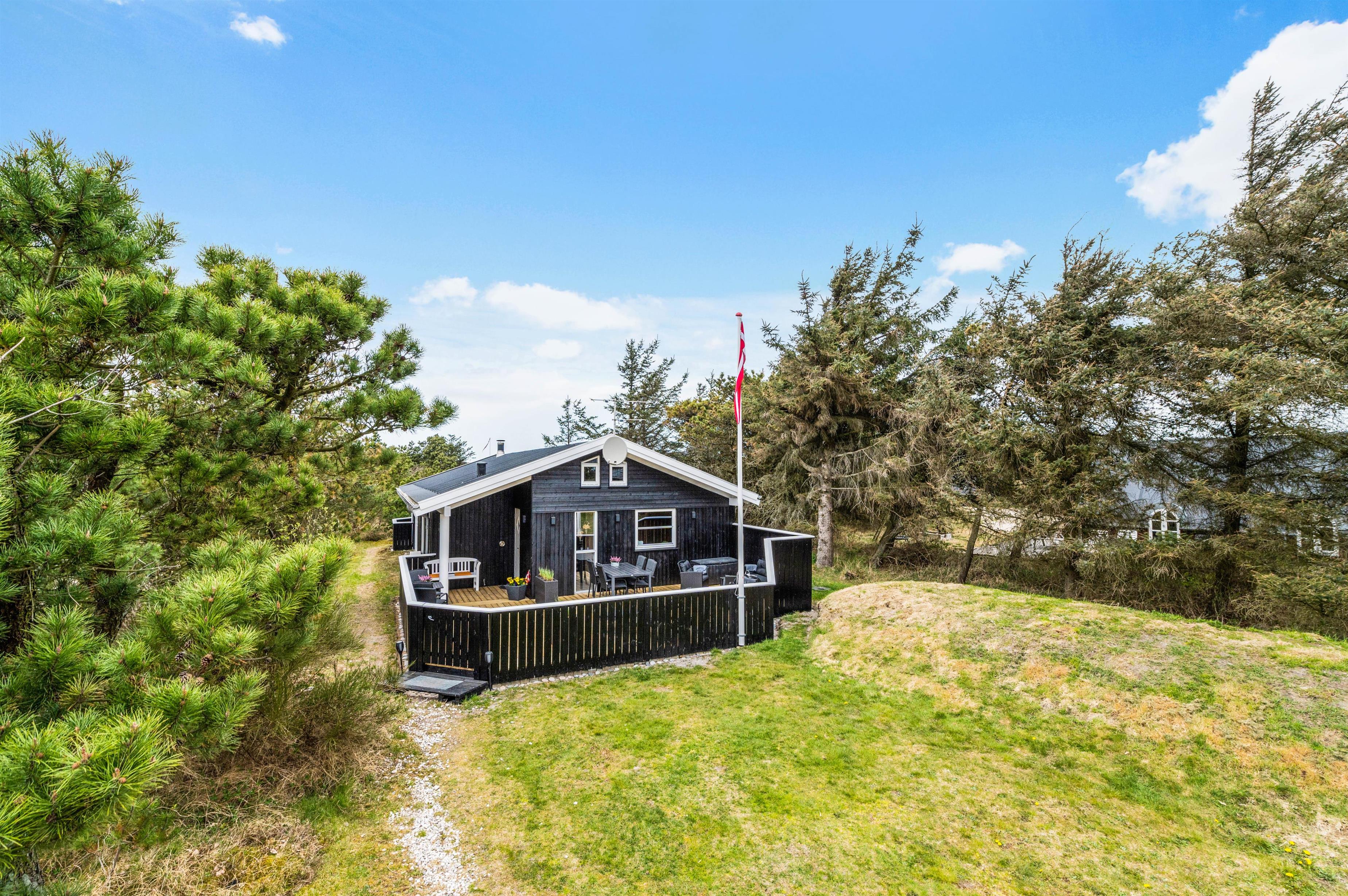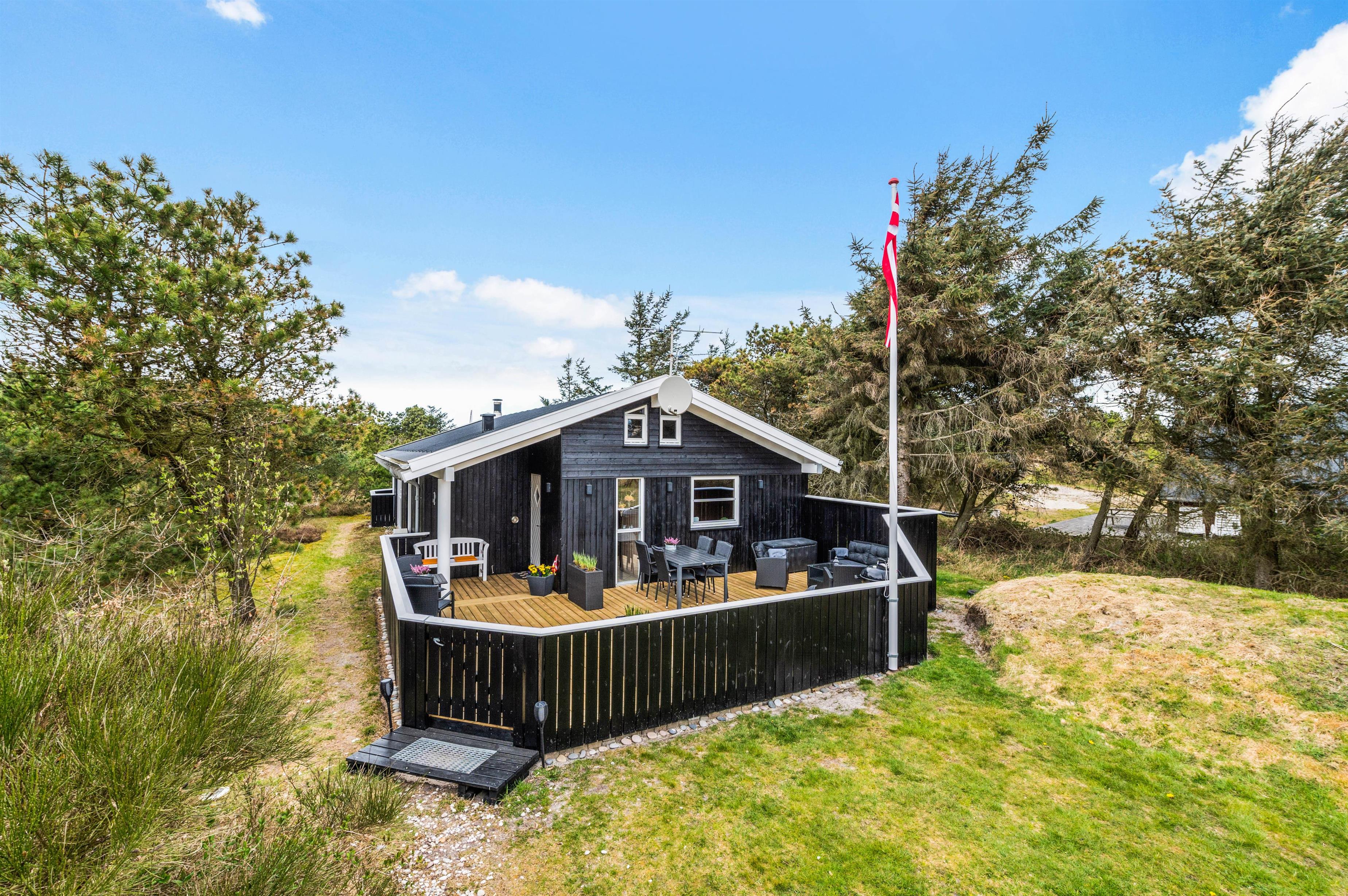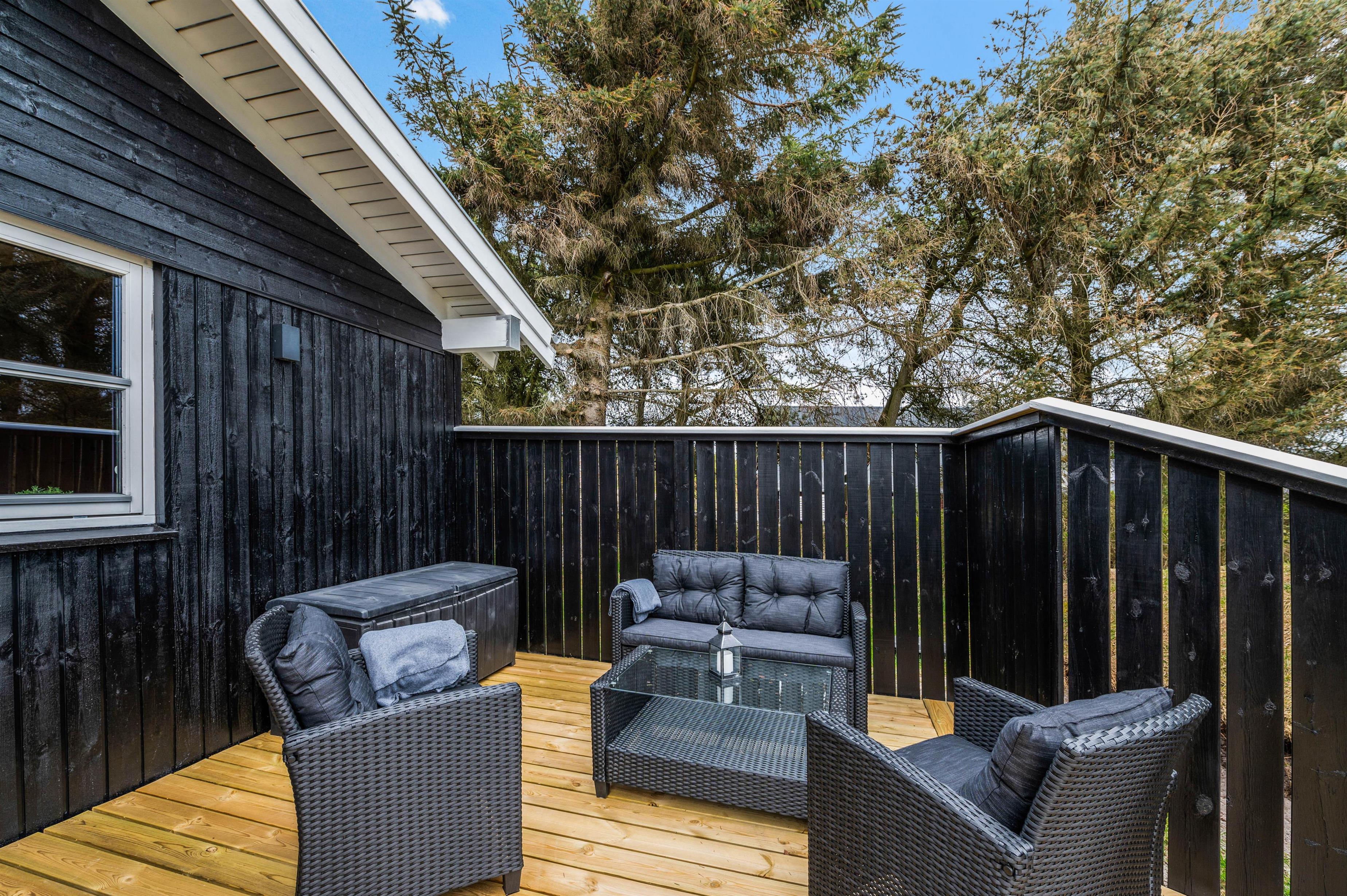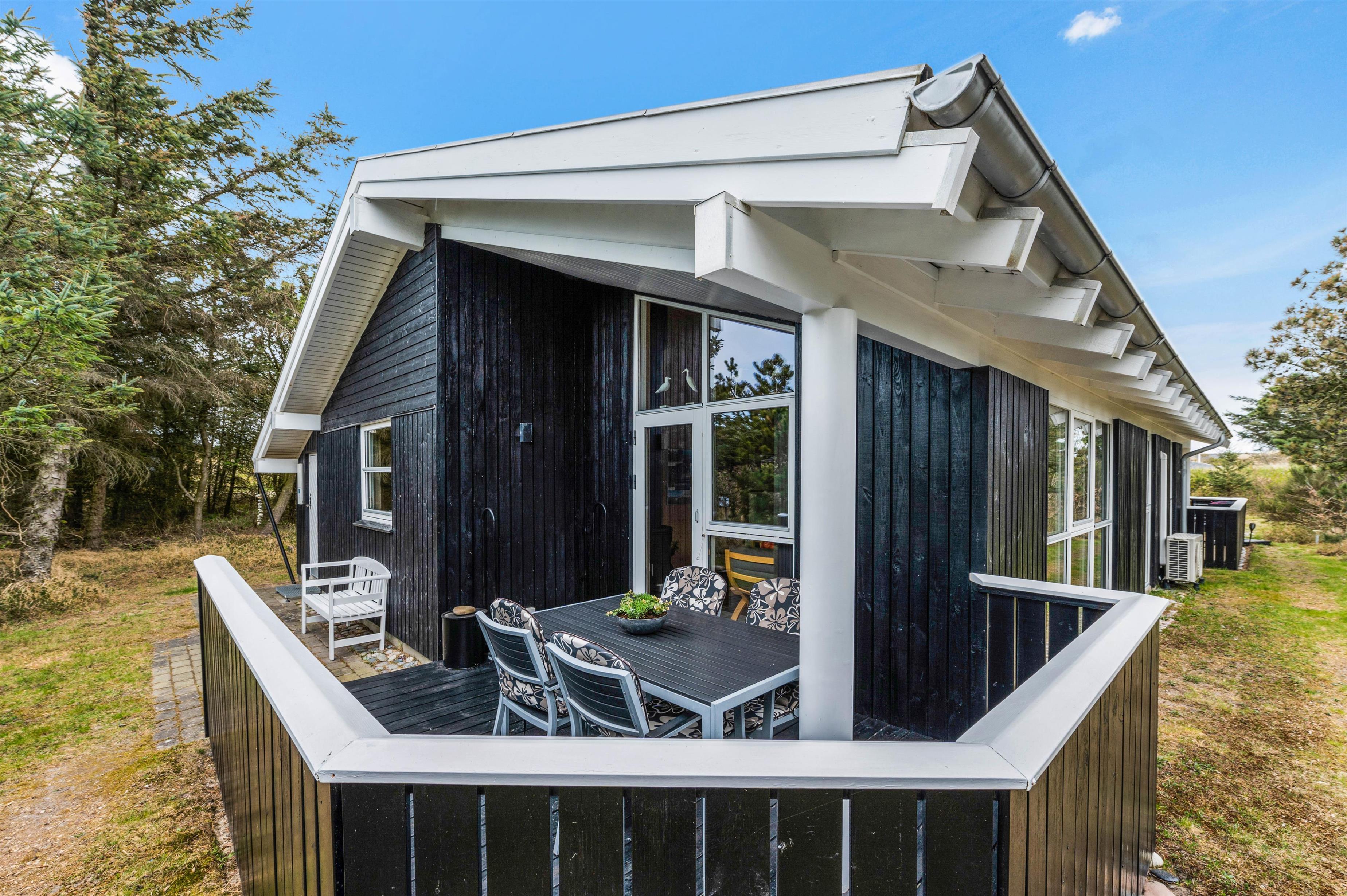 Huset har to dejlige lukkede terrasser, så der er rig mulighed for at tilbringe hele dagen i solen og den friske luft. Den ene terrasse er placeret i den østlige ende af huset, så her kan man nyde både morgenmaden og frokosten i det fri. Den anden terrasse ligger vest for huset og er delvist overdækket. Denne er helt ideel til hyggelige grillaftener med Vesterhavets brusen i baggrunden.