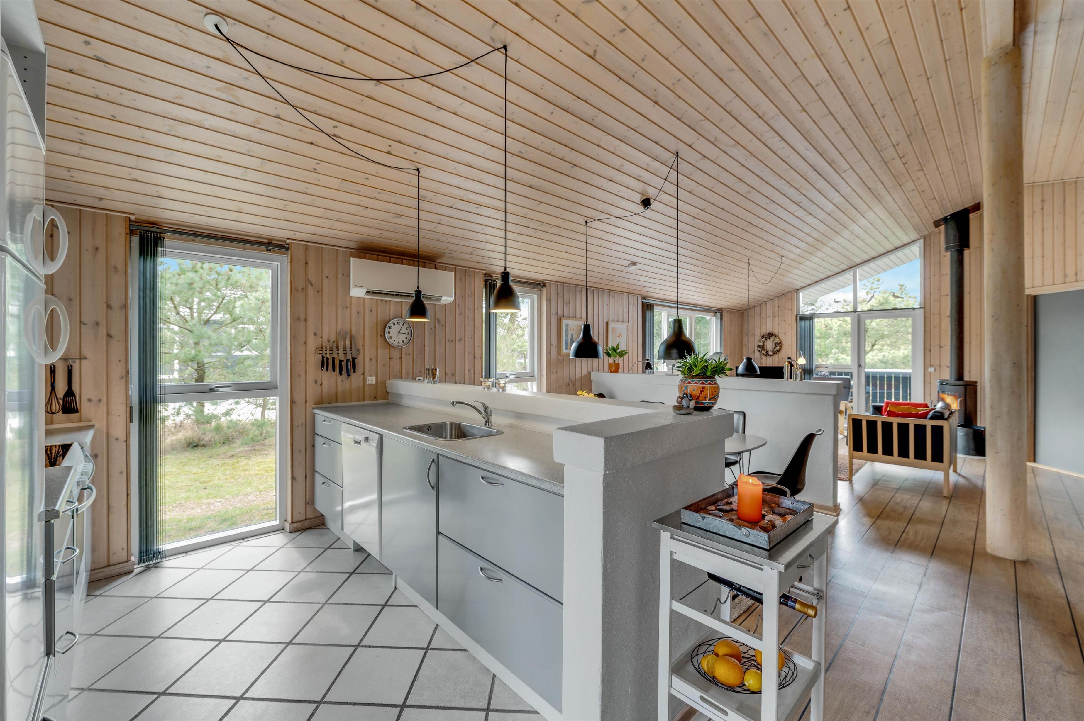 Brændovnen der både kan nydes fra stuen og køkkenet, sørger for en dejlig varme og hyggelig atmosfære i huset. Så hvorfor ikke sætte sig godt tilrette efter en dejlig dag ved Vesterhavet og nyde en god bog eller et spil med børnene mens brændeovnen knitrer? Hvis I kommer til huset med mindre børn, vil de helt sikkert nyde husets hems hvor børn kan lege helt uforstyrret og bygge hule.