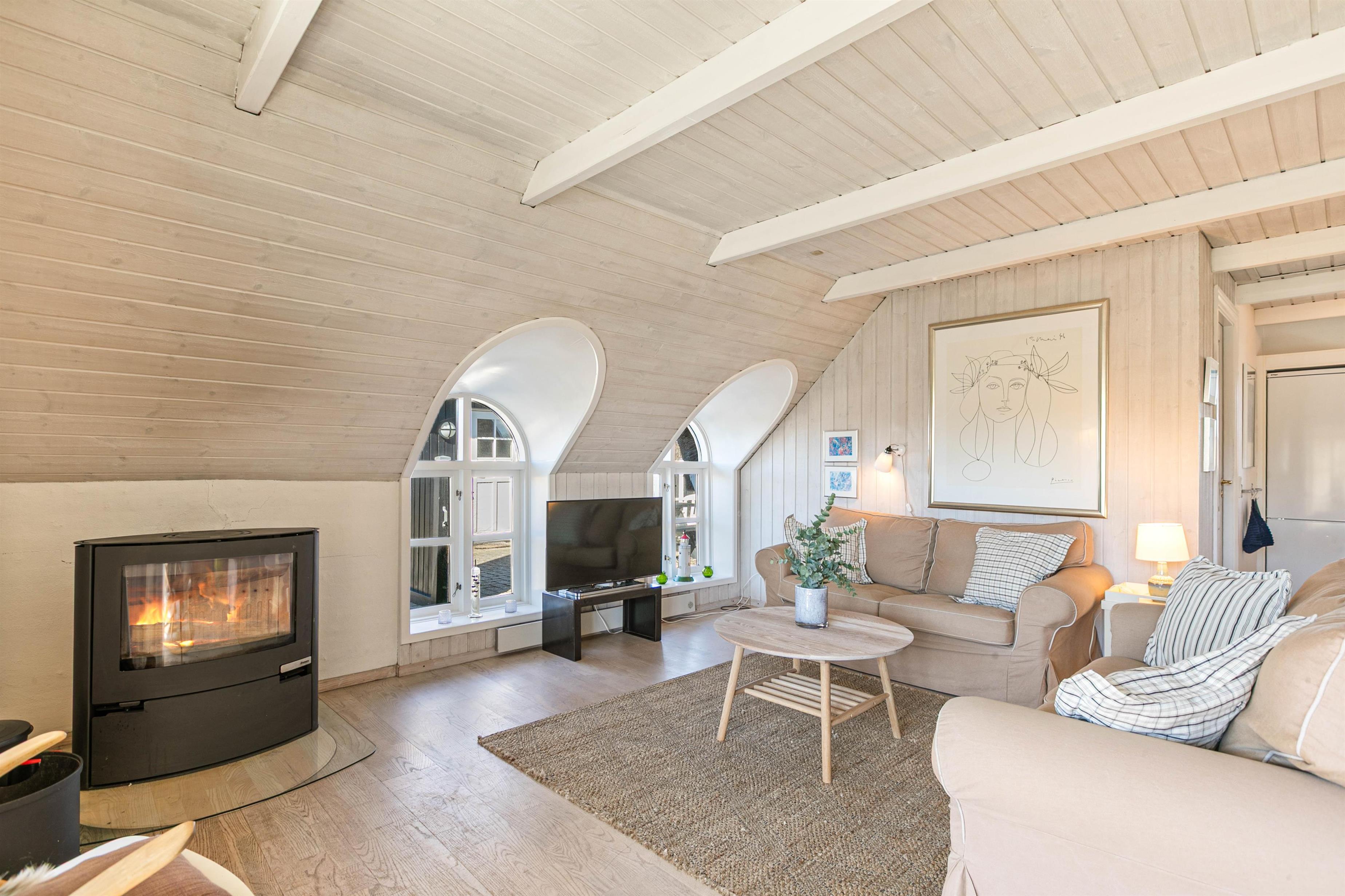 Det stråtækte sommerhus på Sneppedalen 35 kan huse op til 8 personer. Det store åbne opholdsrum er der hvor I både finder køkken, spisestue og selve stuen, og de er alle indrettet med henblik på, at I skal kunne hygge jer og slappe af. Stuen er med hyggelige sofaer og fra sofahjørnet kan I se alle jeres yndlingsfilm på sommerhusets store fladskærmstv som er udstyret med en chromecast. Flammerne i brændeovnen kan også give jer en behagelig og endnu mere hyggelig stemning i sommerhuset. Det åbne køkken og spisestue sørger for, at alle kan hygge sig og snakke sammen, også under madlavningen og mens opvaskemaskinen fyldes efter maden.