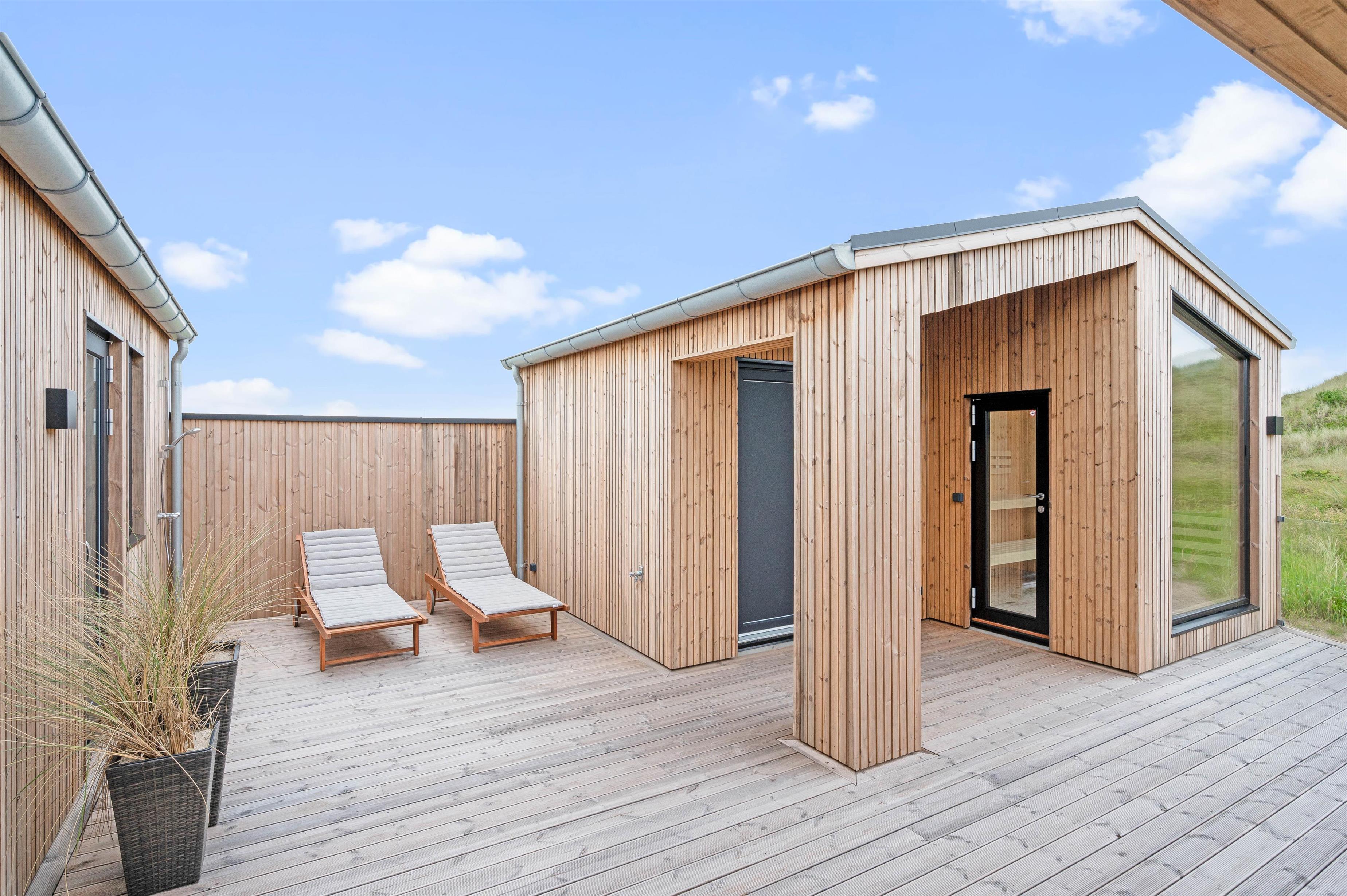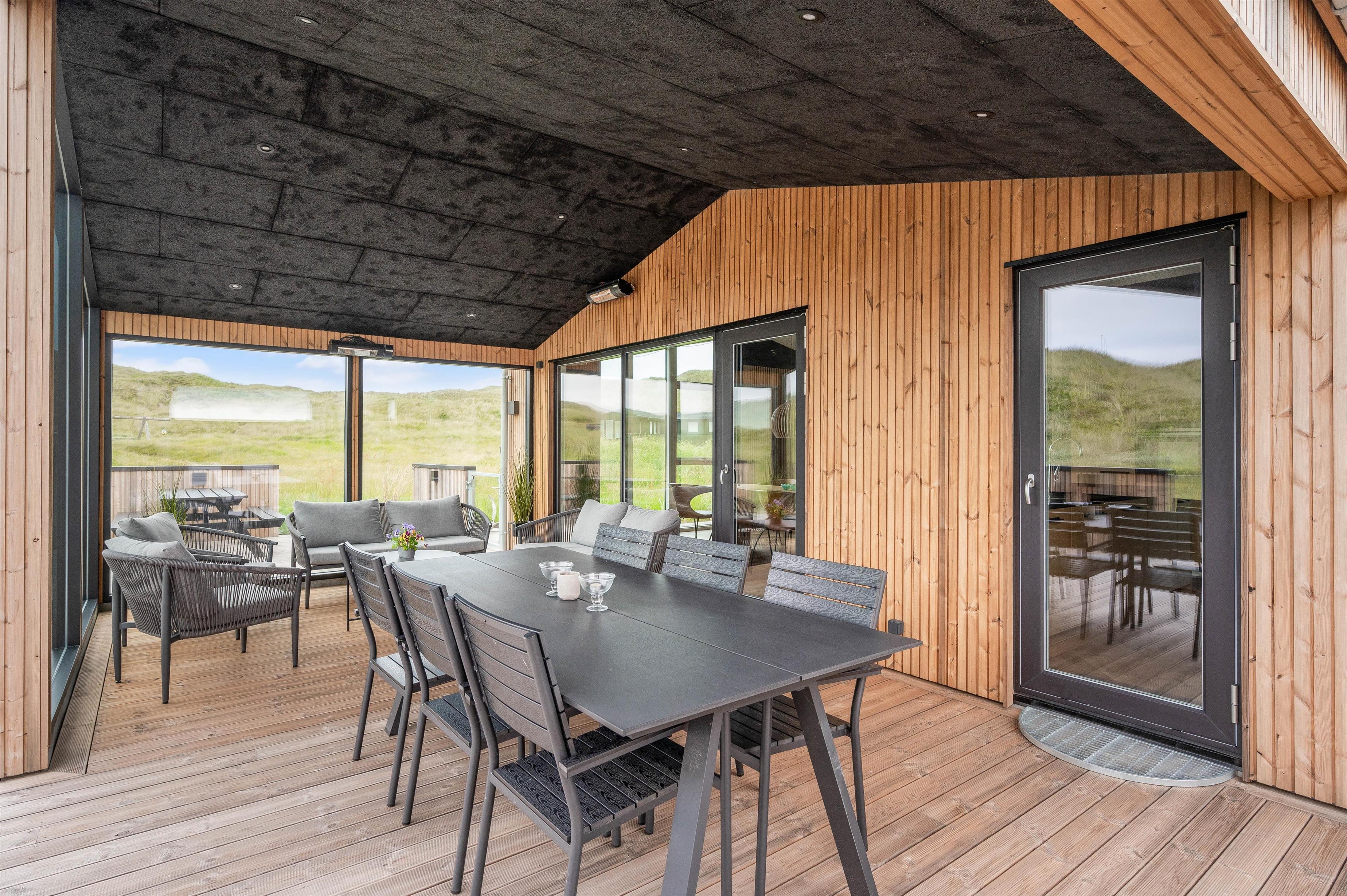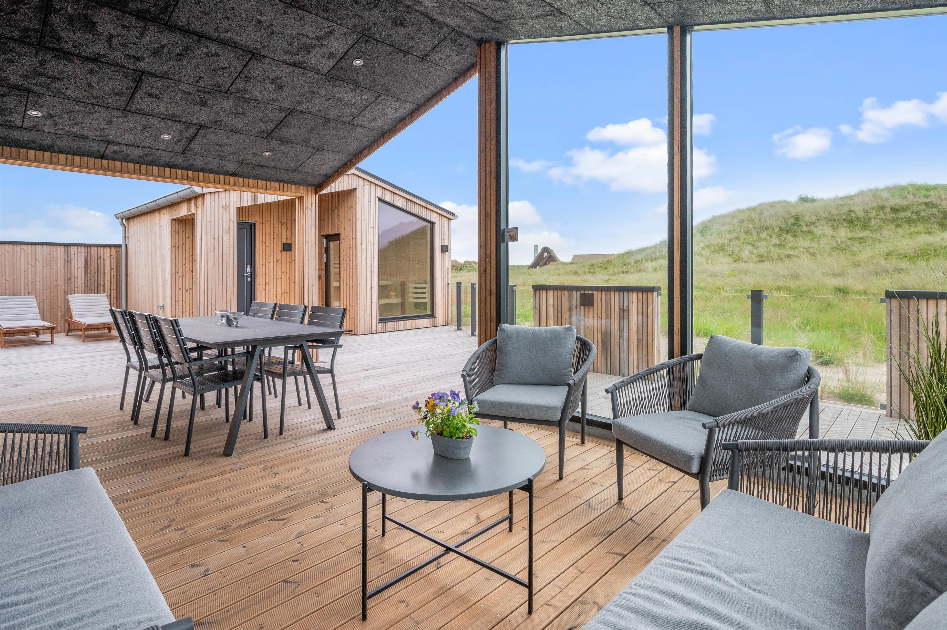 Fra opholdsstuen er der udgang til terrassen udenfor. Her finder I både havemøbler og grill til fri afbenyttelse, så I kan tilberede et dejligt måltid mad ude på terrassen mens I nyder solen. Efter I har gået en lang gåtur ved stranden, kan I skylle fødderne af under udebruseren eller blot blive kølet ned efter en lang, solrig sommerdag. Udebruseren er tilgængelig i perioden april til november.