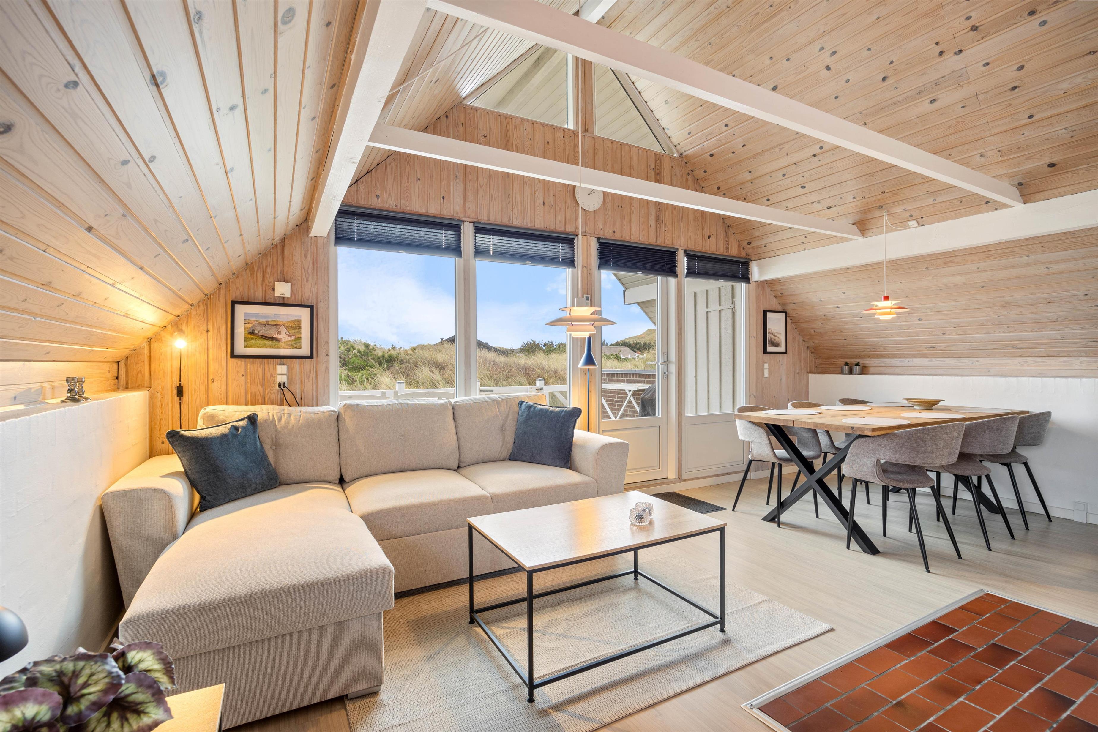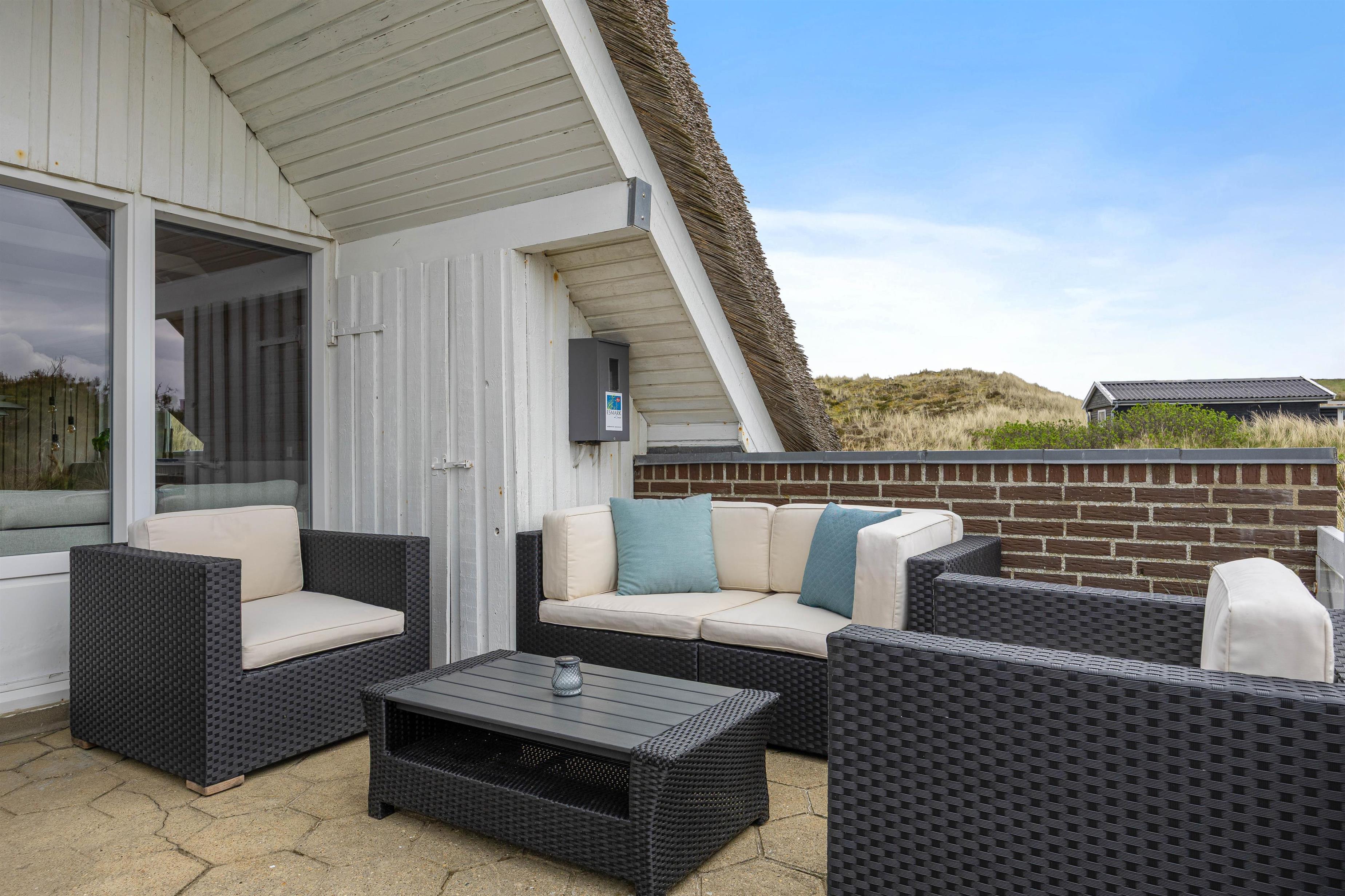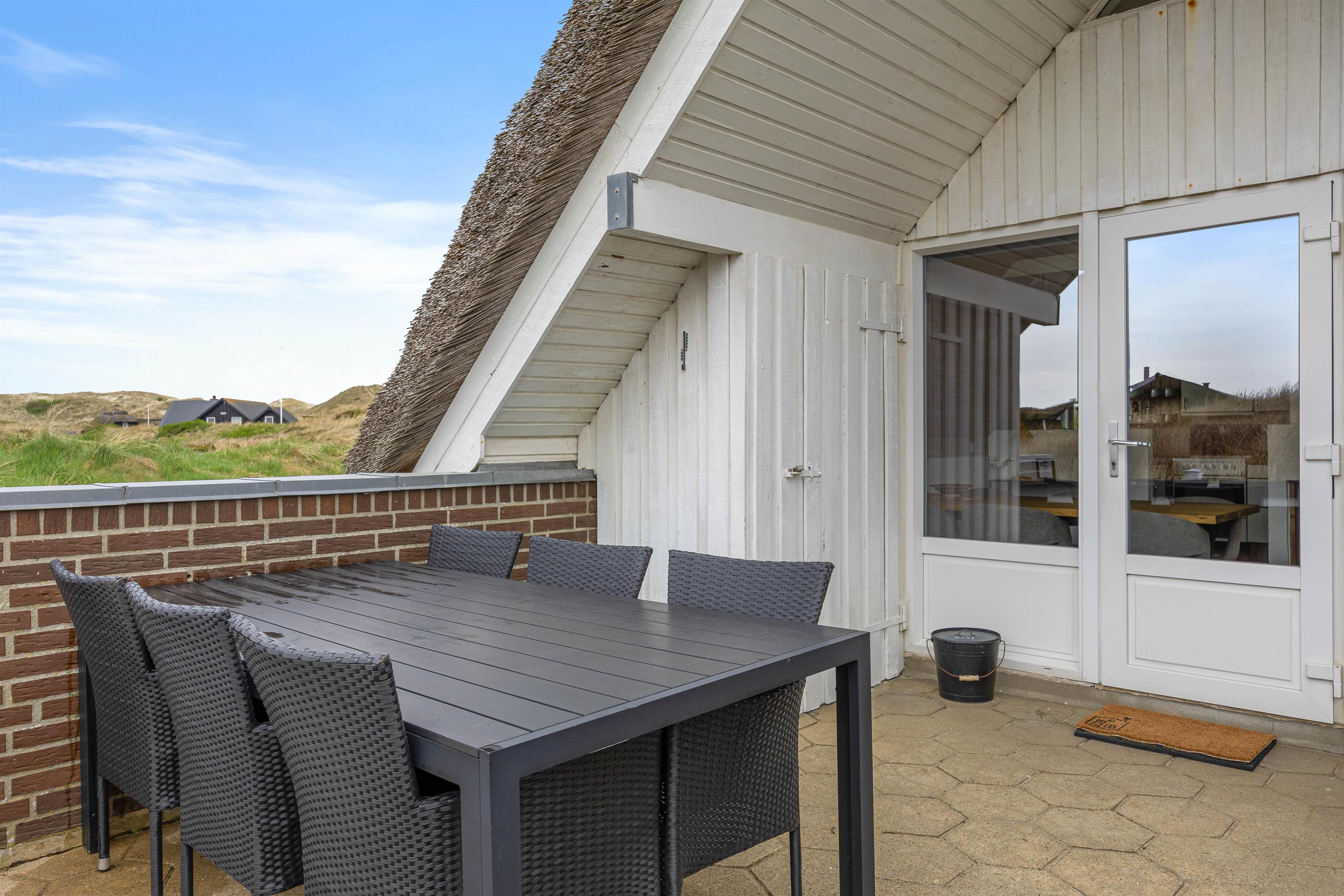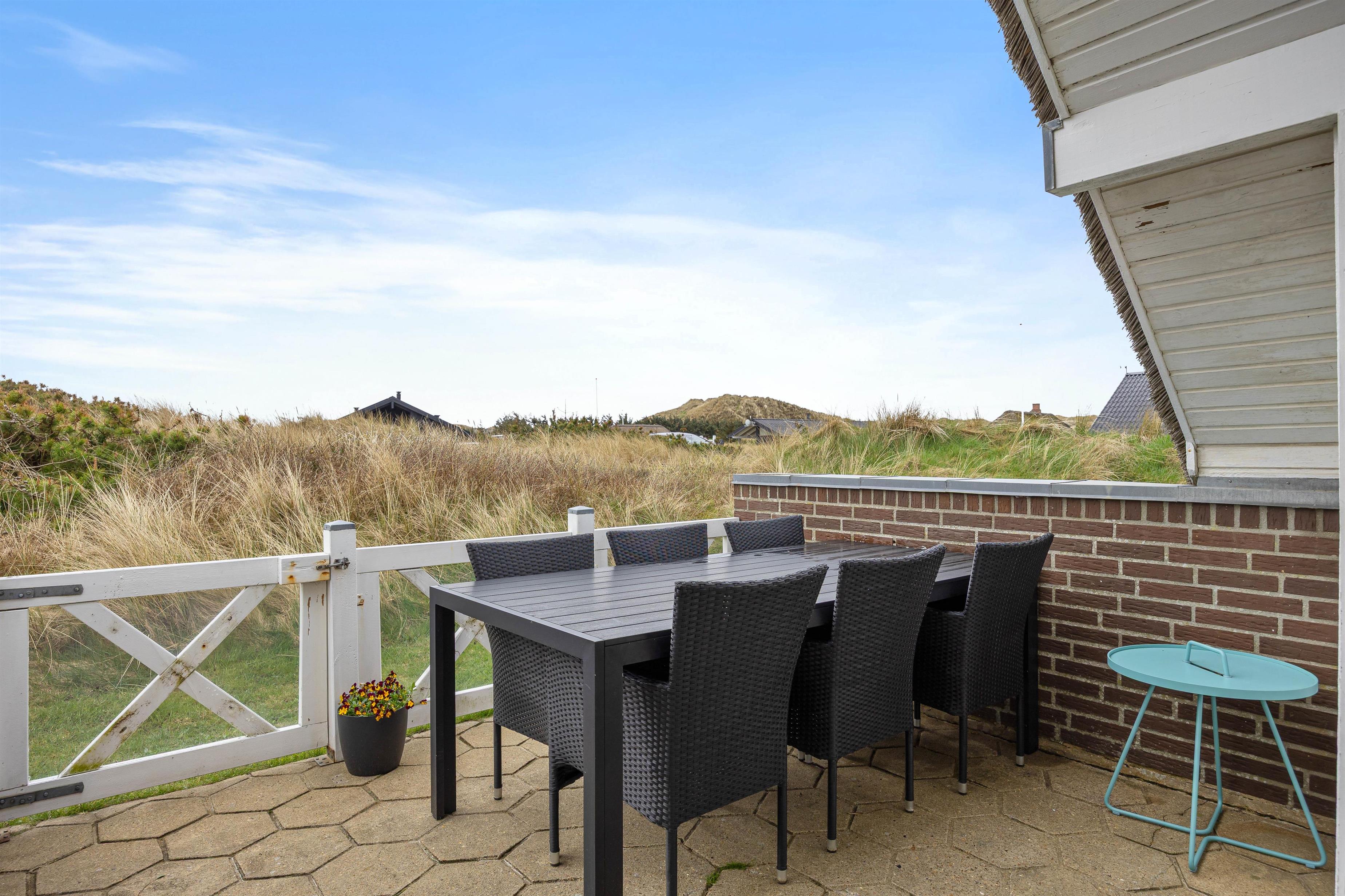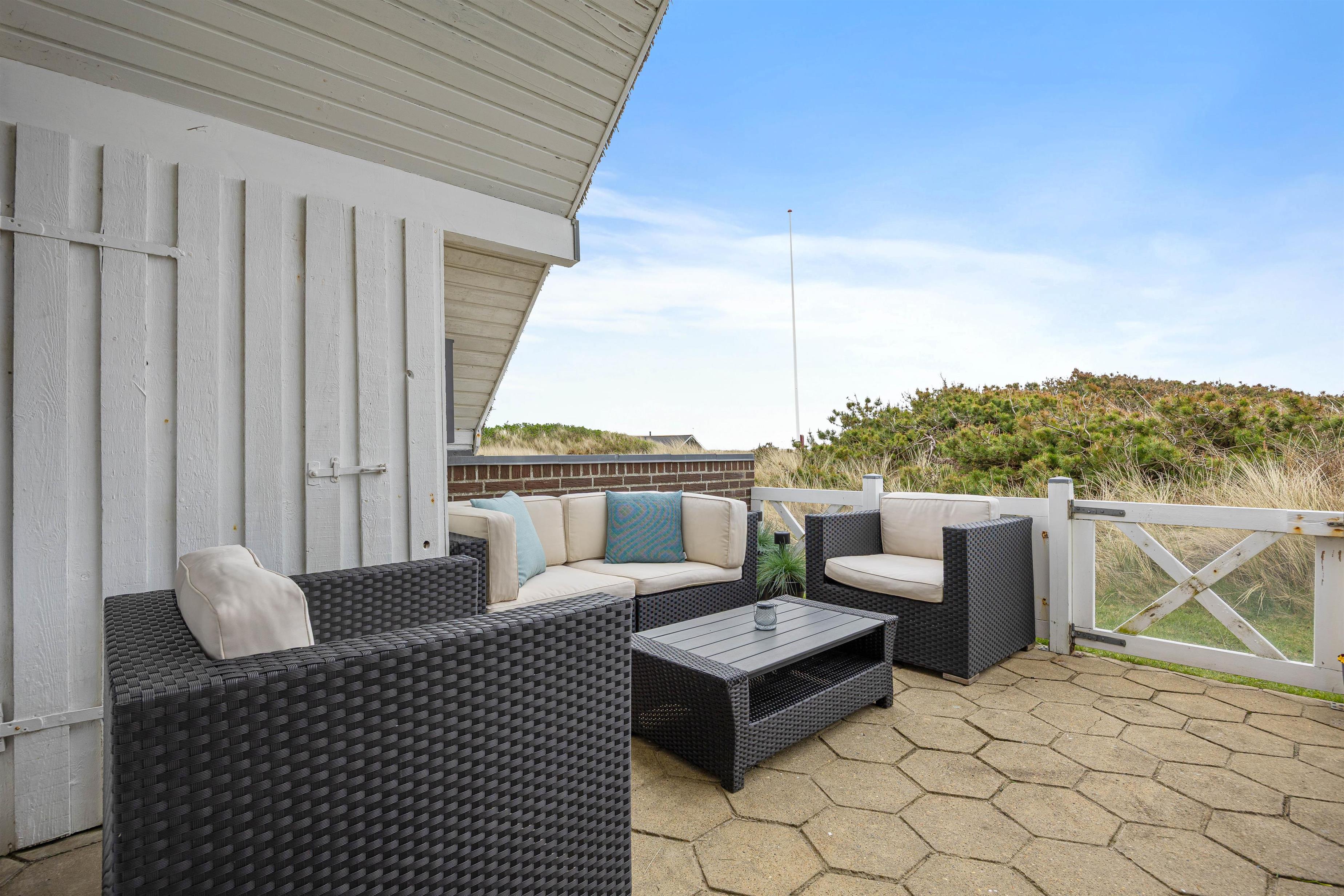Fra både stue og terrasse er der en smuk udsigt, og fra terrassen kan du tydeligt høre bølgerne fra Vesterhavet, som ligger få minutters gang fra sommerhuset. Her er hele 2 gode terrasse, hvor af den ene er lukket. Den lukkede terrasse giver både tryghed og privatliv for familien med mindre børn og en hund, og der er også tilhørende havemøbler/ loungesæt, der gør det muligt for jer at bruge denne terrasse som et ekstra rum, på de dage hvor vejret ellers tillader det. På den anden terasse er der et bord med 4 havestole. Her er også en grill, så I ville også kunne tilberede lækre middage ved hjælp af denne. Den inderste del af terrassen er også overdækket, så hvis det blæser fra den rigtige retning vil I her have godt med læ fra den til tider hårde vestenvind.