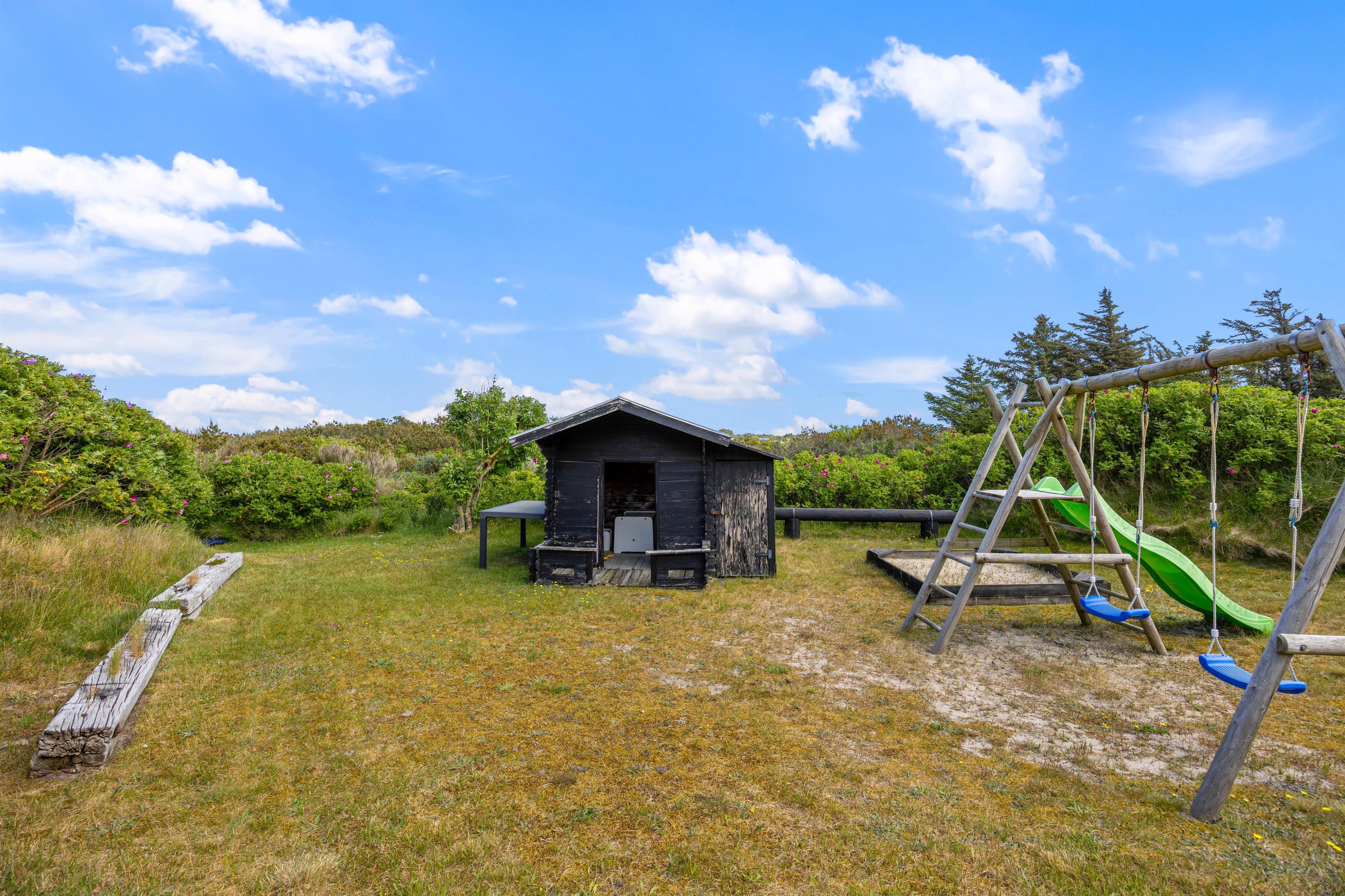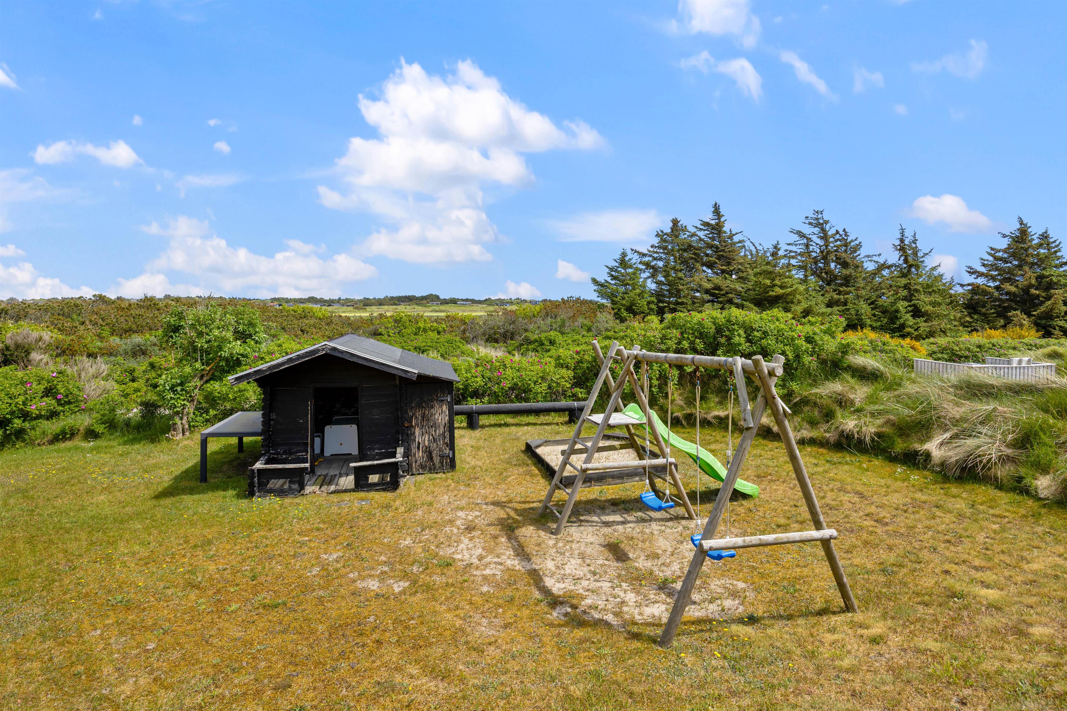 På grunden er der egen legeplads med legehus, gynger og sandkasse, og her kan ungerne boltre sig mens I kan sidde på terrassen og følge med i legen.