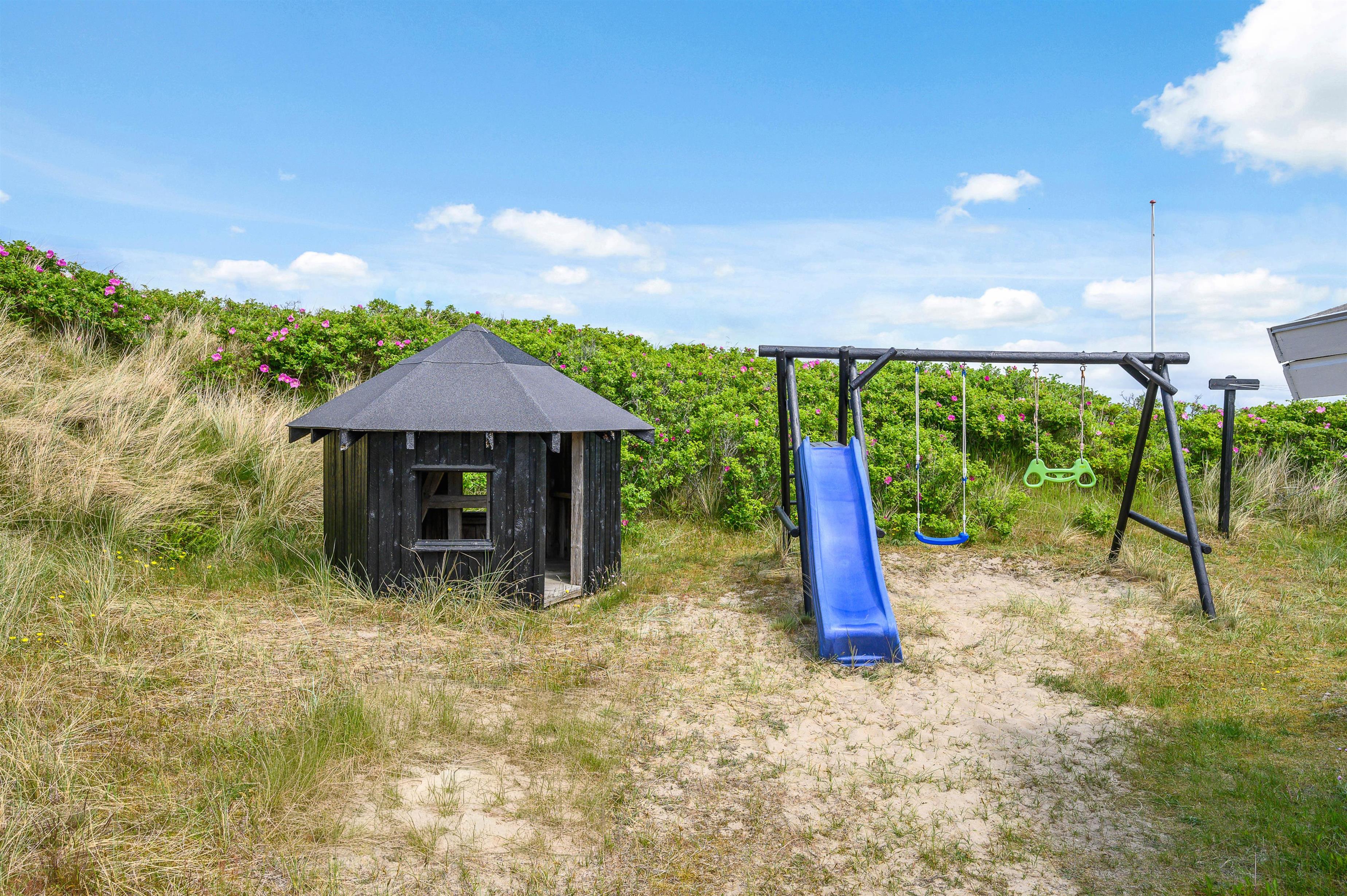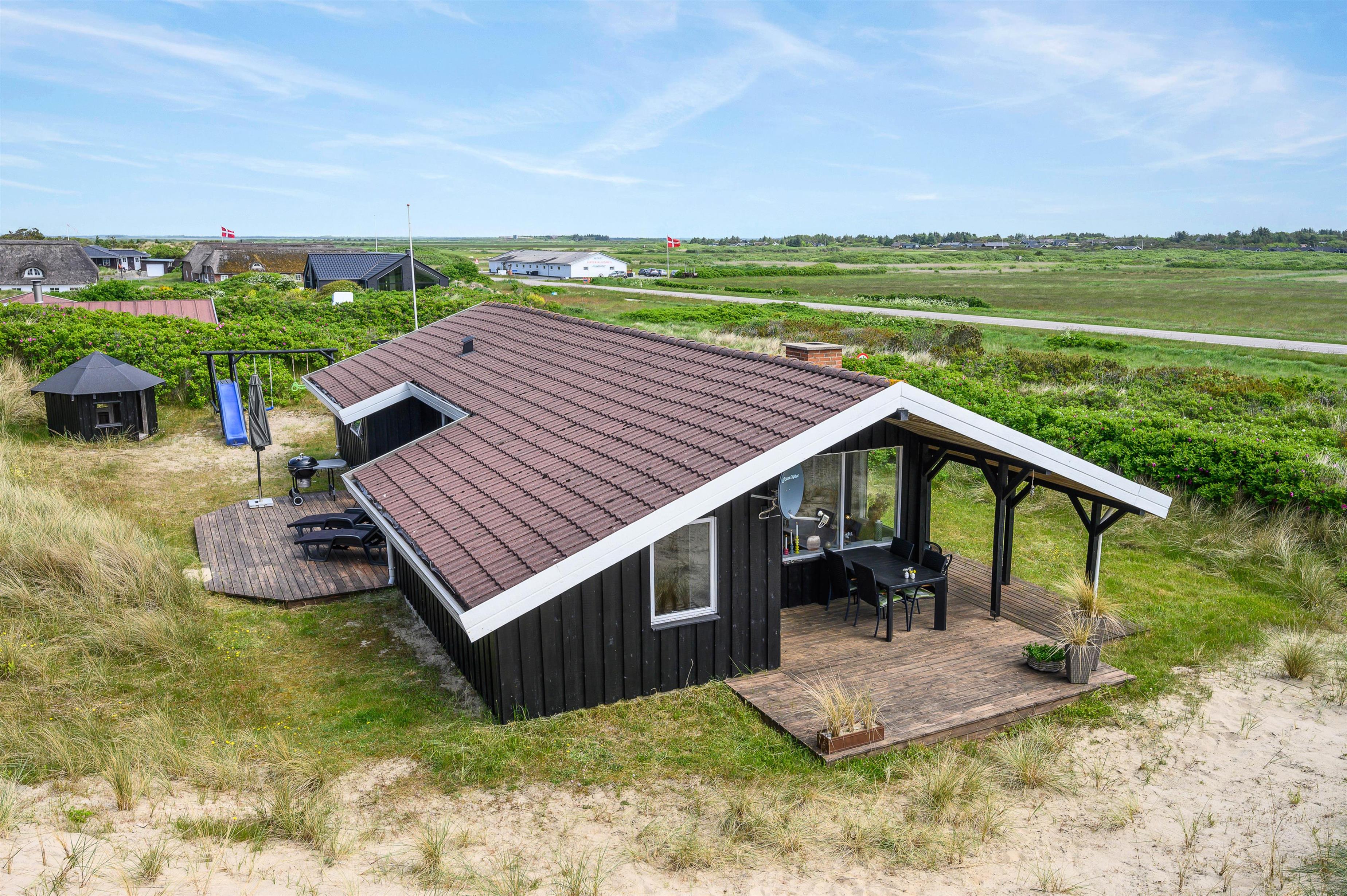 Overdækket terrasse med udsigt til klitlandskab og legeredskaber til børnene
