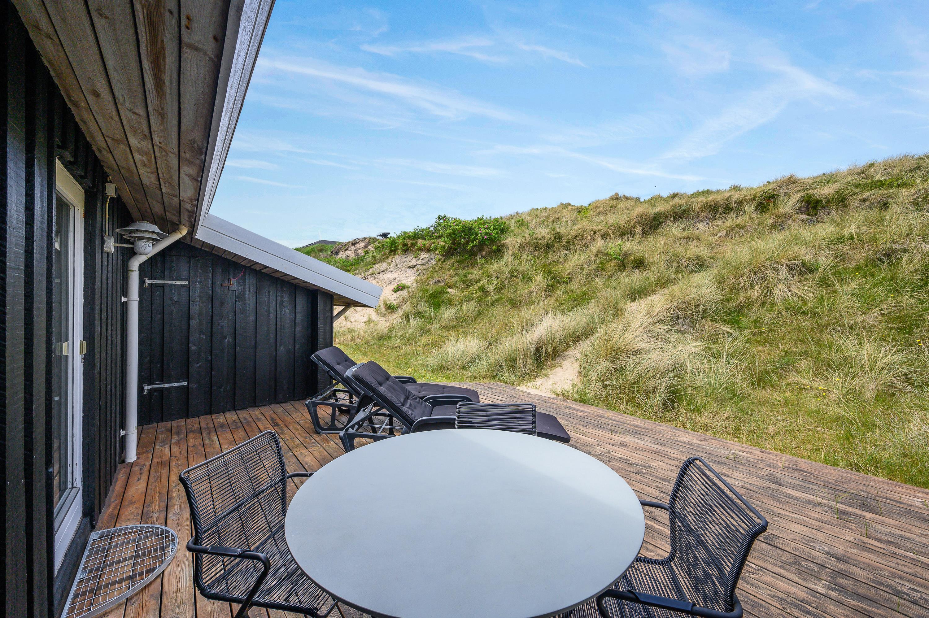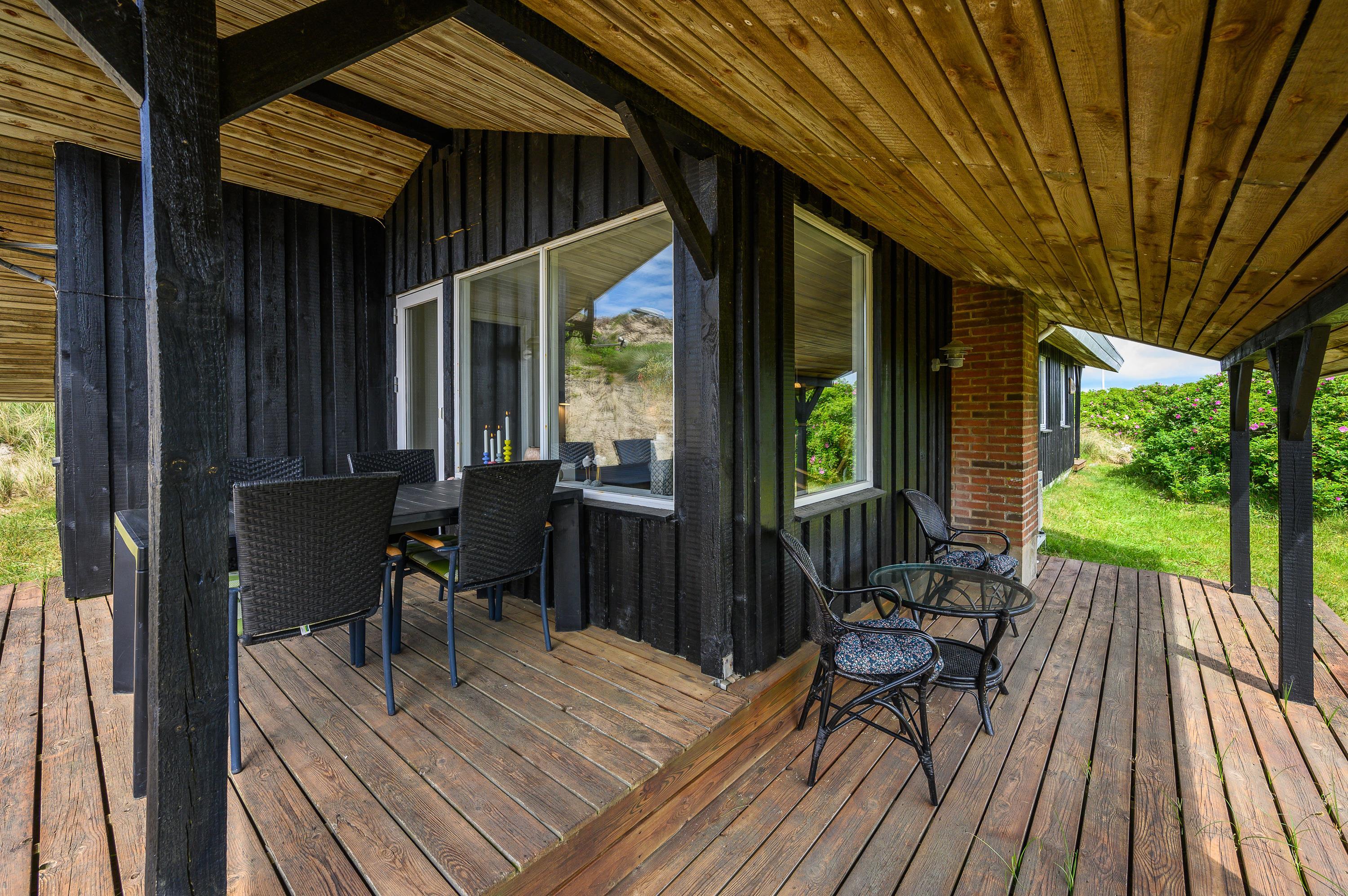 Nyd udelivet på verandaen foran feriehuset eller terrassen bag huset, hvor du har godt udsyn til børnenes legehjørne med både gynge og rutsjebane. Da I både har en terrasse der vender mod sydøst, og en terrasse der vender mod vest, kan I uden de store problemer nyde solens stråler, uanset om det er om morgensolen eller aftensolen. Den overdækkede terrasse sikrer også, at I både kan nyde udelivet hvis det småregner lidt, eller hvis I ønsker at sidde i læ for solen