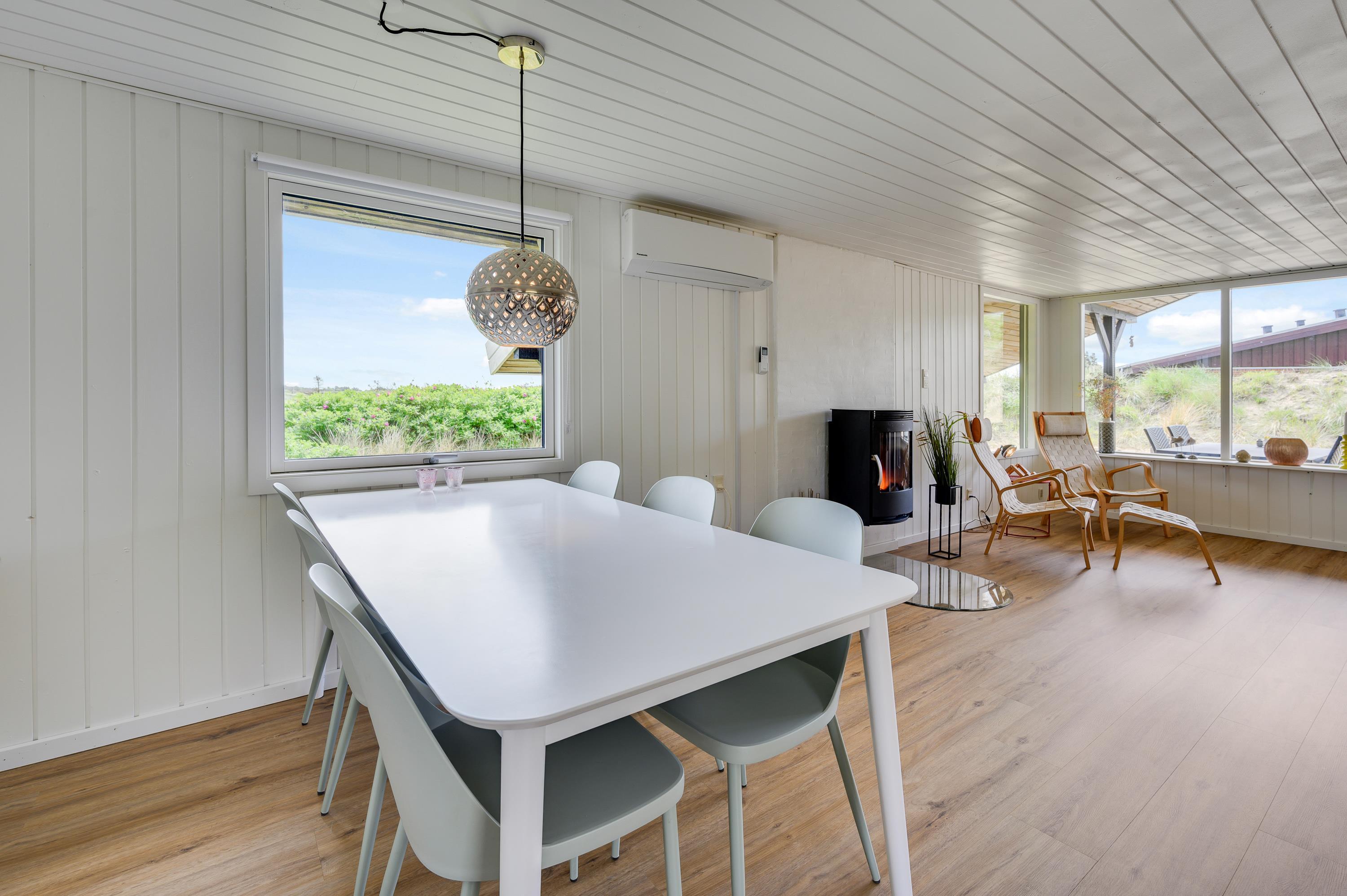 Her er der lagt op til rigtig kæreste- eller familiehygge. Det renoverede køkken er veludstyret, flot og utroligt velhold, og uanset om middagen står på pandekager eller den helt stor menu, så er det perfekt at samles ved det store spisebord. Her er der efter maden også god plads til samvær med spil og snak, imens opvaskemaskinen klarer oprydningen for jer. Skal det være ekstra varmt og hyggeligt, kan I desuden tænde op i sommerhusets brændeovn.