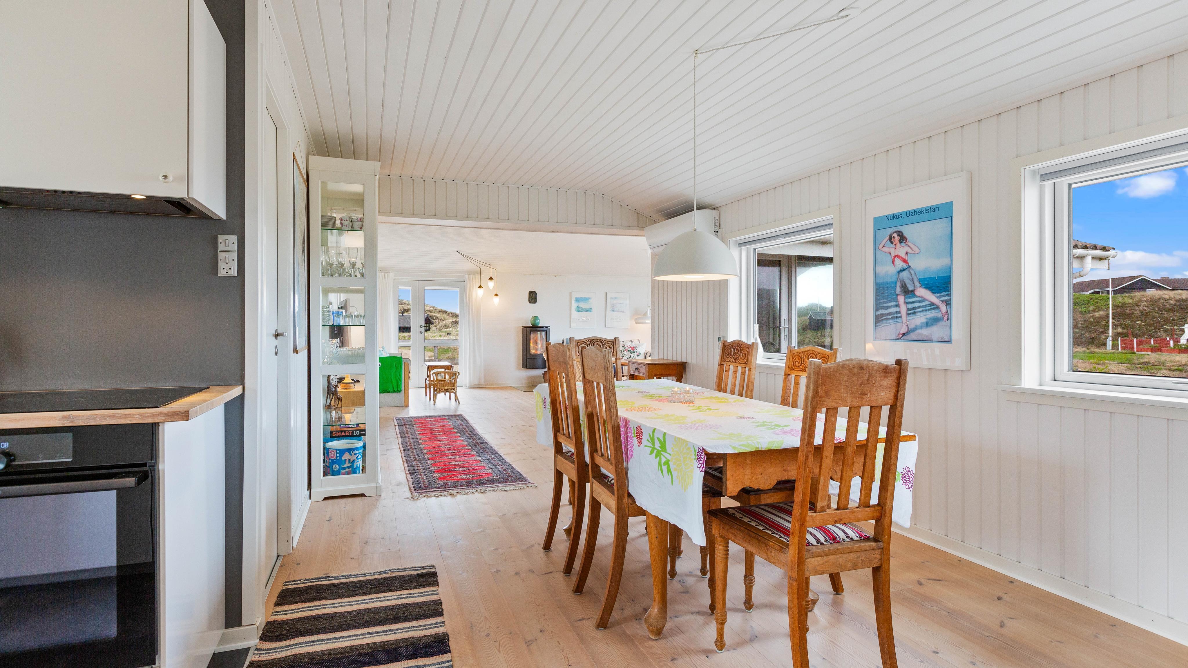 Når I træder ind i feriehuset, bliver I mødt af et stort opholdsrum, der forbinder køkken, stue og spiseplads. Stuen vil helt sikkert blive omdrejningspunktet for jeres ferieaktiviteter, uanset om I laver mad sammen, har sjove spilleaftener eller hygger jer i sofaen med jeres yndlingsserie. Alle kan finde noget, de kan lide her. På kolde og regnfulde dage kan I sidde foran brændeovnen med en god bog og en varm kop te og lytte til ildens knitren. Den energibesparende luft-til-luft varmepumpe i feriehuset sikrer en konstant og behagelig varme.