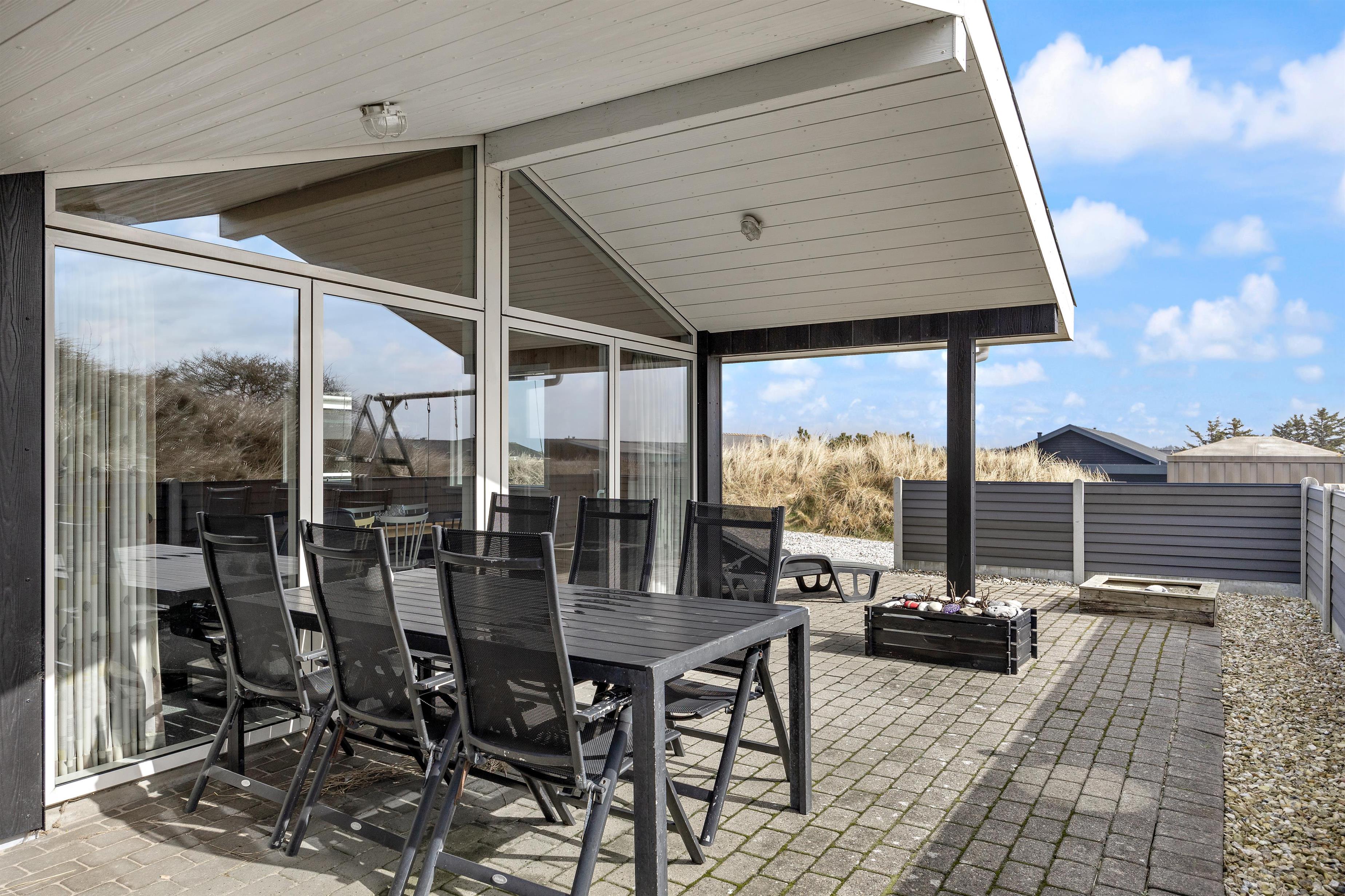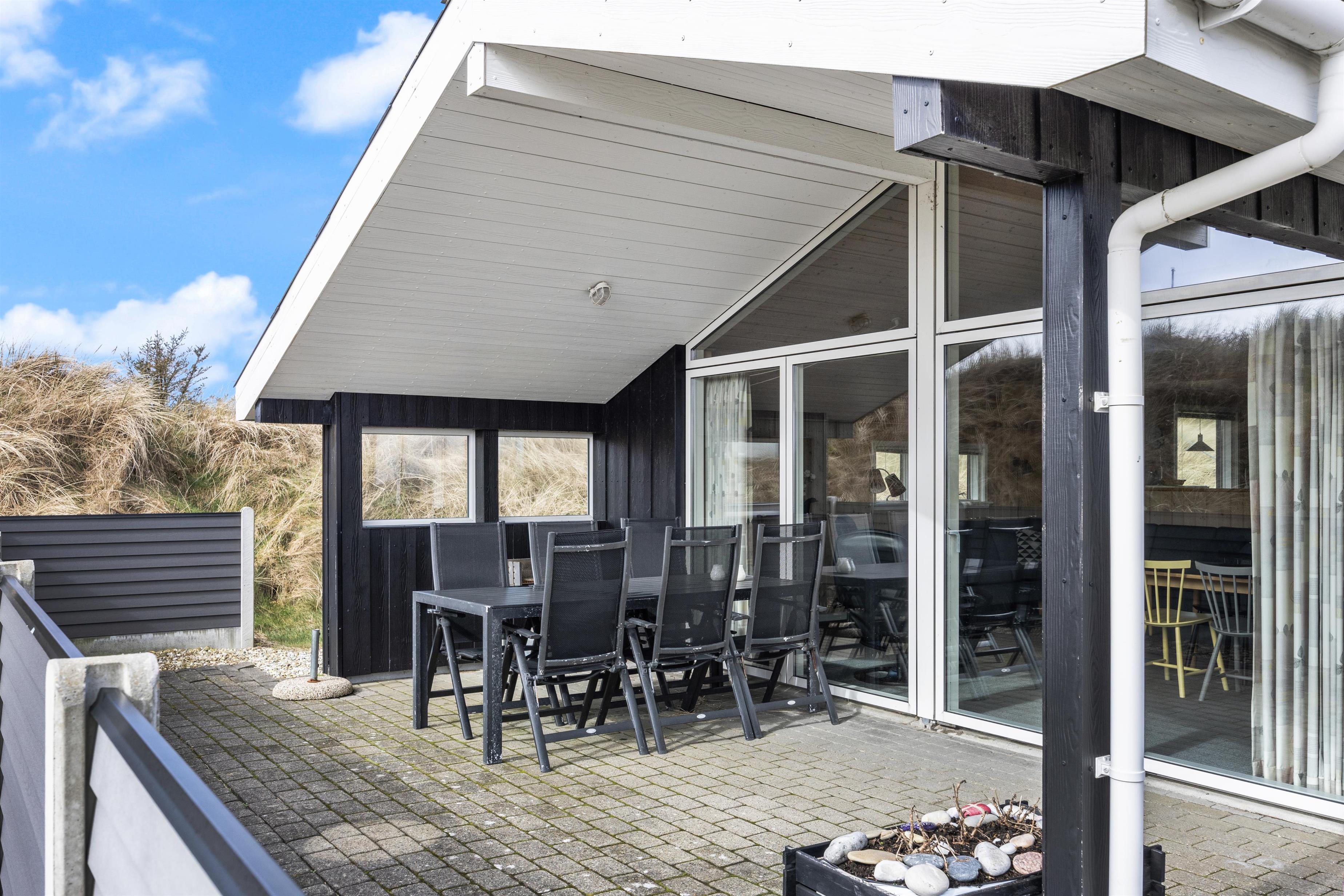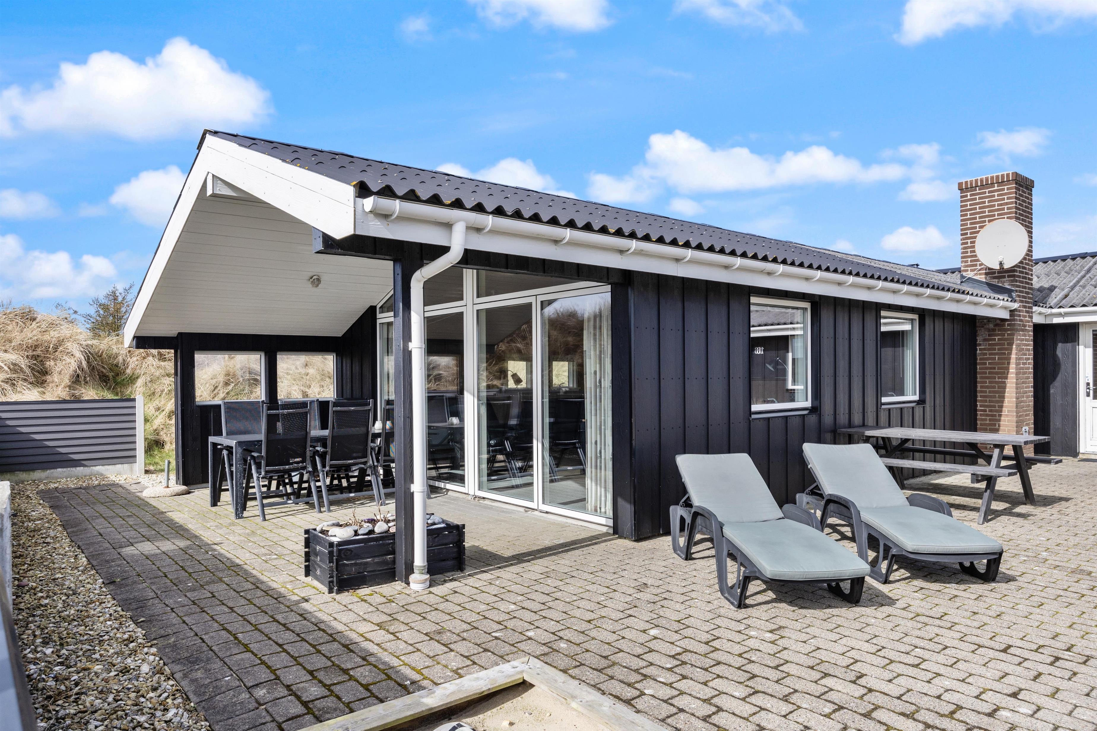 Sommerhuset ligger på en stille og rolig stikvej og blot 550 meter fra stranden i Houvig, og sommerhusets ydre er bestemt lige så charmerende som dets indre. Den overdækkede og afskærmede terrasse inviterer til lange grillmiddage med de medfølgende havemøbler, og I kan se børnene lege i sandkassen. Når solen går ned, kan I nyde en aften i haven med en dejlig grillmad. Med blot 2400 meter til indkøbsmuligheder er det nemt at proviantere til en afslappende dag i sommerhusets naturskønne omgivelser.