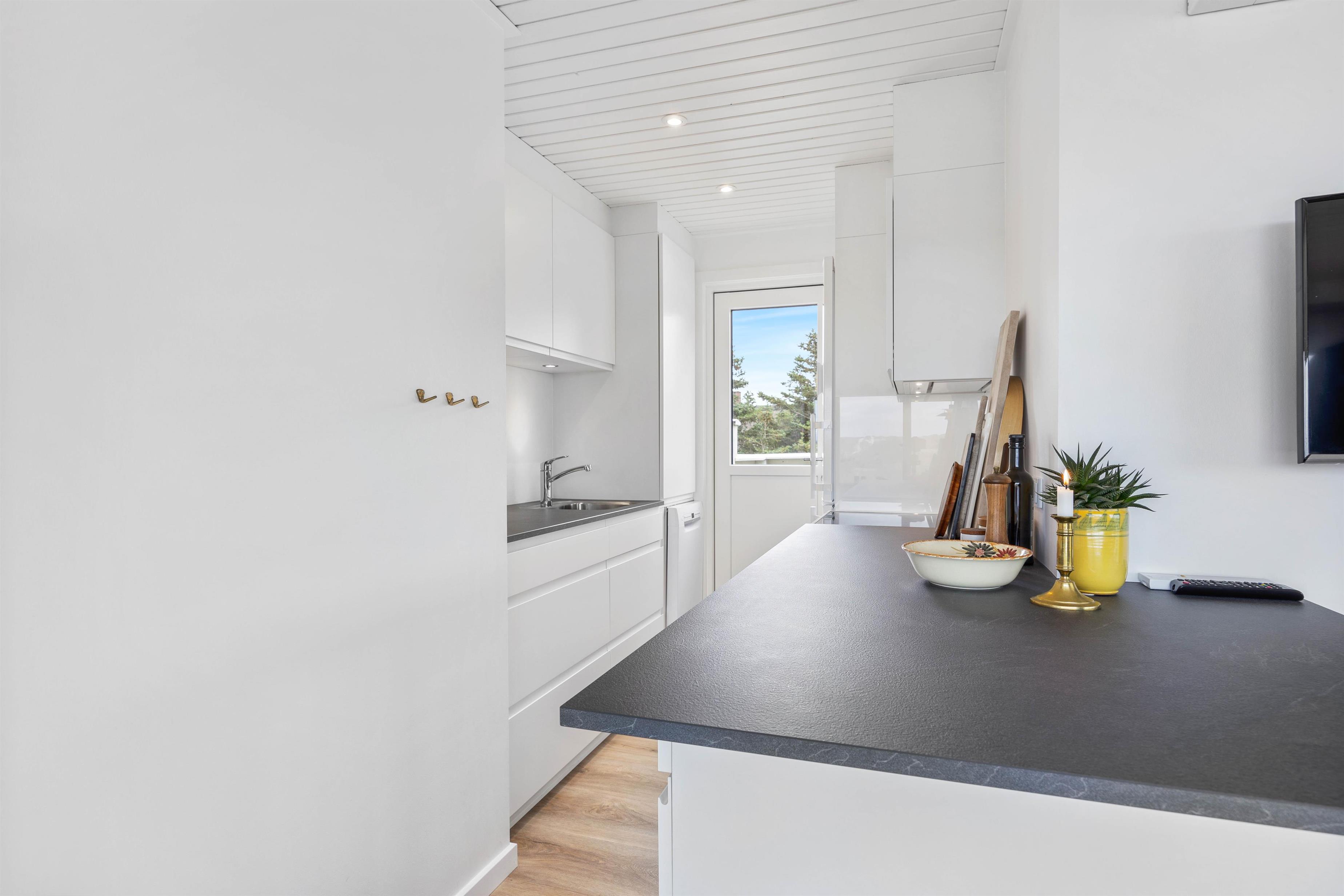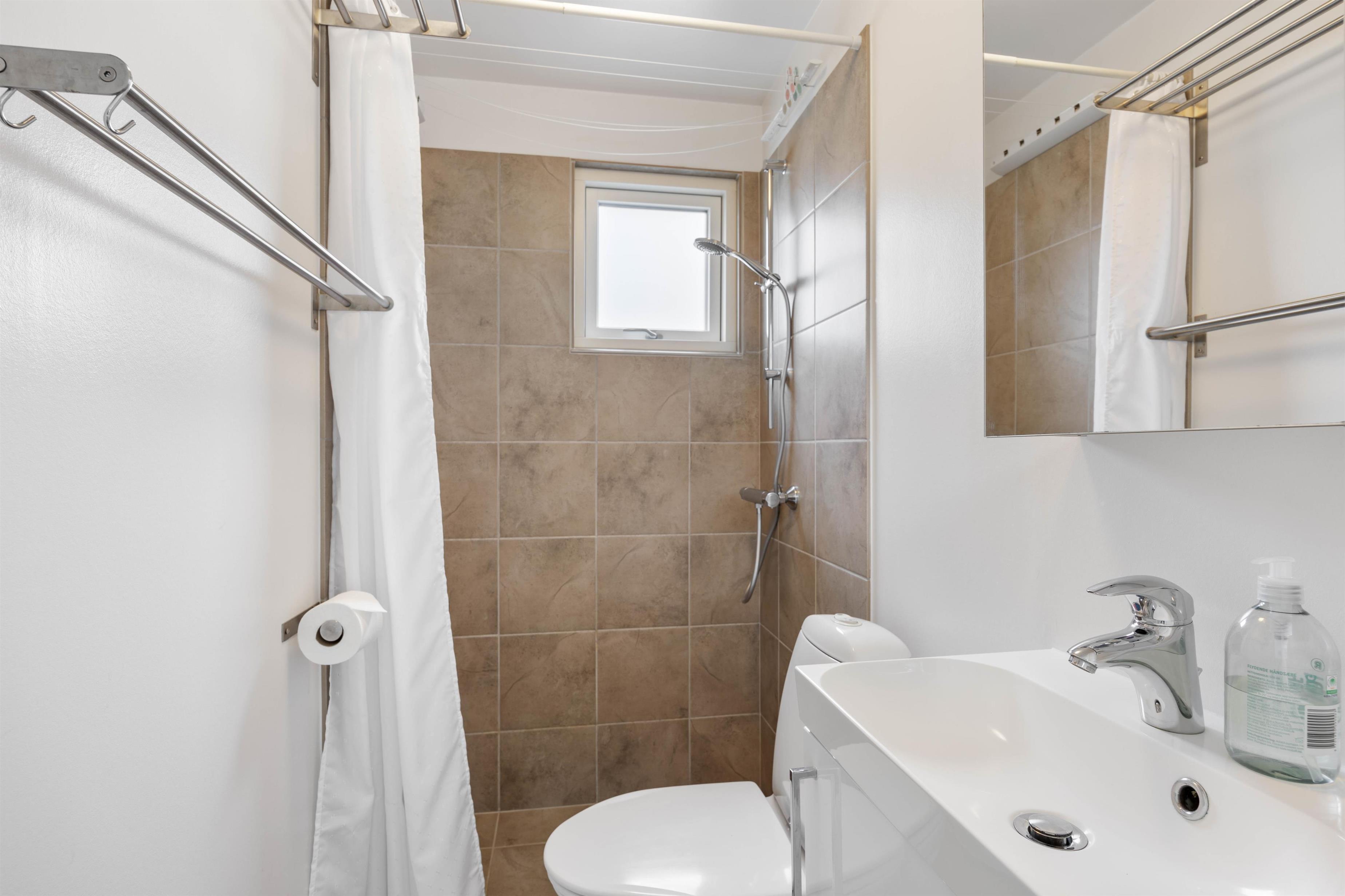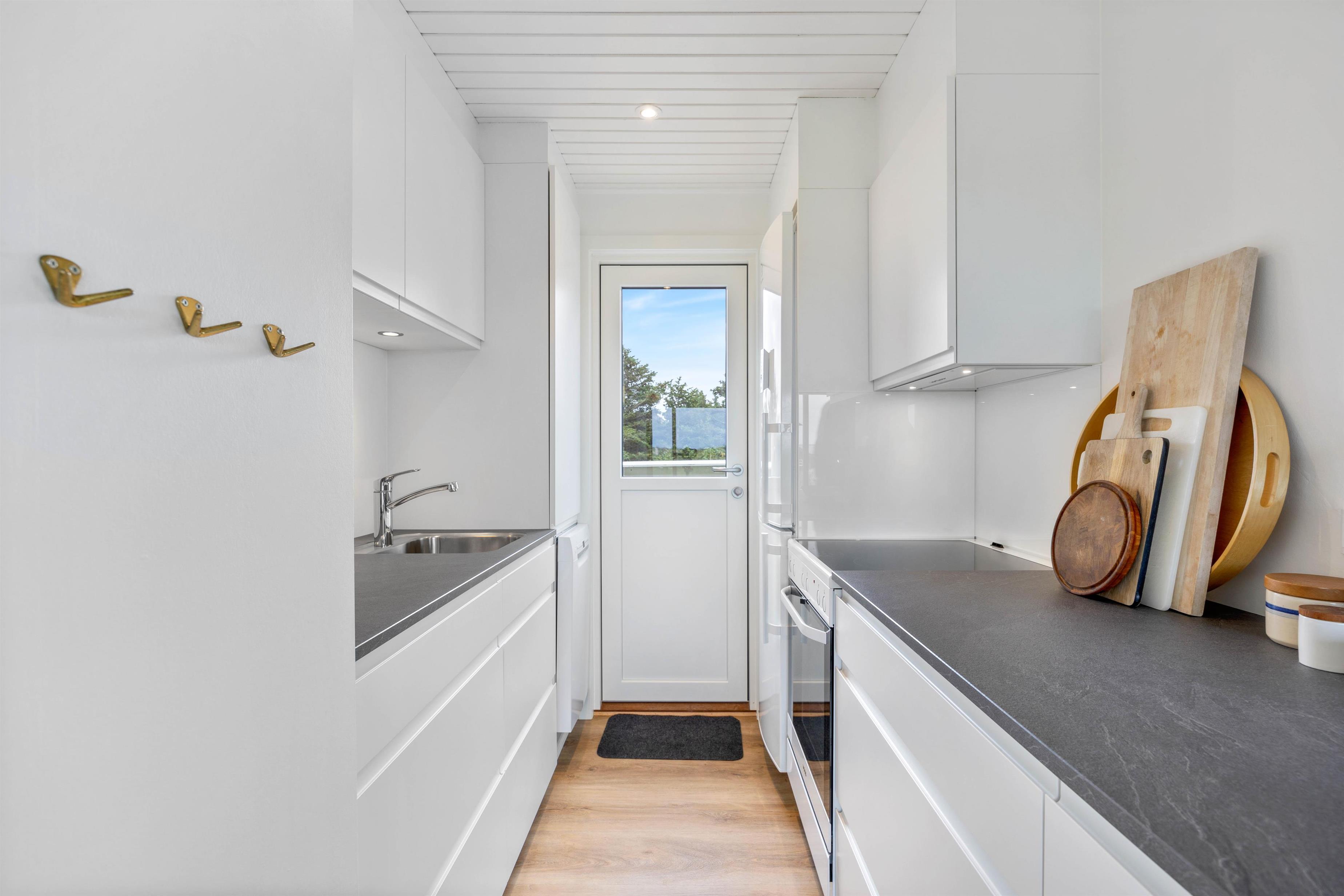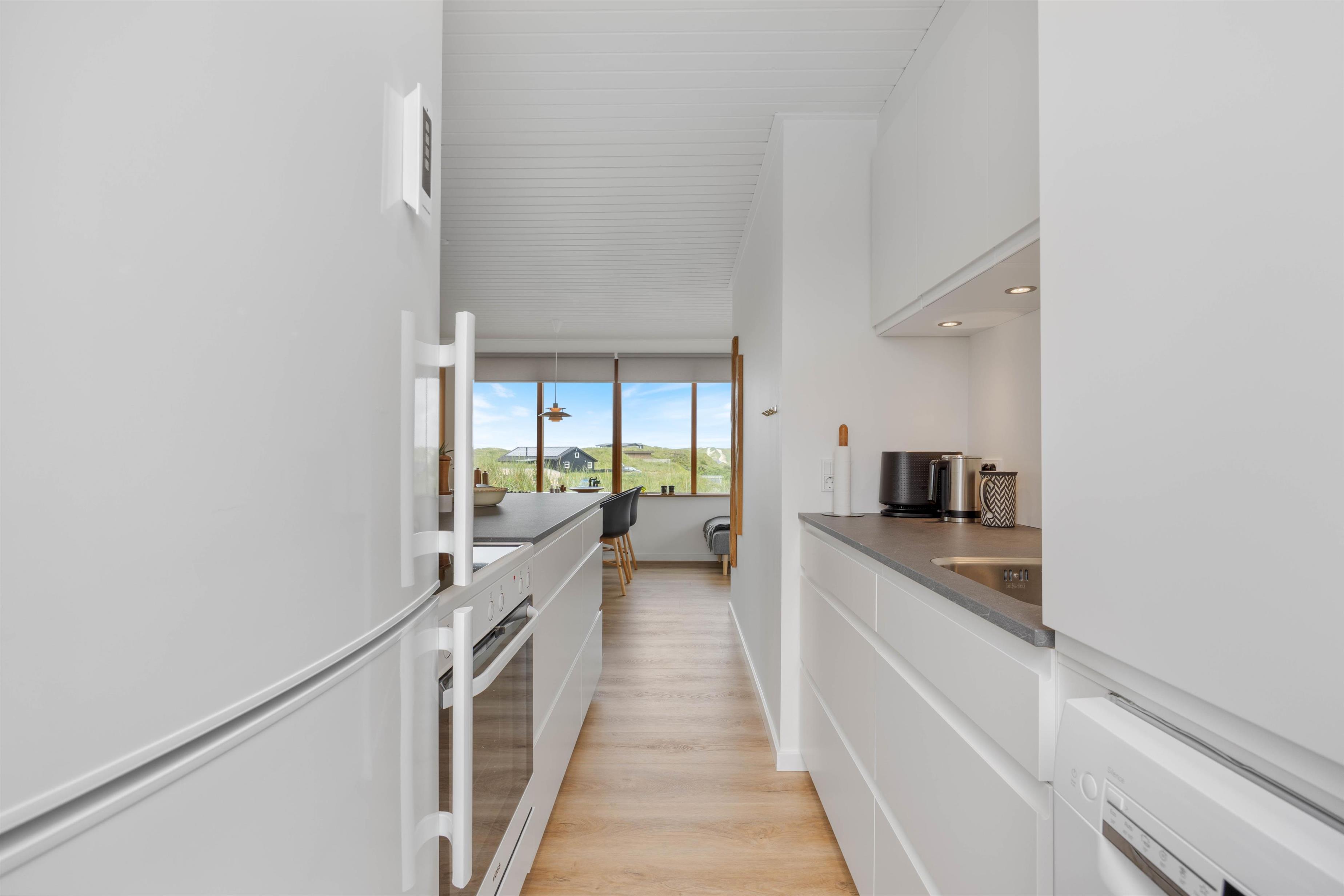 Tilbered måltiderne i det nye flotte køkken, samtidig med du nyder udsigten og kan følge med i samtalen, nede i stuen. Oprydningen er nemt klaret, da der selvfølgelig er opvaskemaskine i sommerhuset. På det dejlige badeværelse, er der gulvvarme, som også er med til at sikre, ingen får kolde fusser på klinkerne.