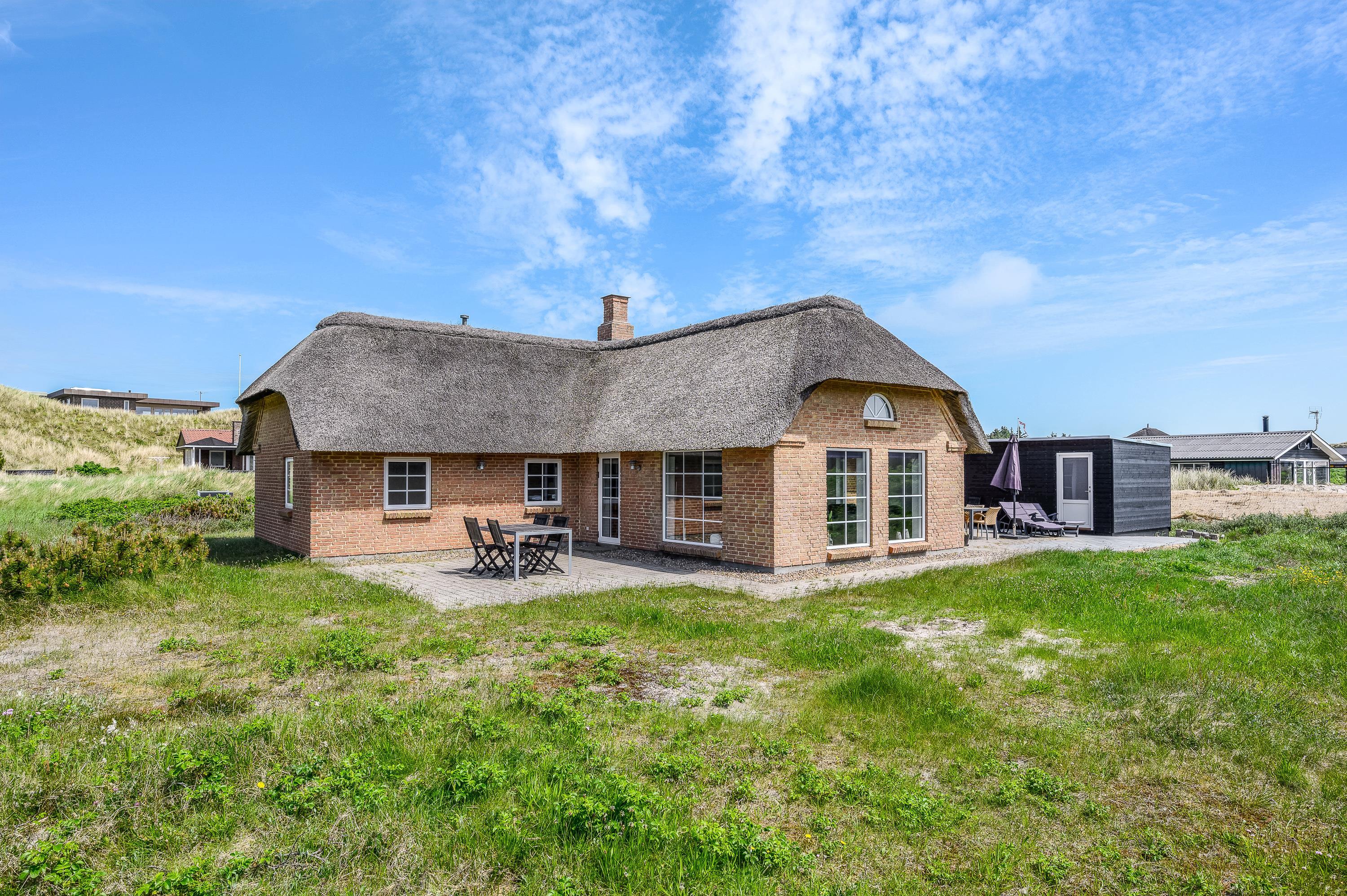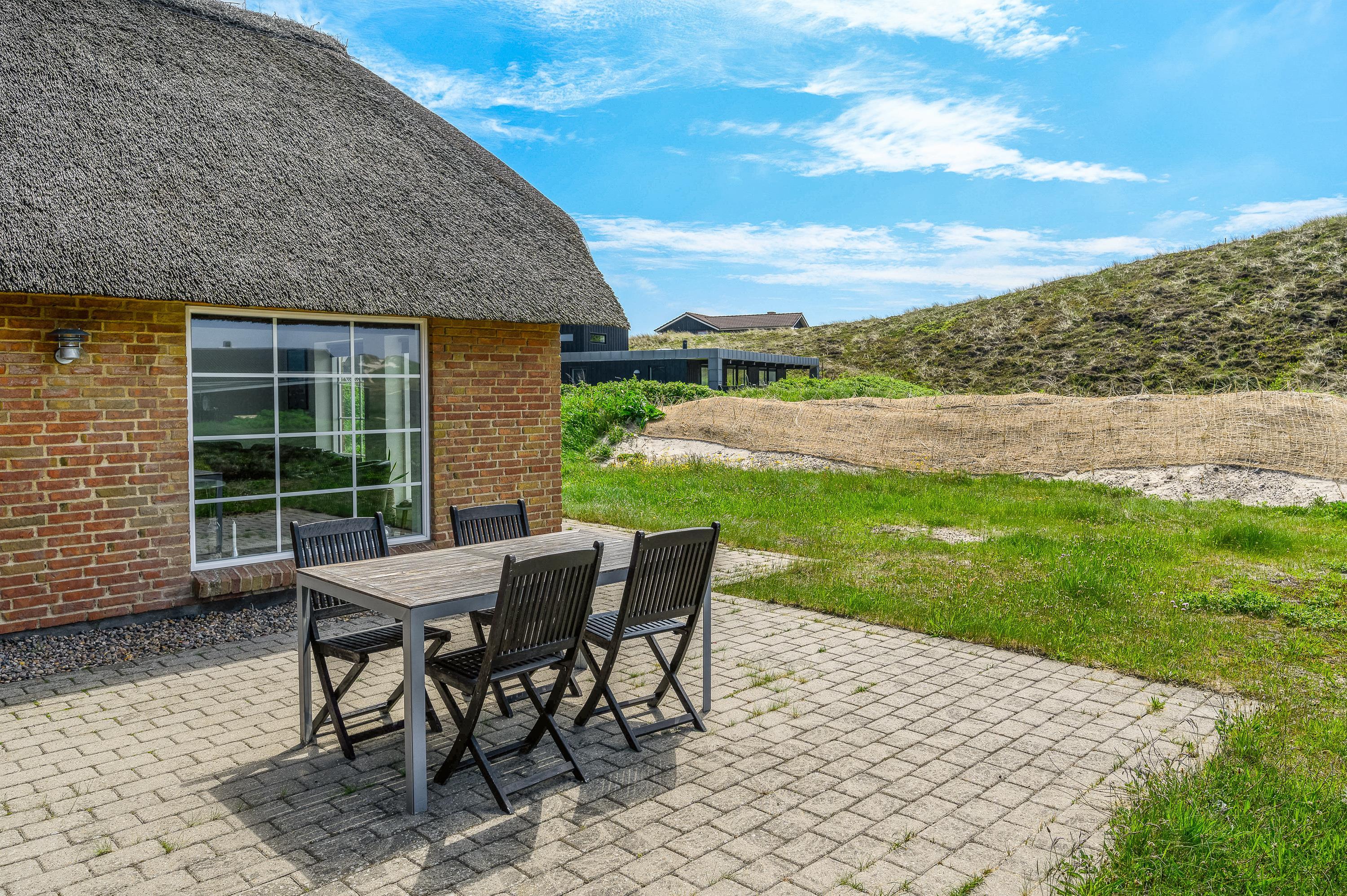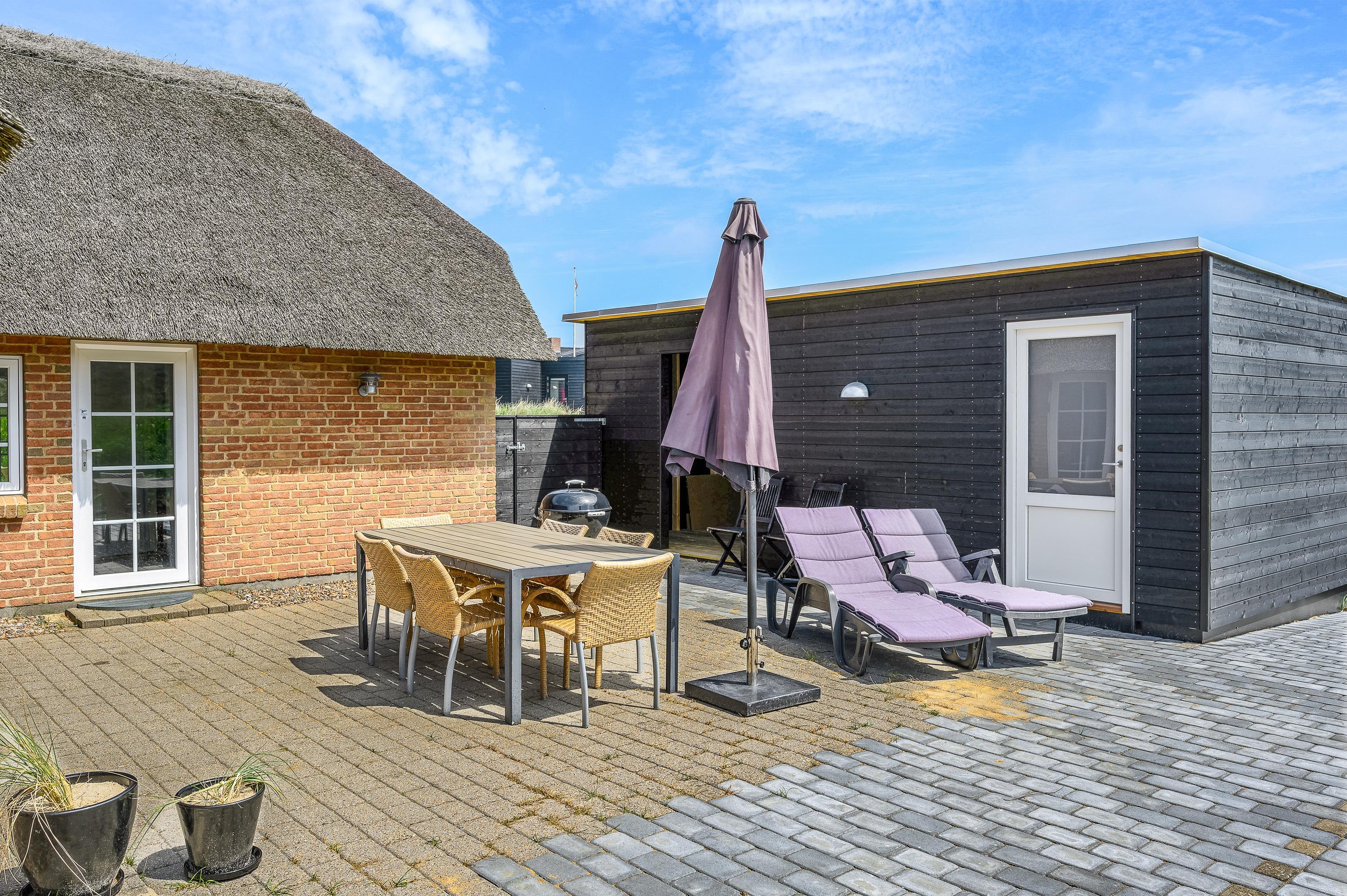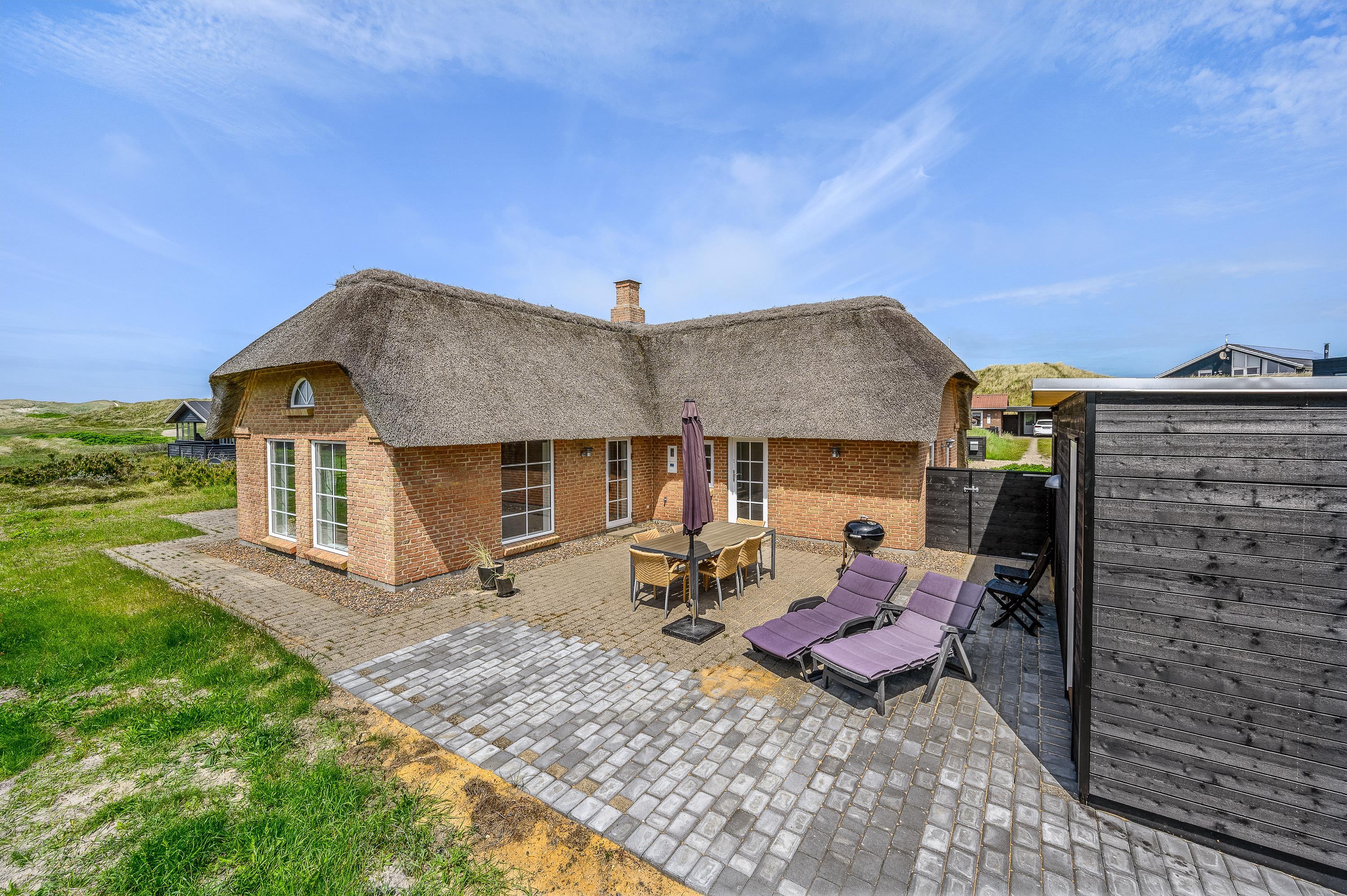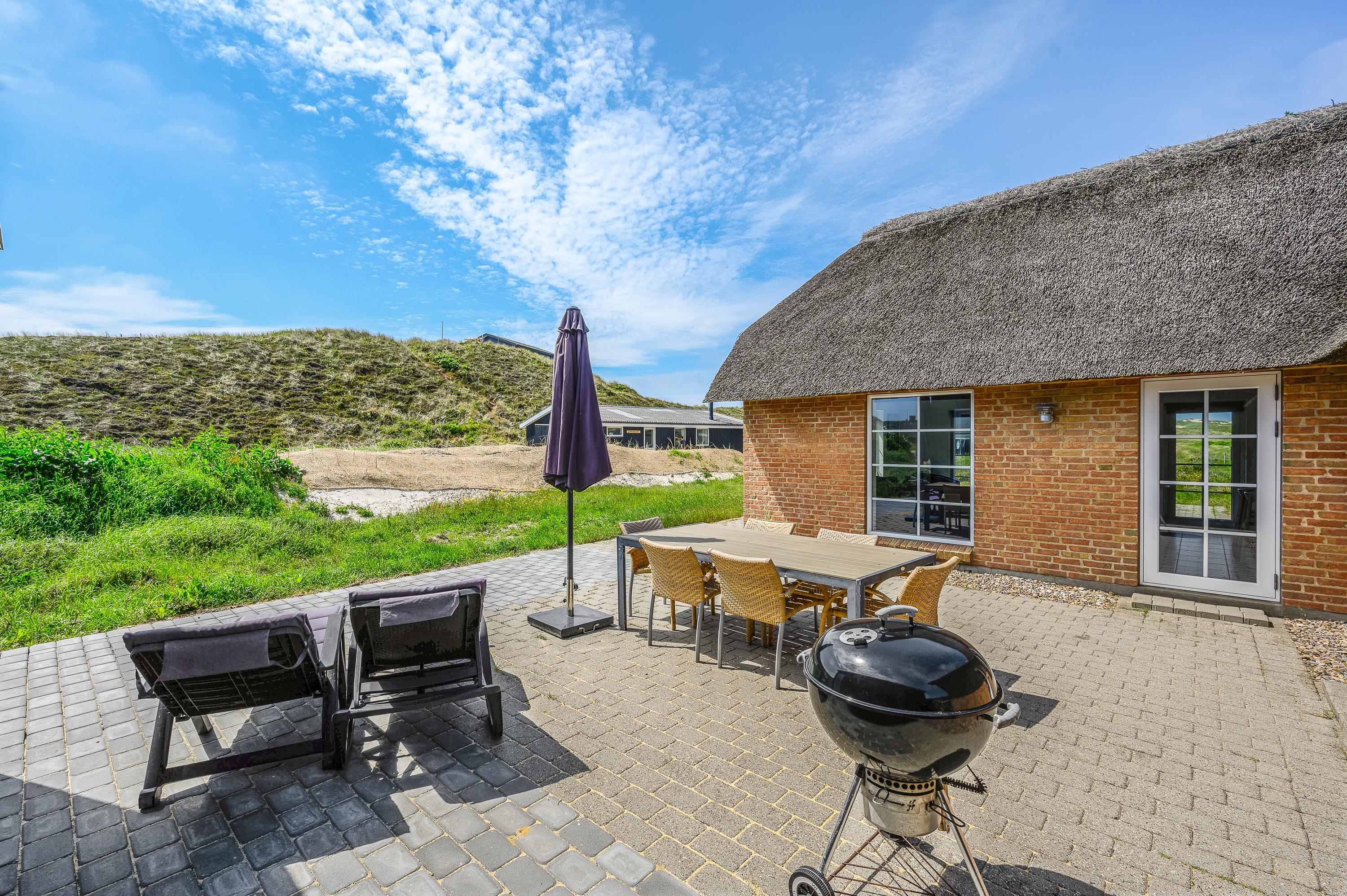 Fra sommerhusets stue er der udgang til de to åbne terrasseområder, hvor den vestjyske natur kan opleves på tæt hold. Terrassen er oplagt til hyggelige grillaftener og afslapning i solen. Her finder I havemøbler, liggestole og grill samt et redskabsrum.