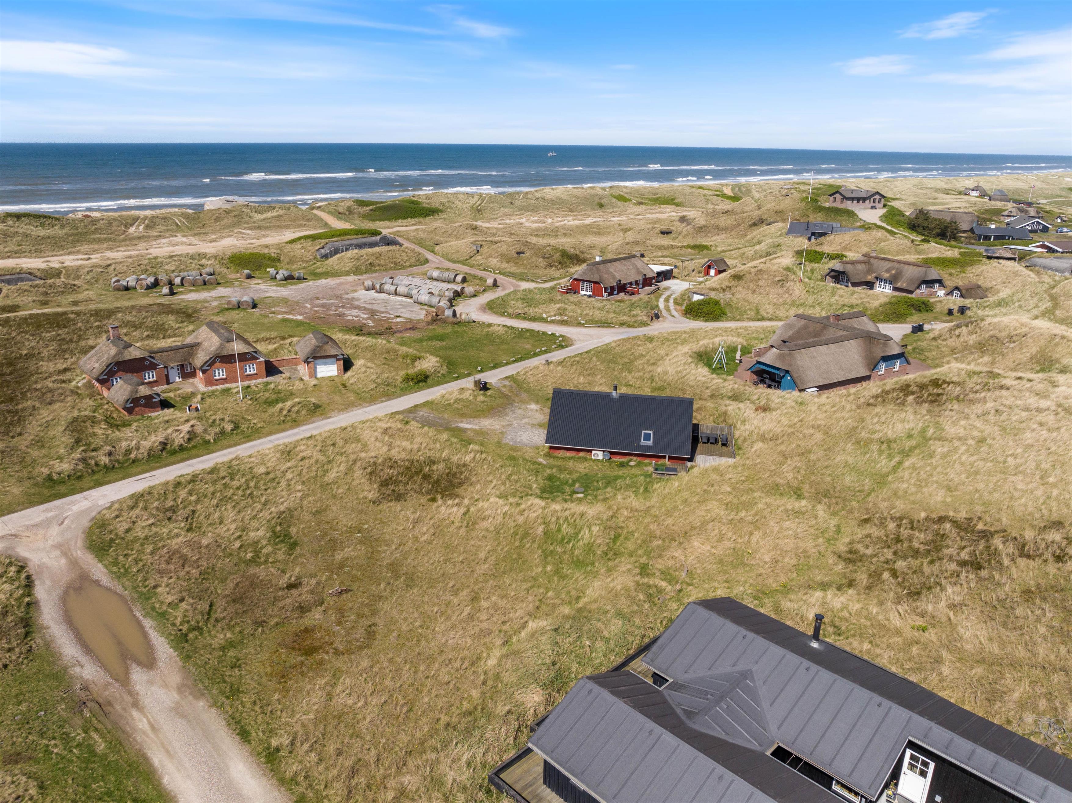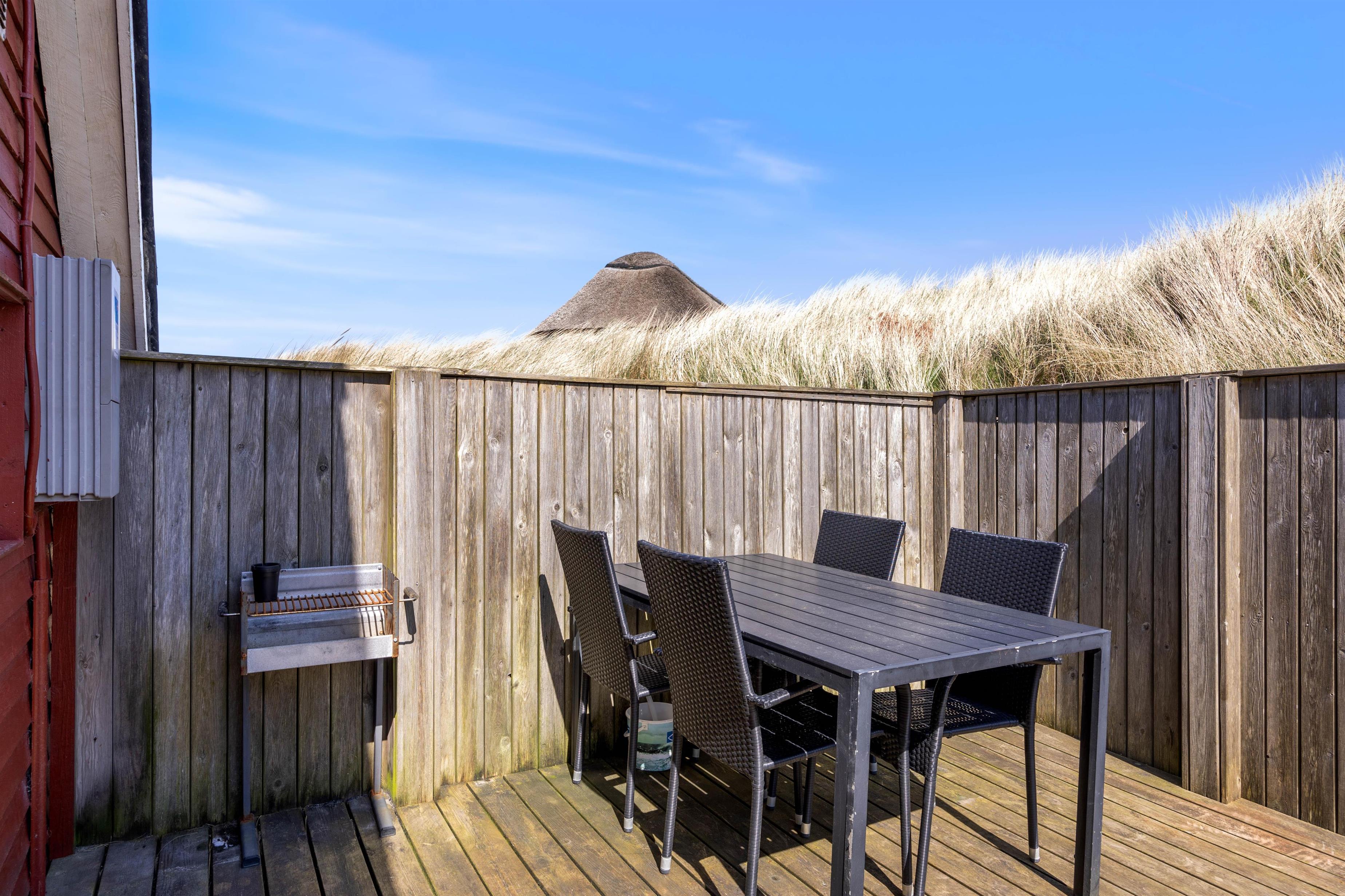 Det hyggelige, røde træsommerhus ligger som en lille, farvet bakketop i hedelandskabet på en ugeneret beliggenhed ud til første klitrække i Houvig. Huset har en hyggelig terrasse, der nærmest går i ét med det omkringliggende landskab af græsser og marehalm.