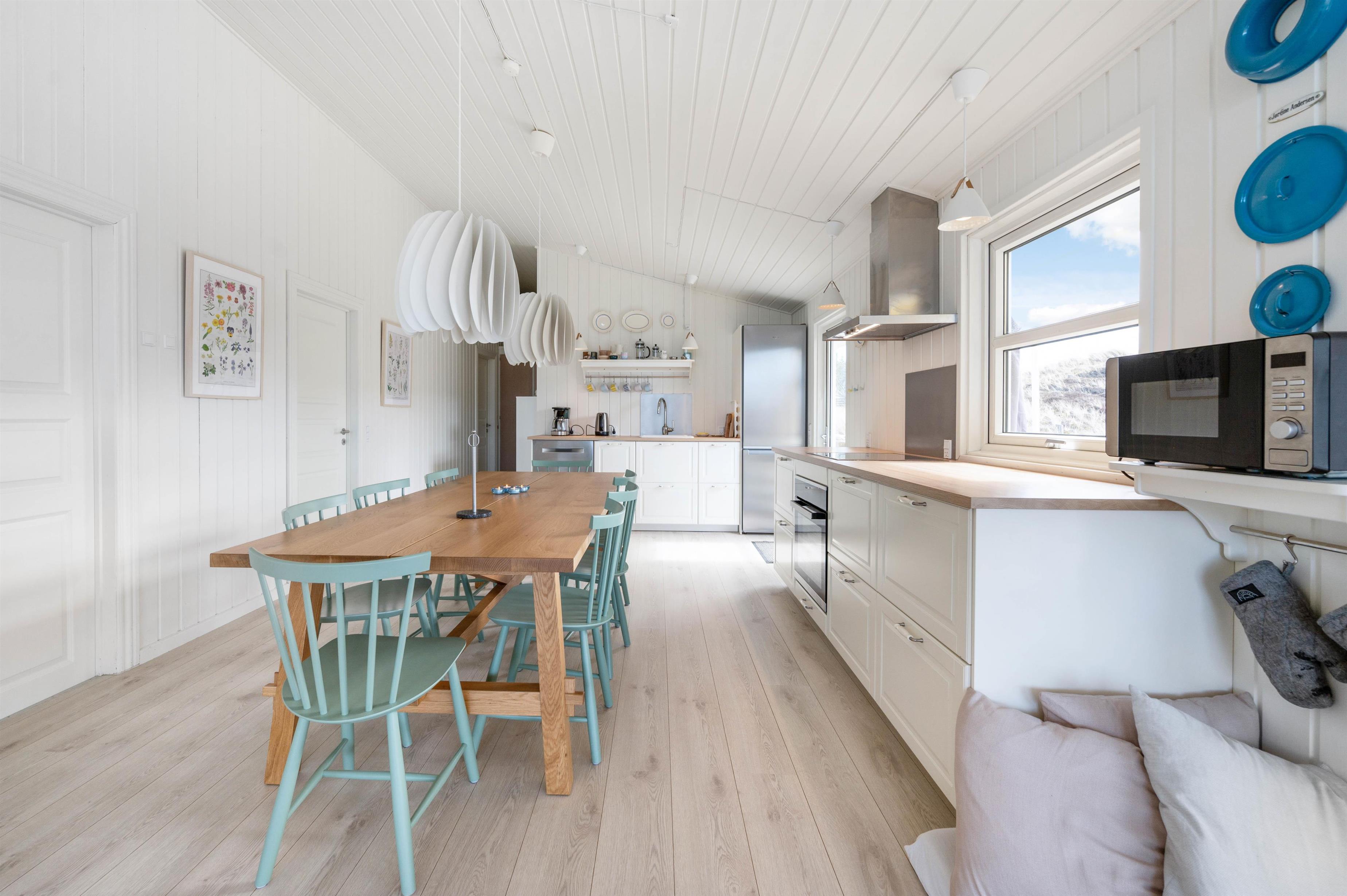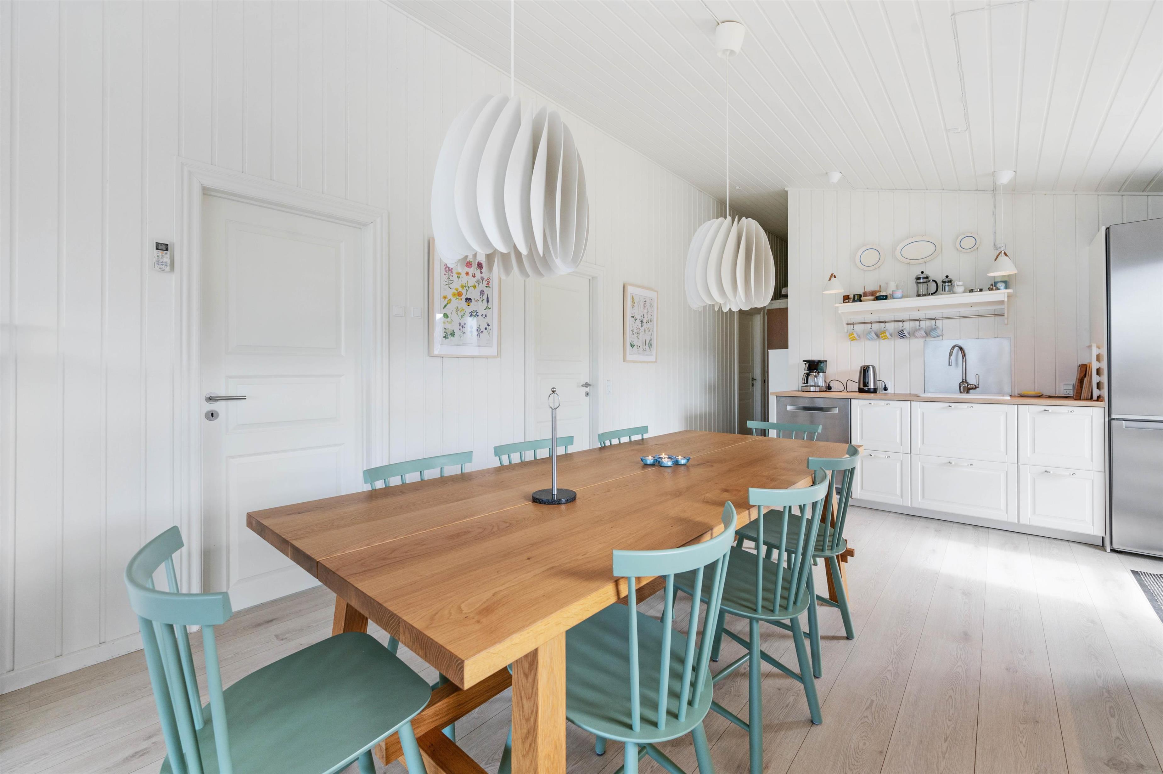 Sommerhuset er opdelt i flere niveauer. Stue er derfor ”nedsænket” i forhold til køkken og spisestue, hvilket giver det ekstra karakter og personlighed og gør indretningen desto mere interessant. Men selvom de to niveauer bryder med det gængse, så vil I stadig kunne nyde godt af den sædvanlige køkkenalrum-fornemmelse. Og I kan altid følge med i hinandens gøremål.