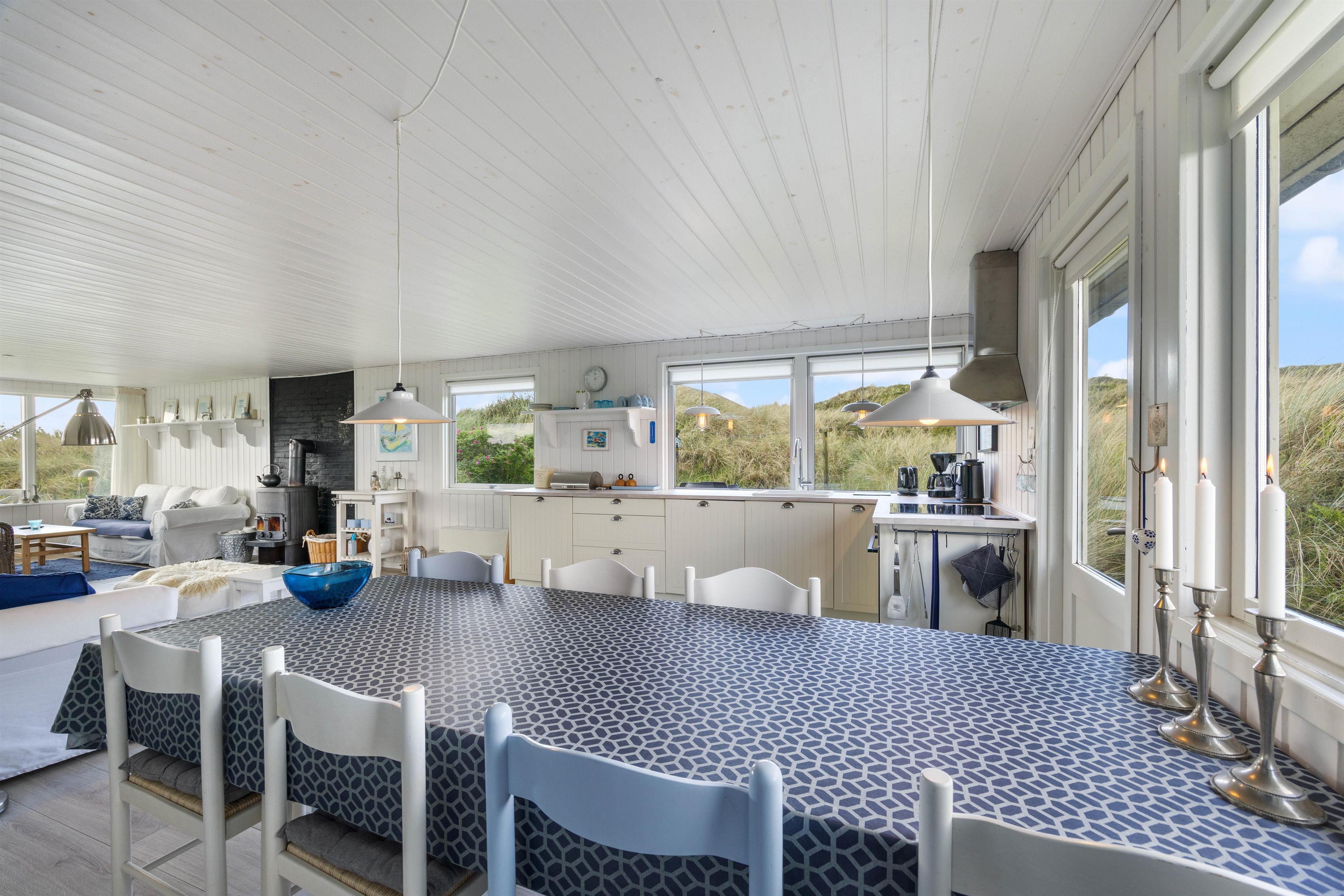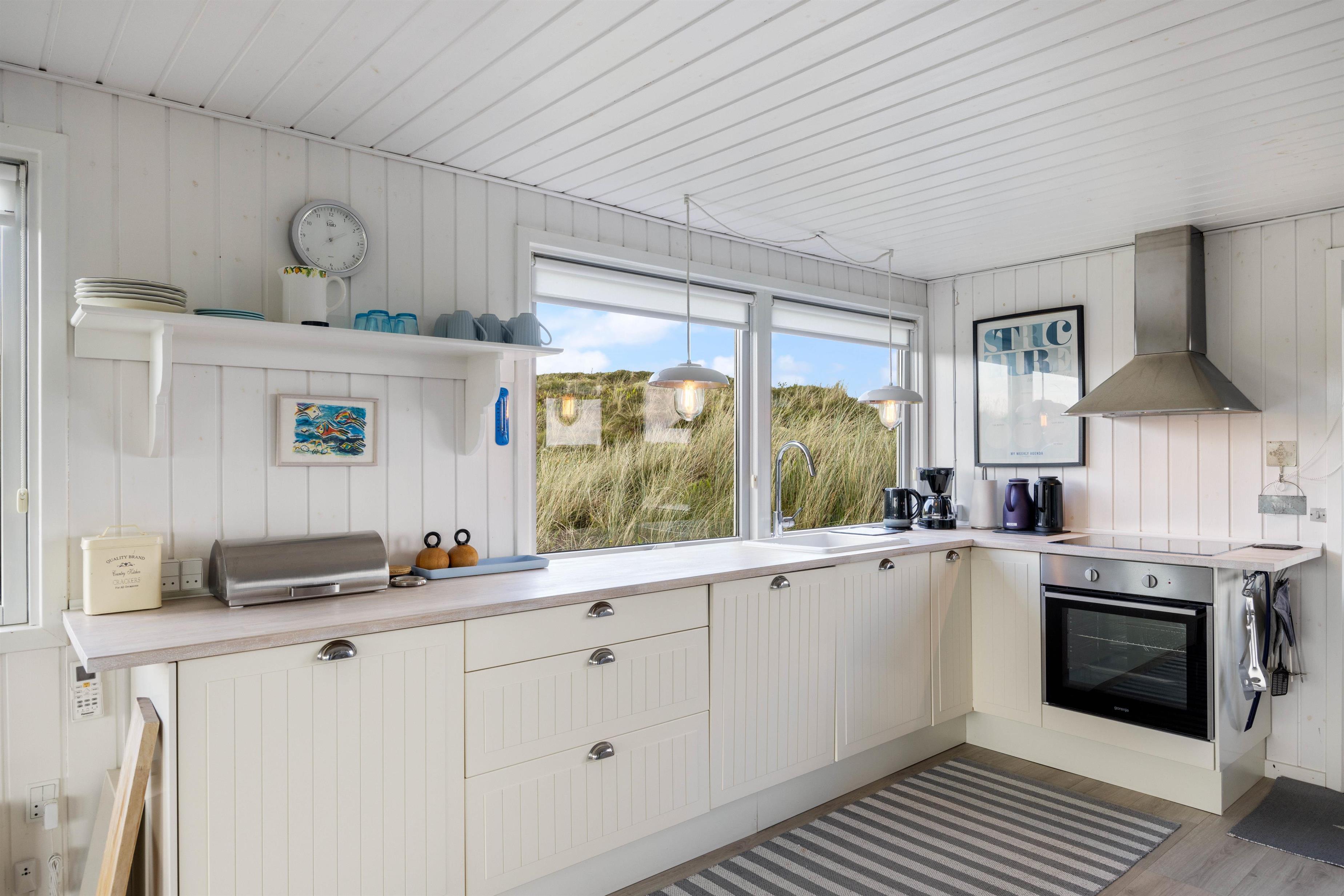 Her på Sortebærdalen 21 møder jer en dejlig terrasse med en god spisekrog, grill og havestole, så I kan nyde de lune sommeraftener med masser af skøn mad, vin og måske lidt stille musik til at sætte stemningen. Sommerhuset ligger kun 400 meter fra Vesterhavet, så der er ikke langt til I står med fødderne i det brusende hav. Ude fra den dejlige træterrasse kan I nyde en flot udsigt ud over klitlandskabet, mens I nyder solskinnet eller tilbereder et dejligt måltid mad.