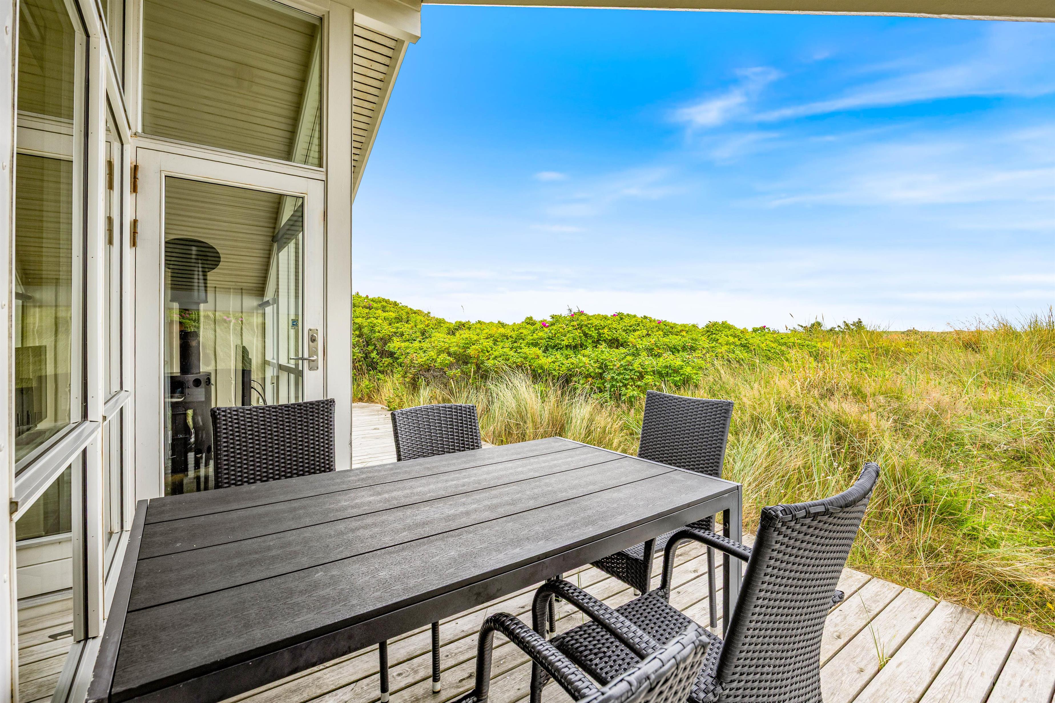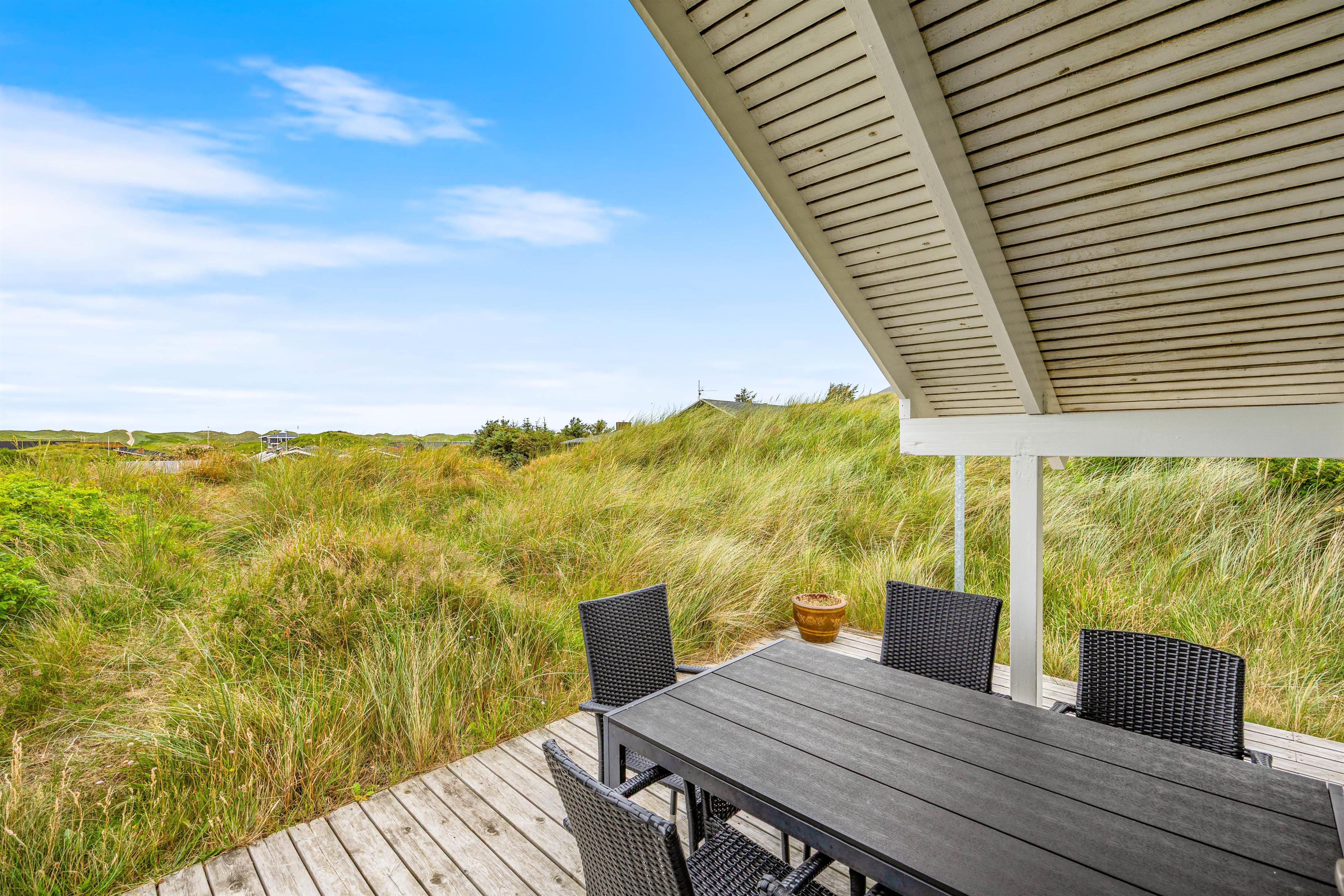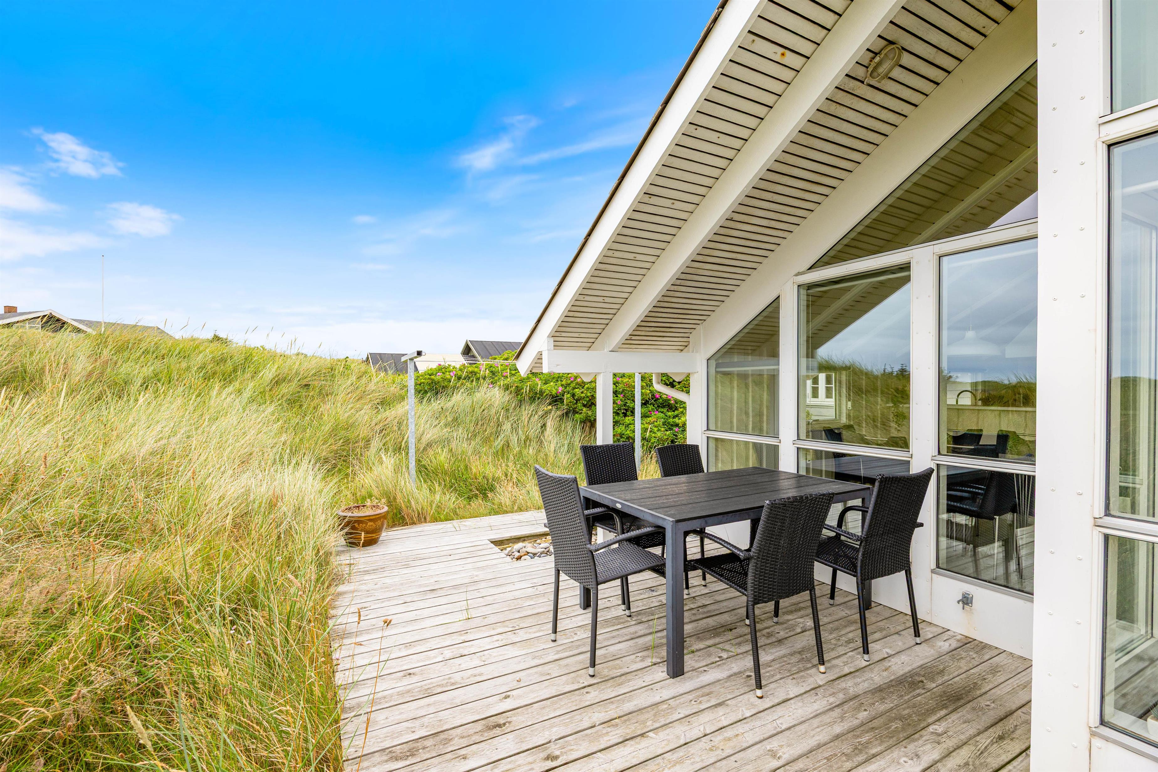 Ude for huset finder I en lækker terrasse. Den lækre træterrasse går hele vejen rundt om huset, og mod vest finder I terrassemøblementet. Her kan på dejlige sommerdage sætte jer til rette, og bare nyde jeres ferie. Fra terrassen har i en dejlig udsigt over nærområdet, og de fleste dage vil I kunne høre lyden af Vesterhavets brusen.