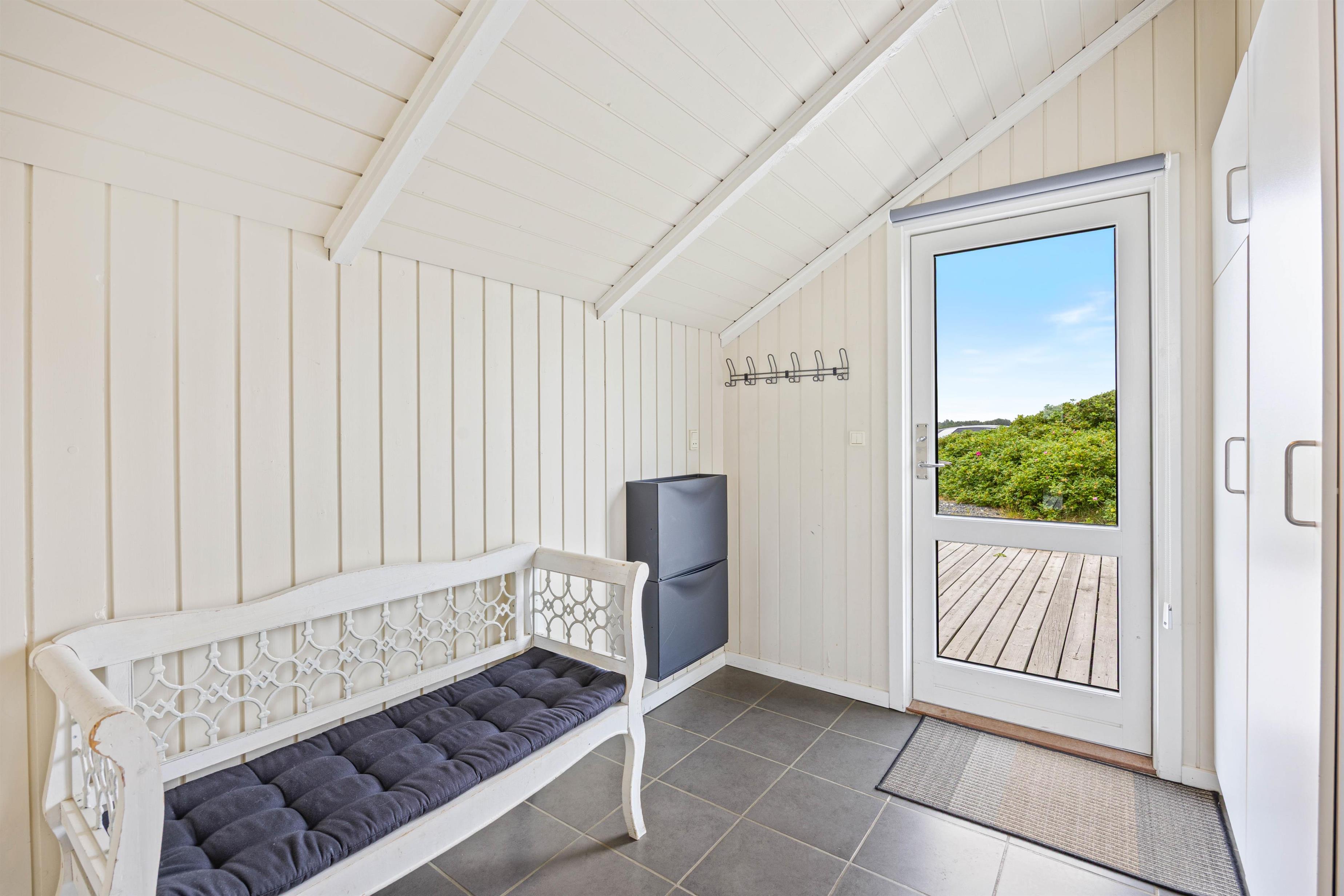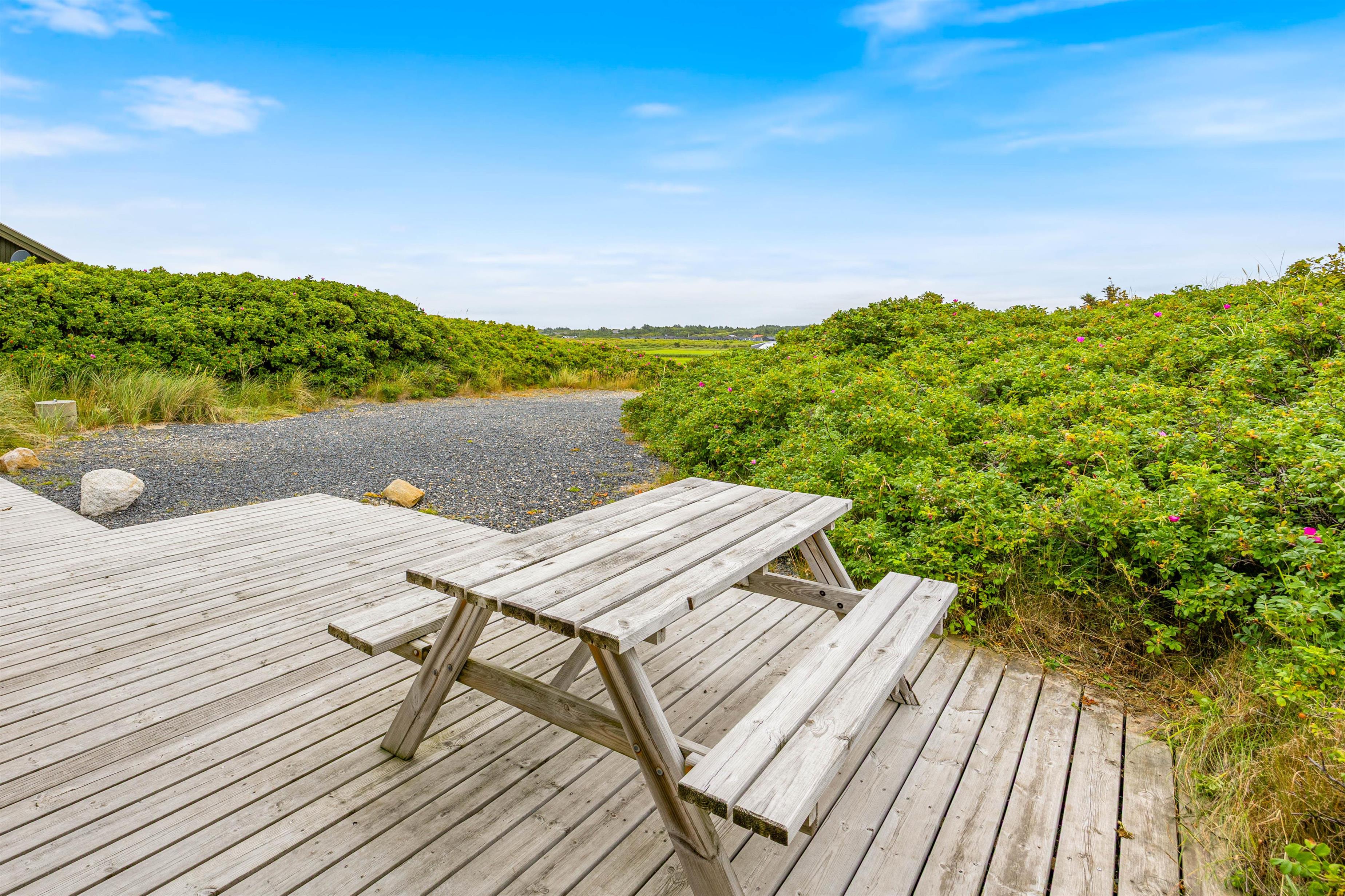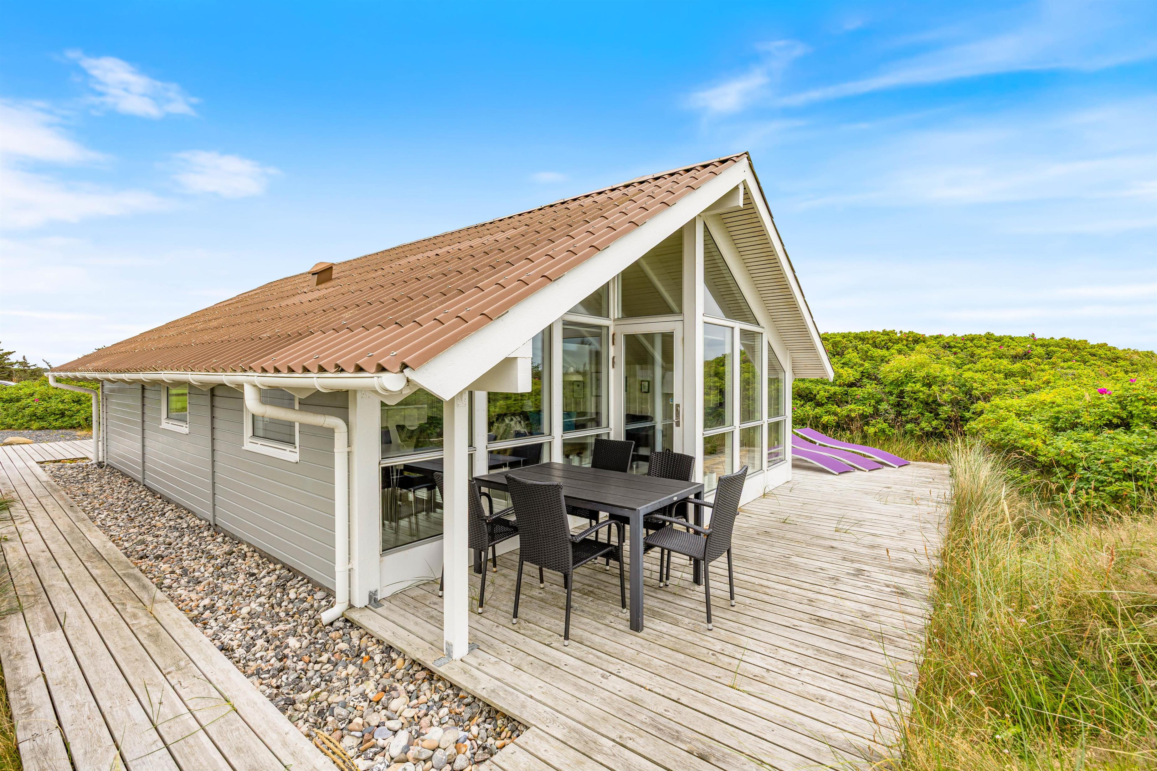 Ude for huset finder I en lækker terrasse. Den lækre træterrasse går hele vejen rundt om huset, og mod vest finder I terrassemøblementet. Her kan på dejlige sommerdage sætte jer til rette, og bare nyde jeres ferie. Fra terrassen har i en dejlig udsigt over nærområdet, og de fleste dage vil I kunne høre lyden af Vesterhavets brusen.