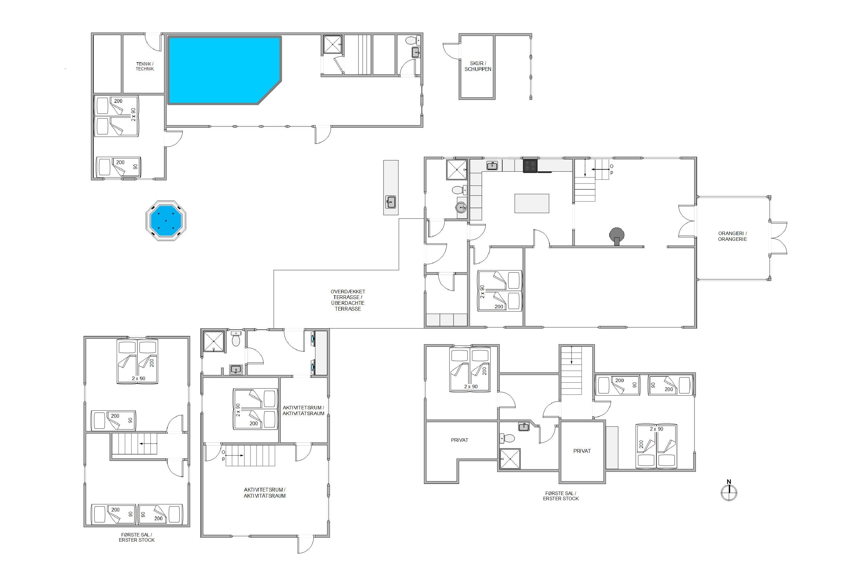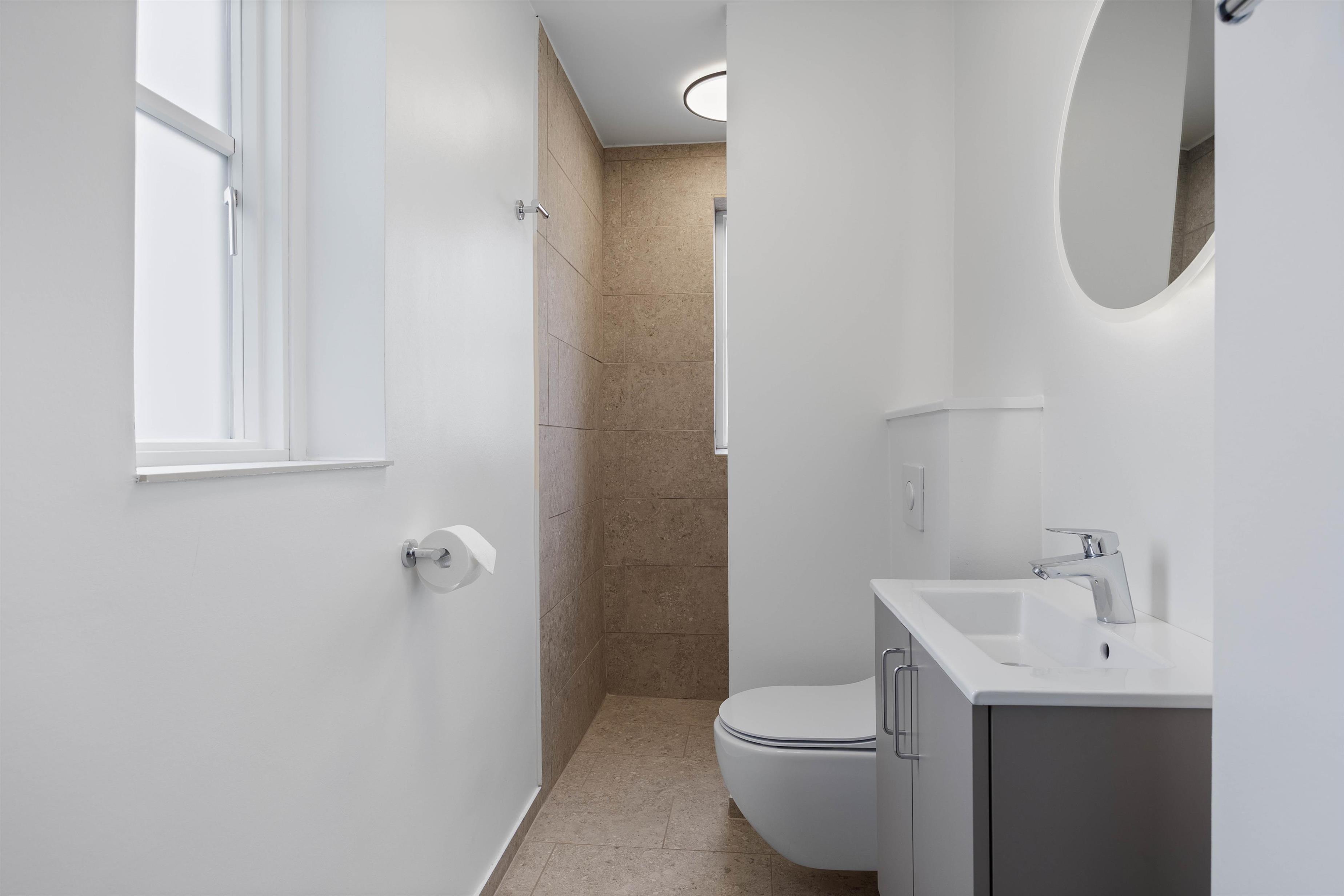 Det rummelige feriehus består af ikke mindre end 7 soveværelser, med 18 sovepladser, med 2 ekstra senge i annekset. Der er fire fuldt udstyrede badeværelser, hvoraf tre har gulvvarme, hvilket der sørger for at I ikke skal bekymre jer om kolde fødder om morgenen her. En energibesparende luft-til-vand-varmepumpe sørger for behagelige temperaturer i feriehuset hele året rundt.