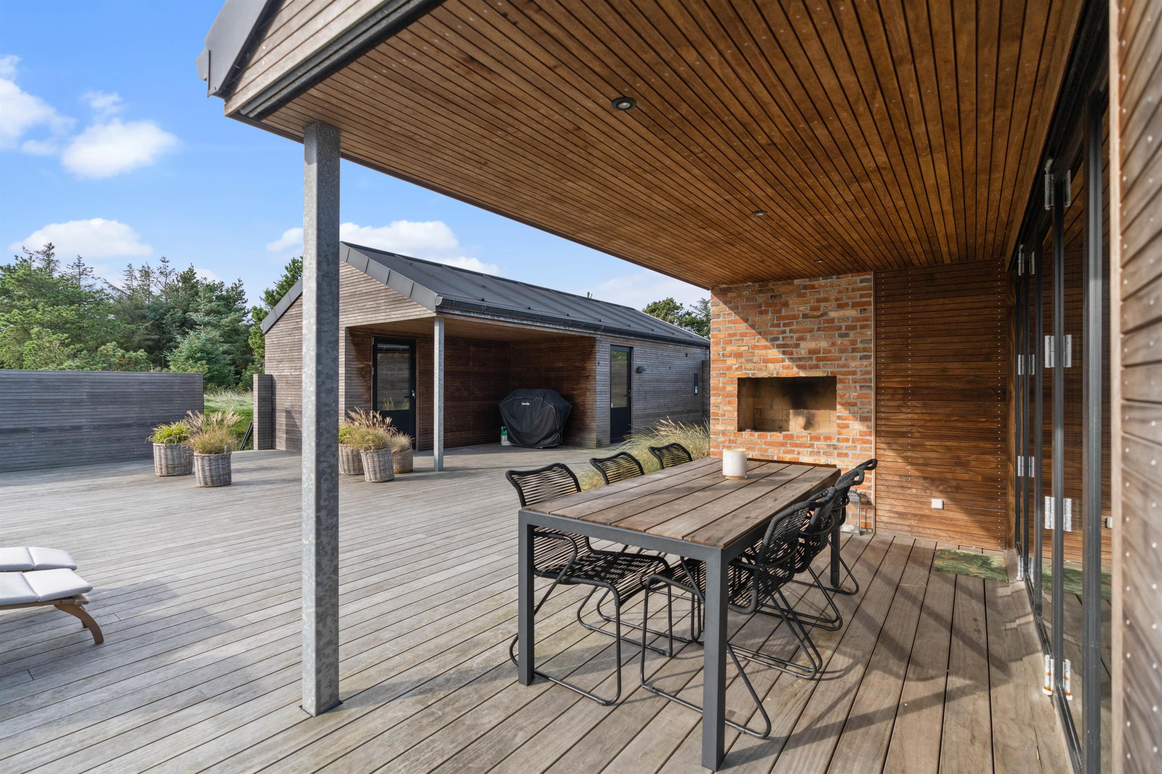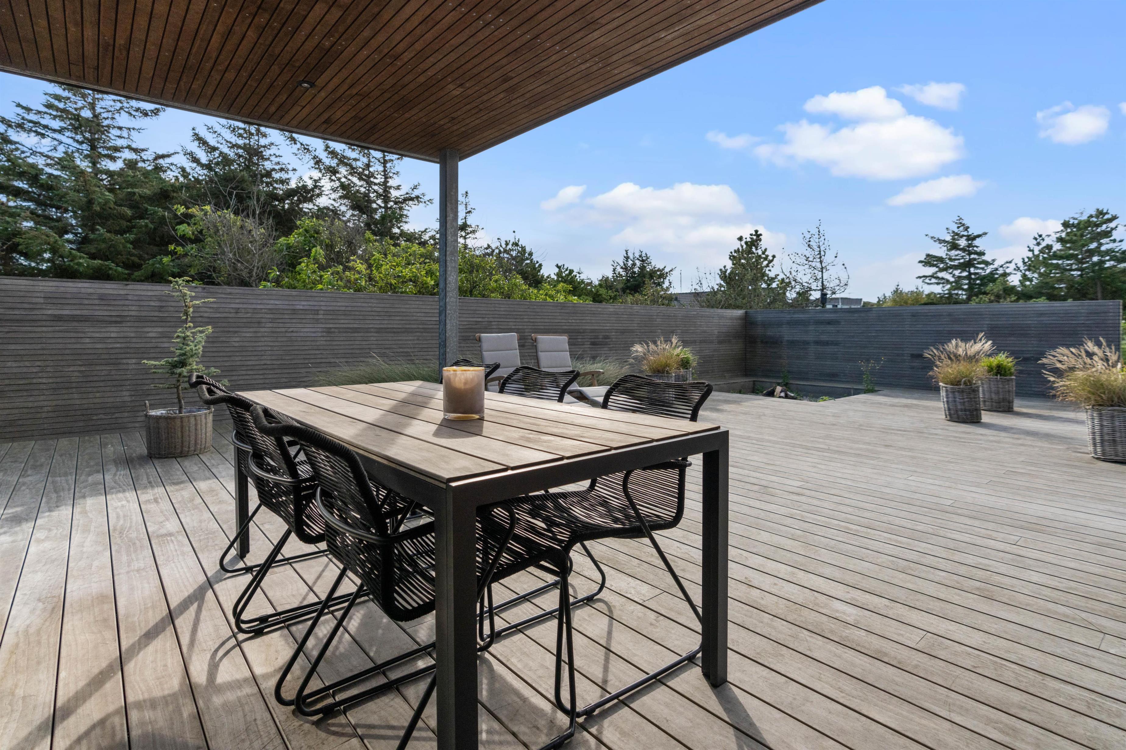 Skøn afskærmet træterrasse med bålplads, udebruser og hængekøje