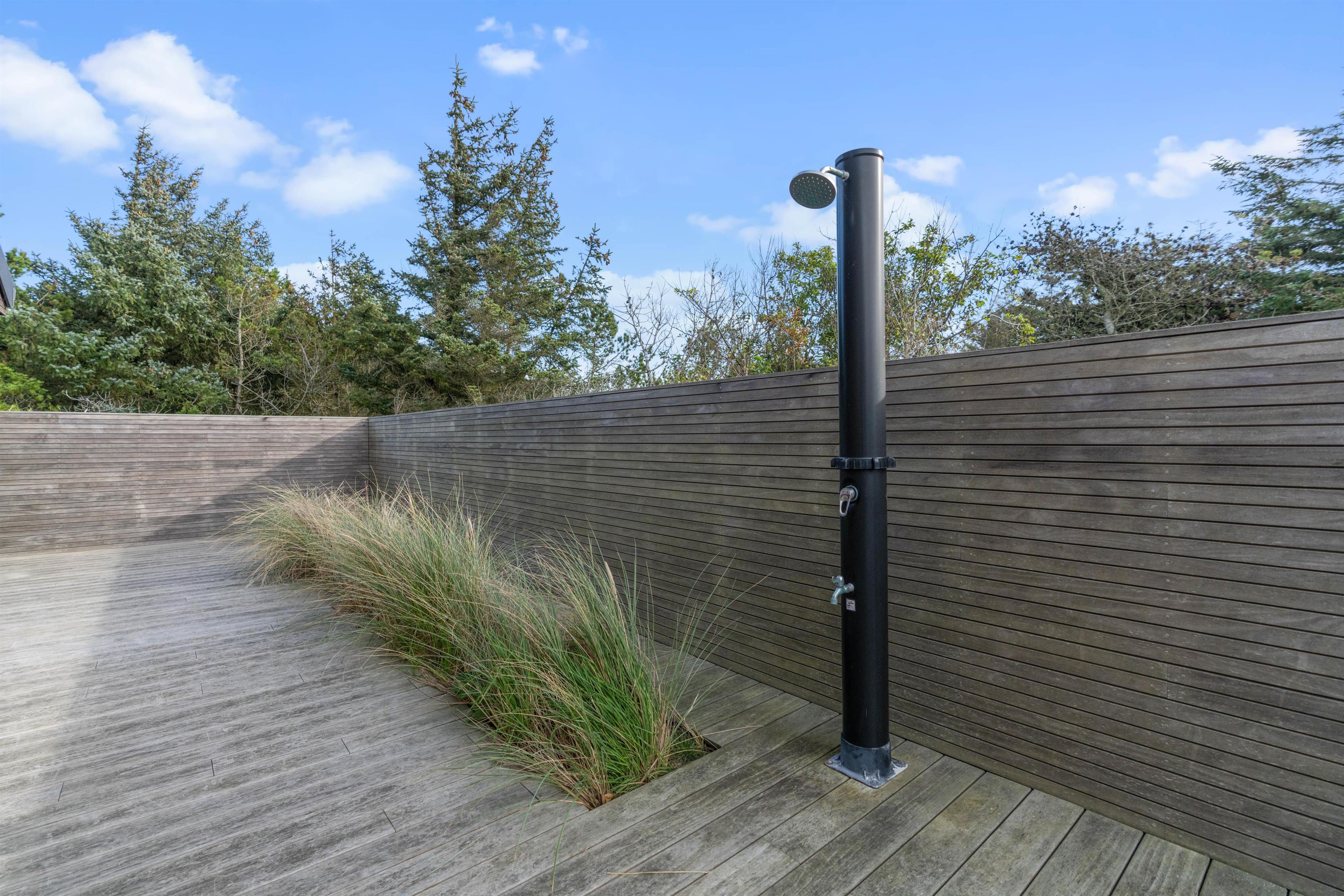 Efter en gåtur ved stranden kan I skylle sandet af under sommerhusets udebruser, der kan benyttes fra april til november.