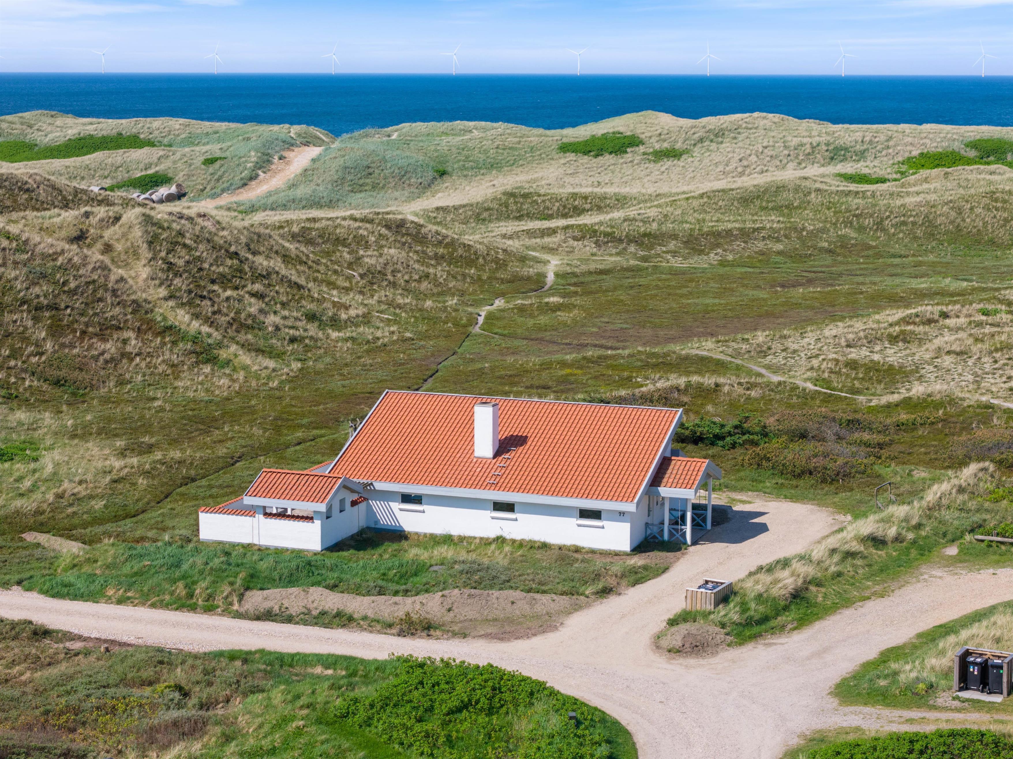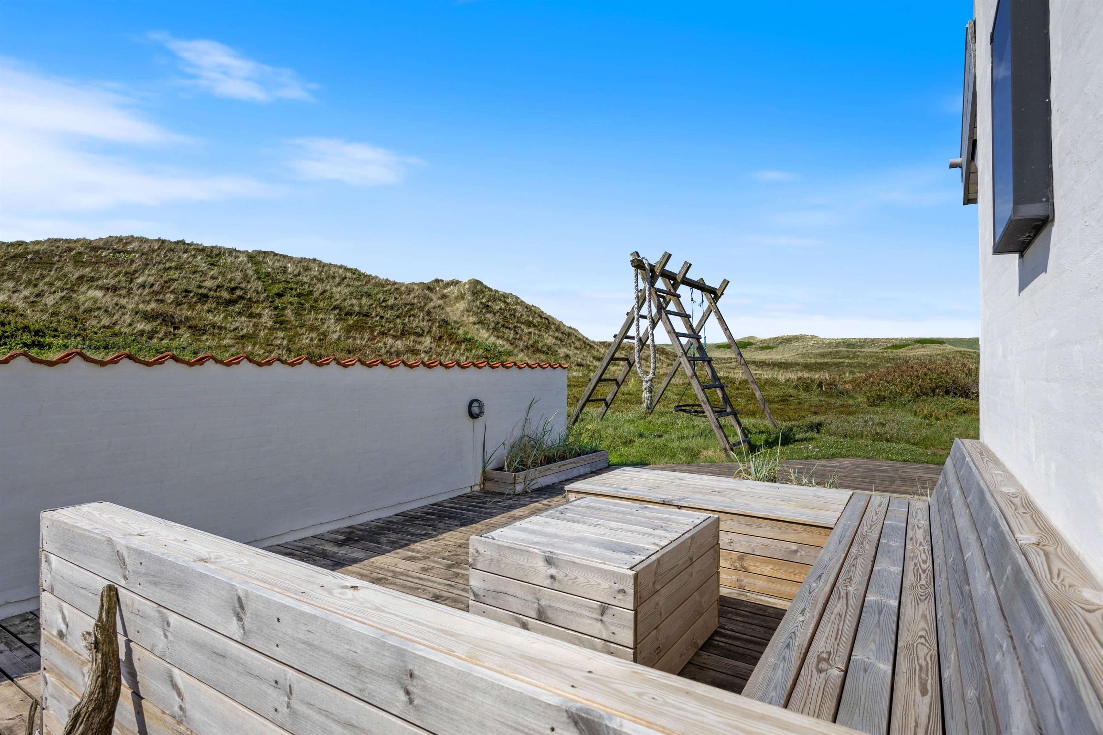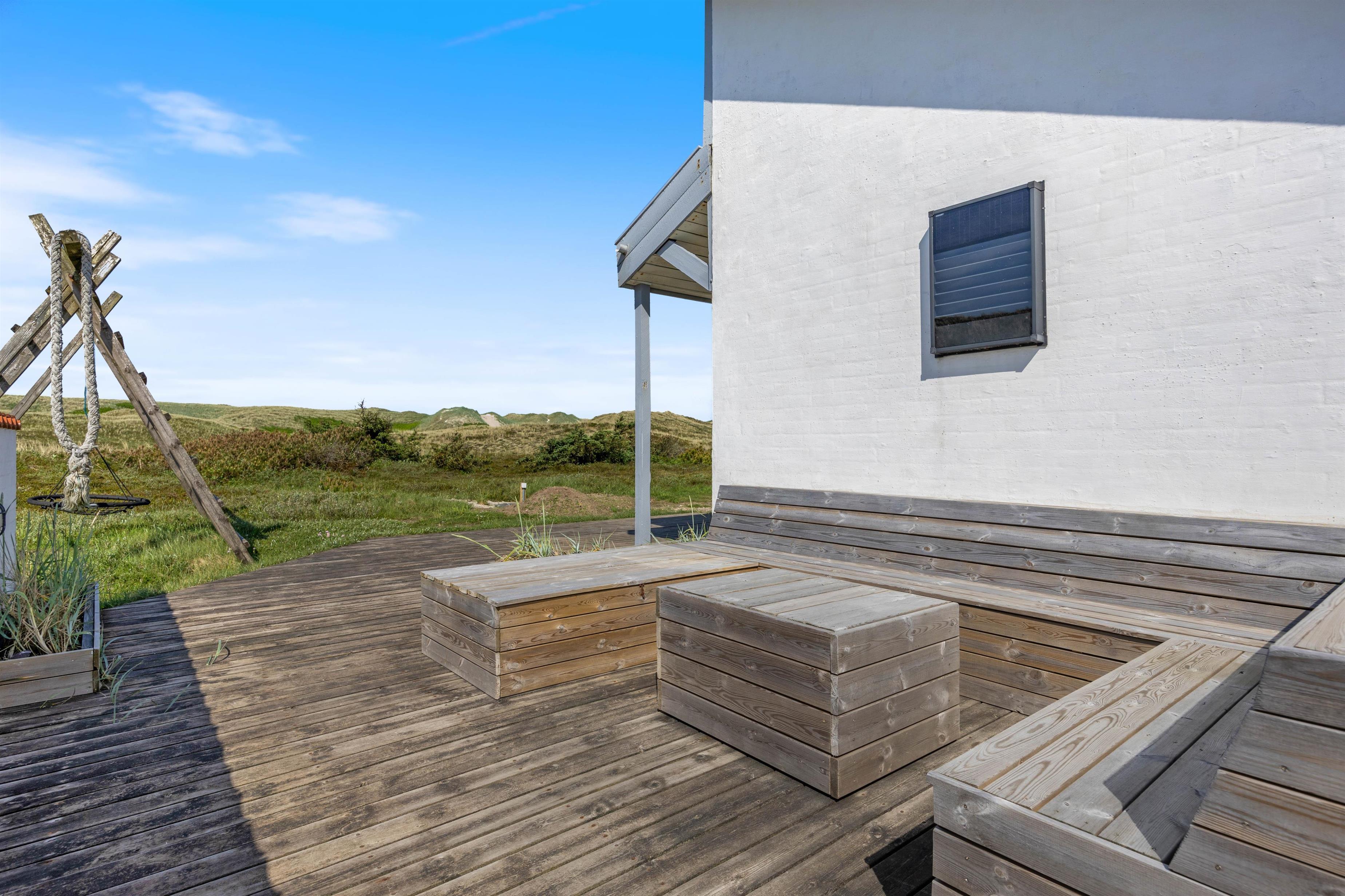 Feriehuset på Mågedalen 77 i Houvig ligger på en 2500 m2 stor klitgrund og giver derfor jeres børn masser af plads til at gå på opdagelse. Der er masser af terrasseplads ved feriehuset, hvoraf to dele af terrassen er overdækket, så alle kan finde deres yndlingsplads. Mens I slapper af i solen med en god bog, kan jeres børn boltre sig på gyngen. Om aftenen kan I runde en lun sommeraften af med et lækkert måltid fra grillen.