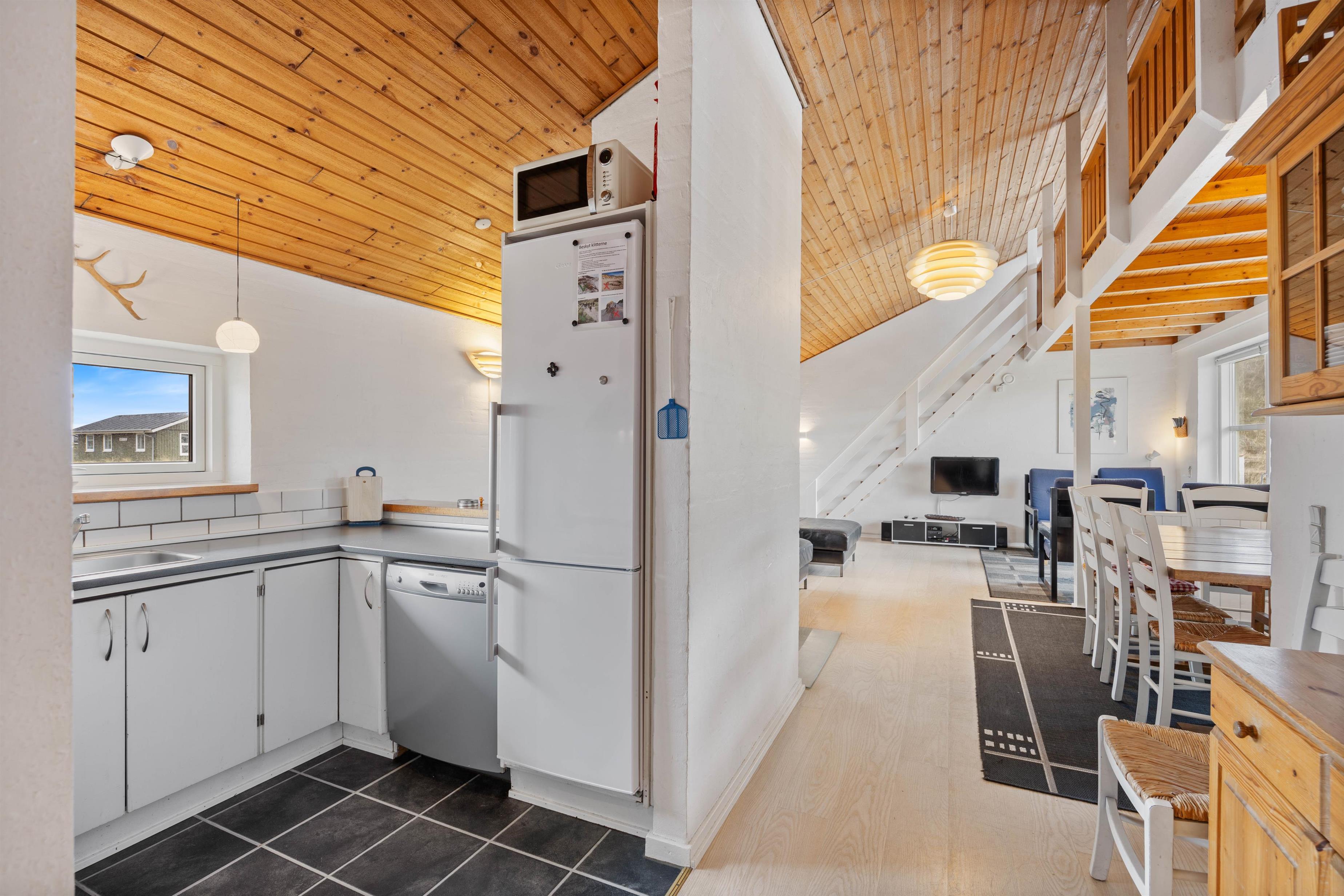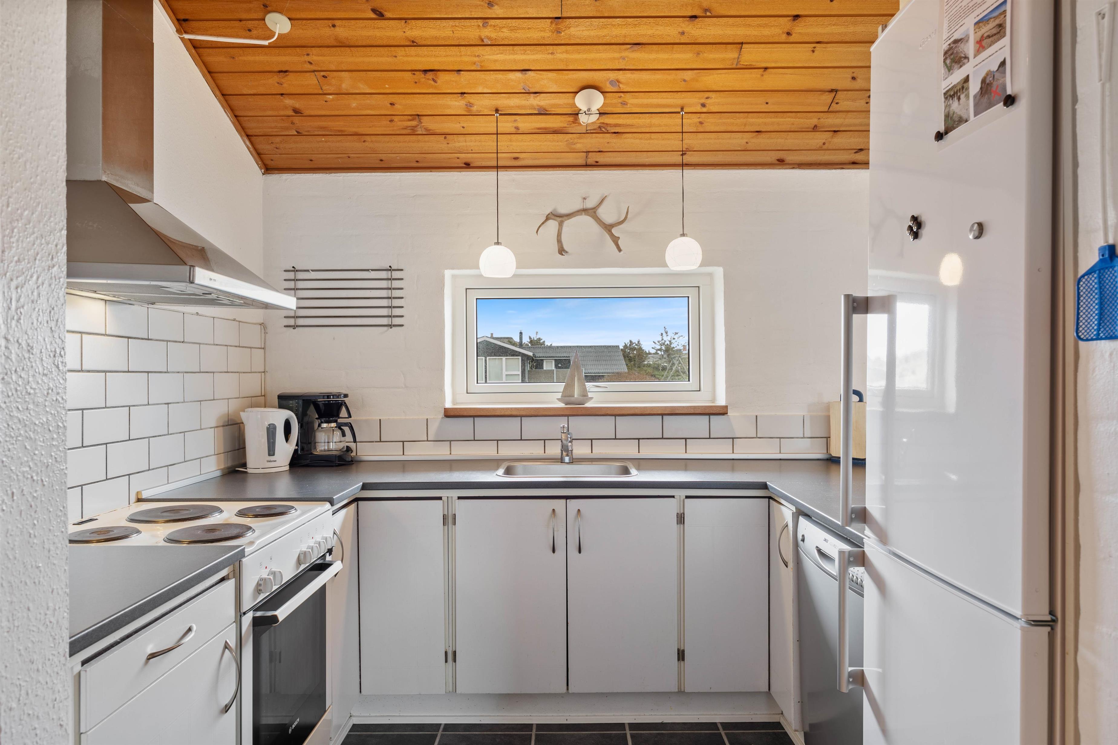 Feriehuset byder jer velkommen med en klassisk sommerhusstemning, hvor hvide vægge og træpaneler i loftet får dig til at føle jer hjemme. I kan holde en dejlig ferie med op til 8 personer på feriehusets ca. 120 m2. Omdrejningspunktet for jeres ferie bliver helt sikkert det store opholdsrum, som kombinerer køkken, stue og spiseplads. Her kan I planlægge jeres næste ferieaktiviteter eller tilbringe gode spilaftener sammen. Brændeovnen med sin hyggelige varme og knitrende ild skaber en hyggelig atmosfære. Den energibesparende luft-til-luft-varmepumpe, der er installeret i feriehuset, sørger for en konstant behagelig rumtemperatur.