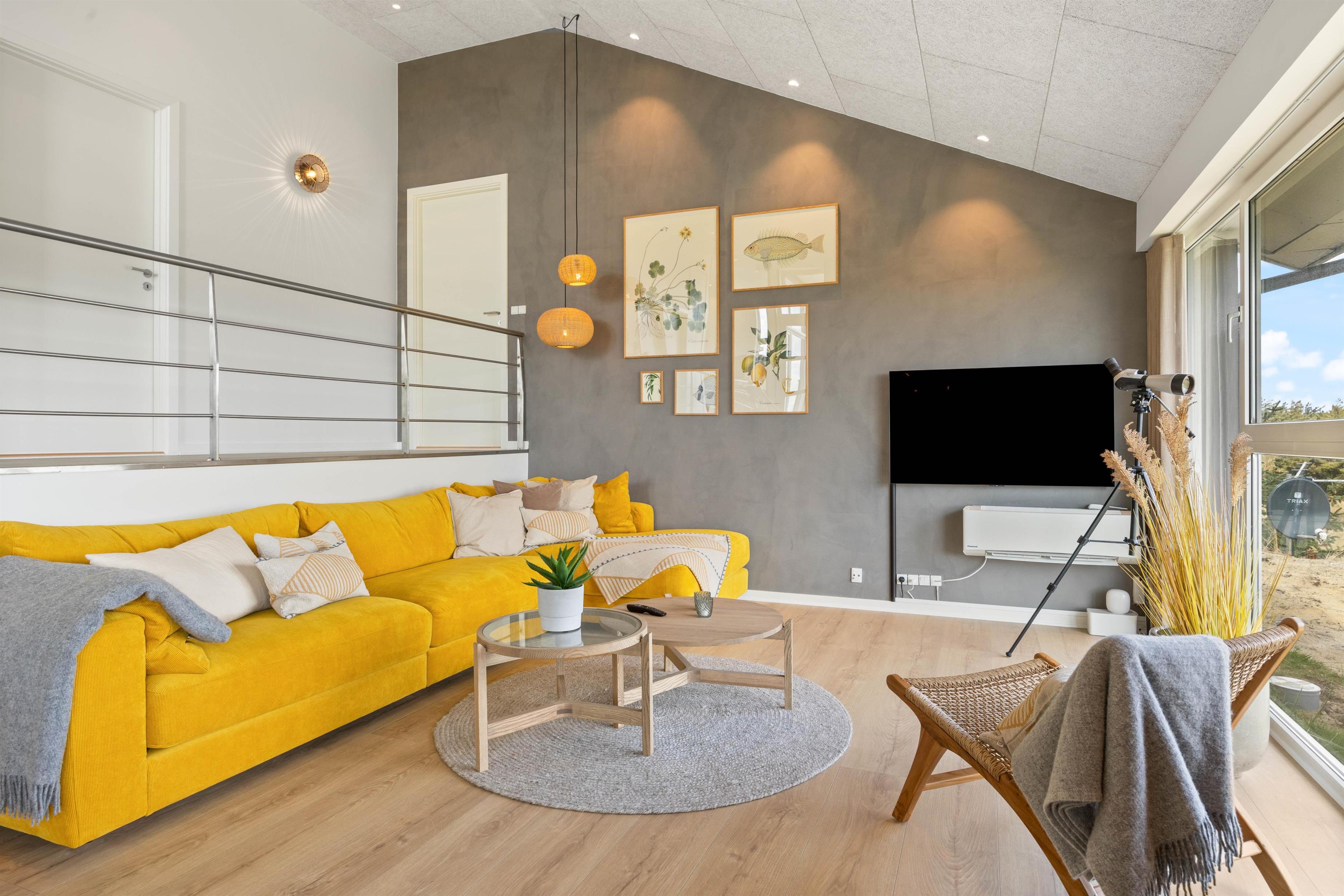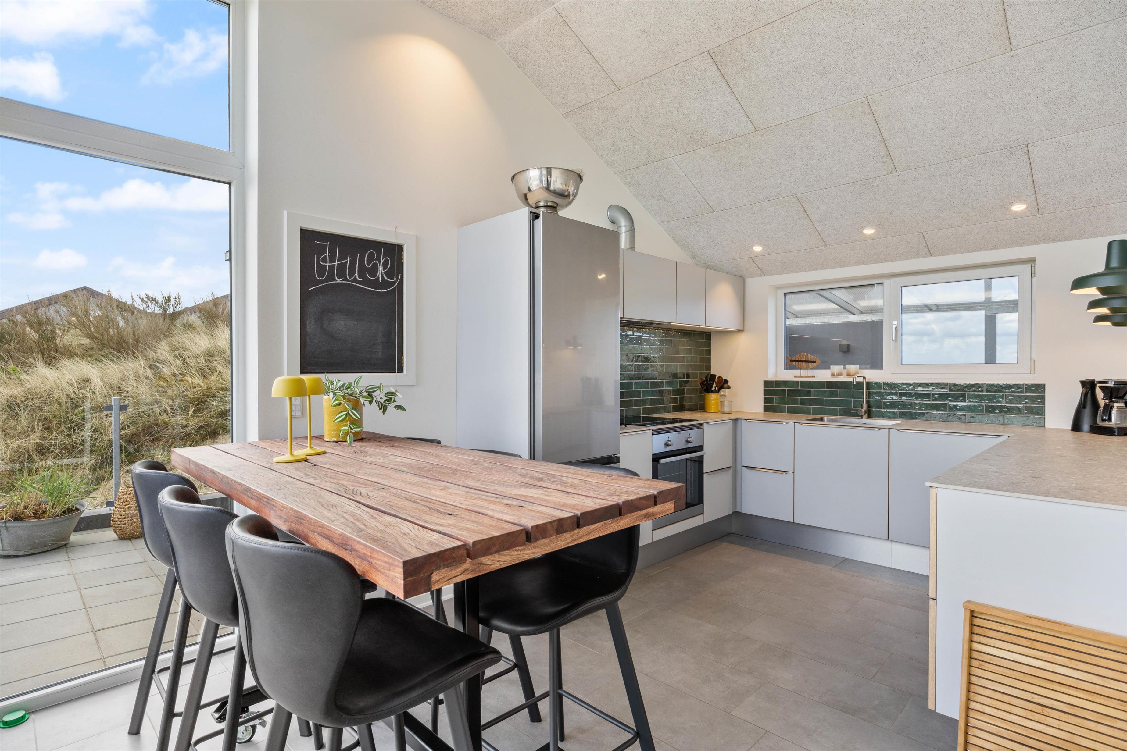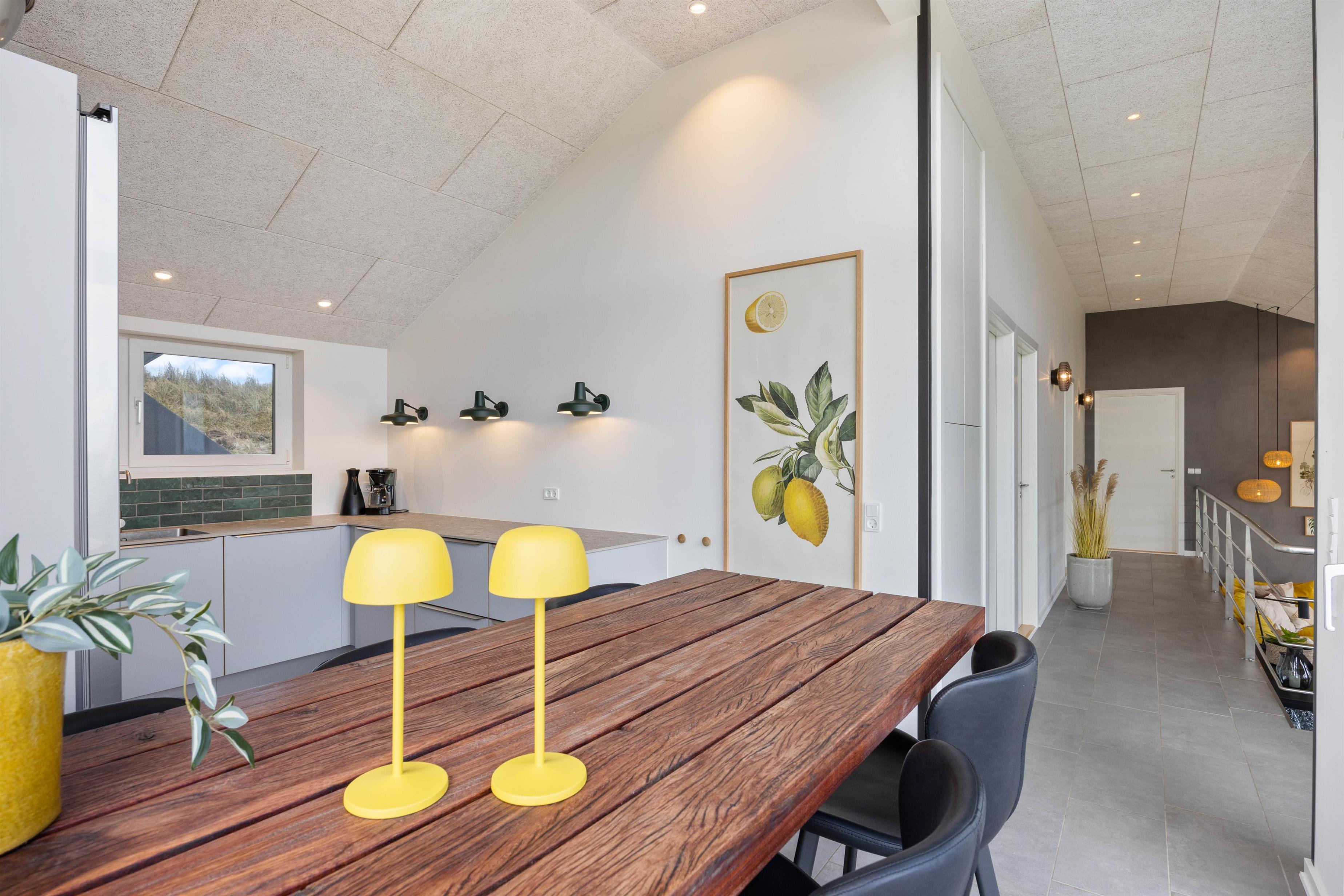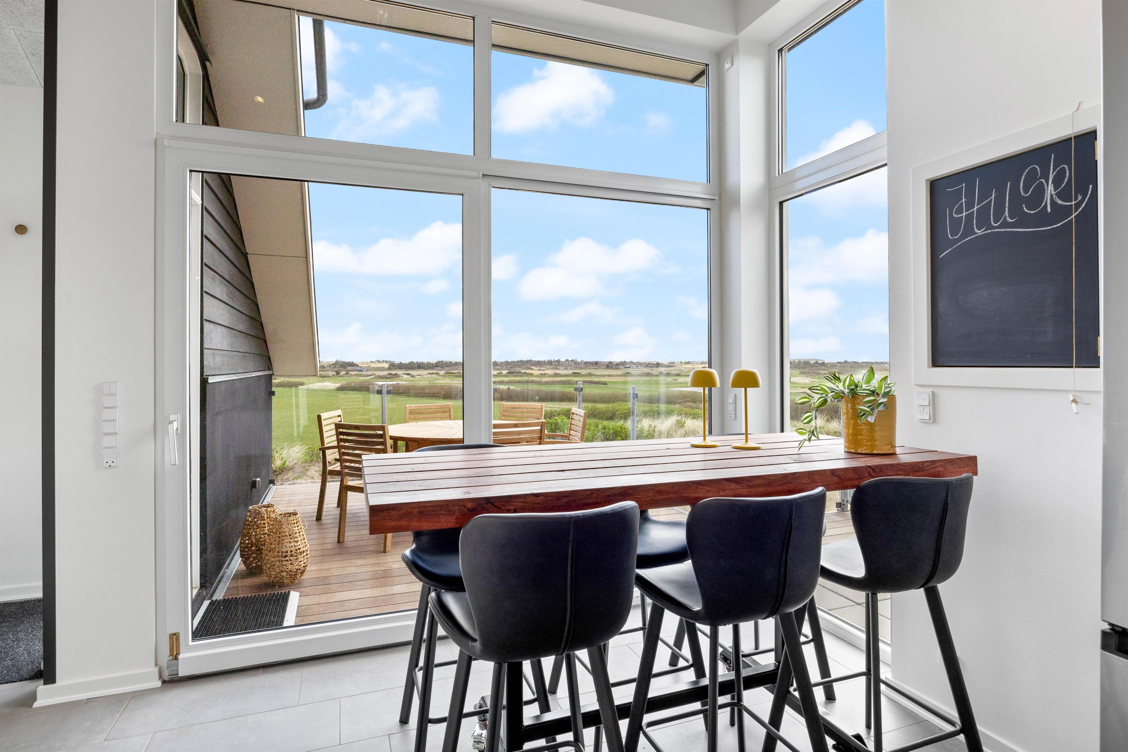Indenfor byder Regnspovedalen 2 jer velkommen til en moderne og stilfuld sommerhusstemning. Når I kommer ind, fører en smuk smedet jernstrappe jer ned i den kombinerede opholds- og spisestue, hvor I også finder husets brændeovn. I sofaen kommer I uden tvivl til at tilbringe mange ferietimer sammen, hvor I sidder og slapper af med en god bog eller film, mens I nyder de knitrende flammer i brændeovnen og kigger ud på landskabet i Houvig. Om aftenen kan I kigge ud på stjernehimlen gennem de store vinduespartier, som også bidrager til et fantastisk lysindfald i ferieboligen om dagen.