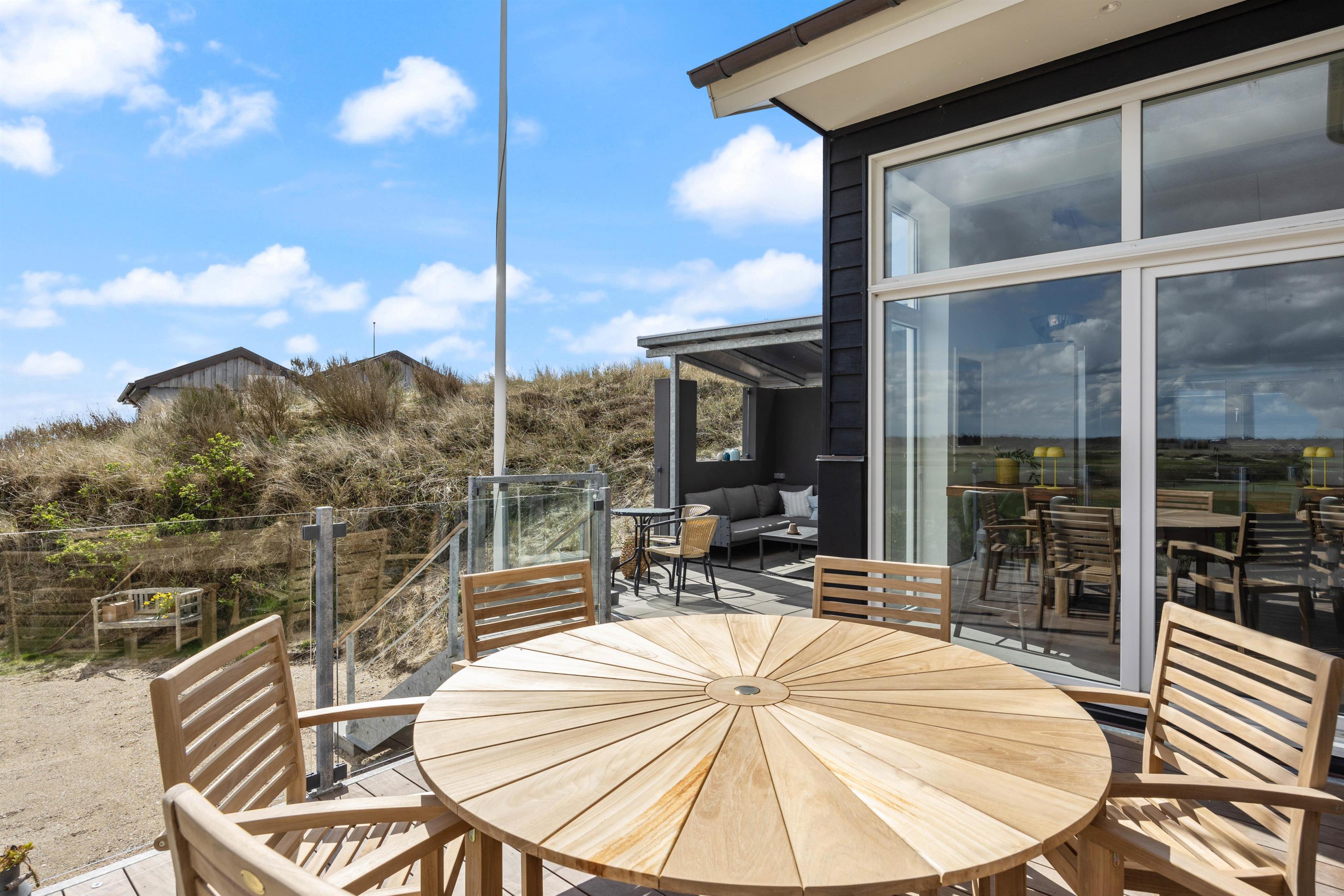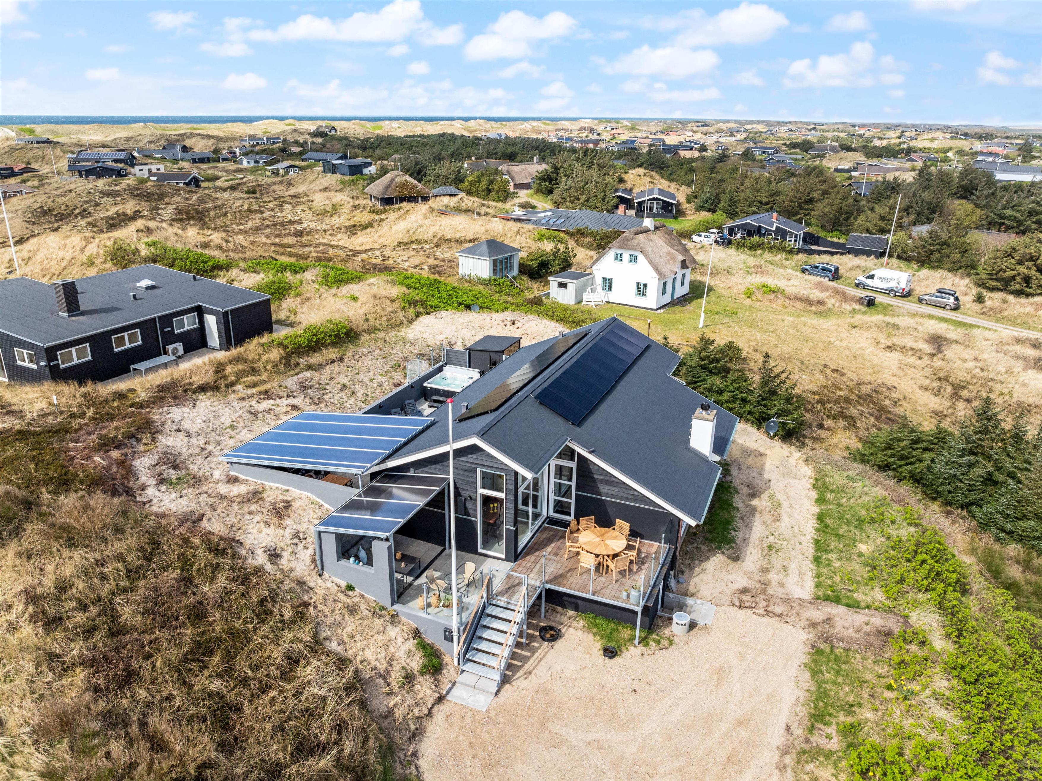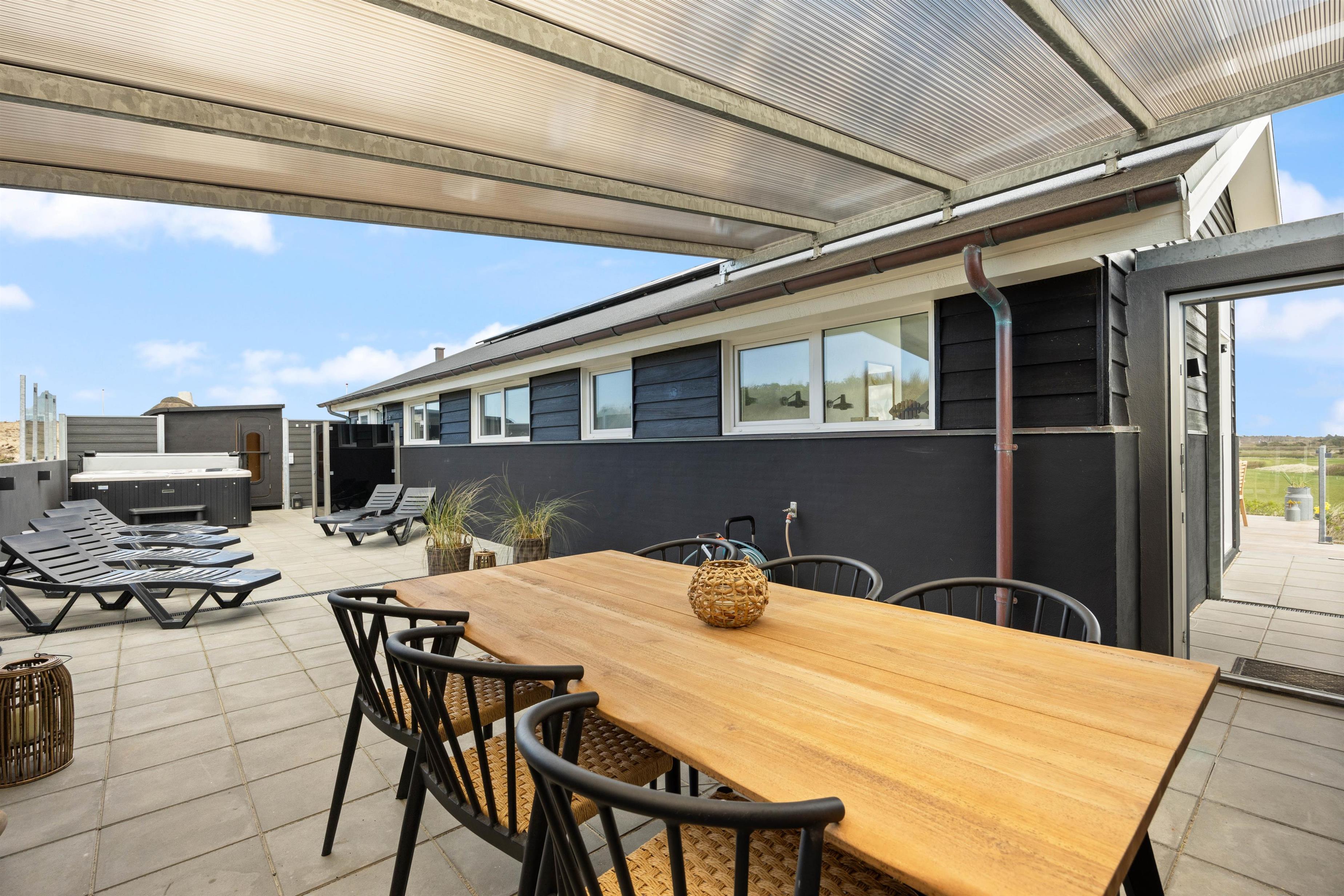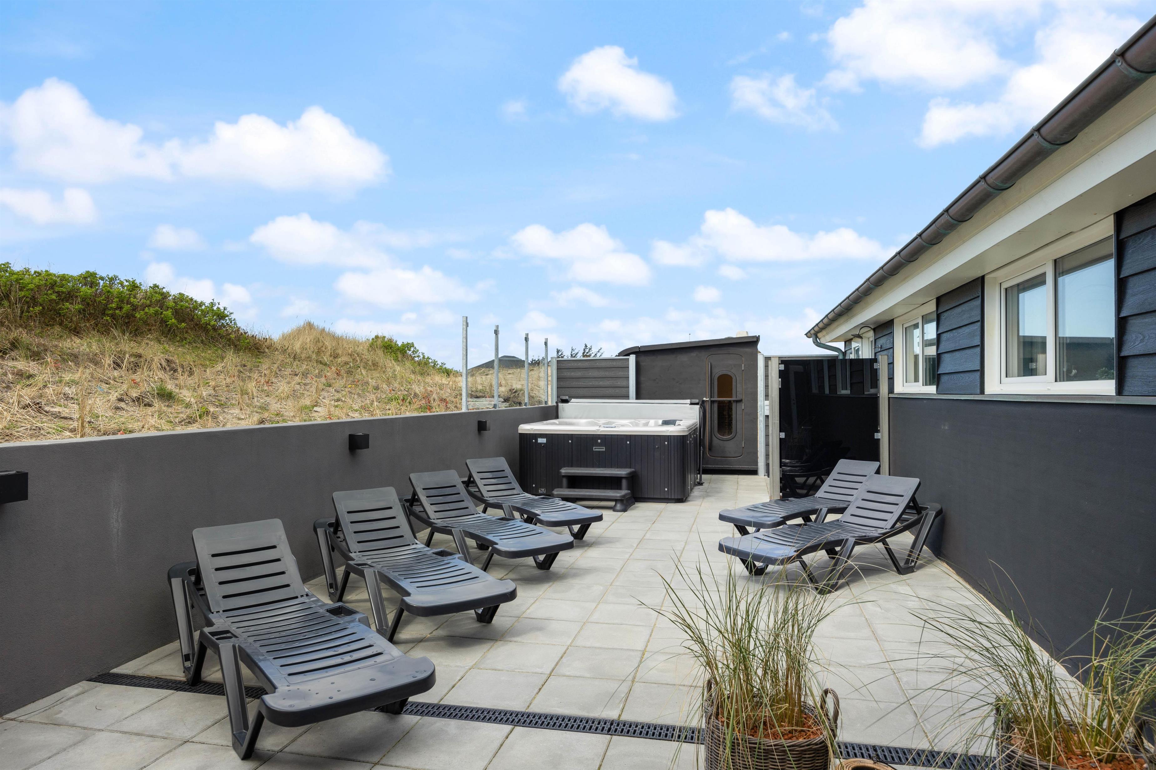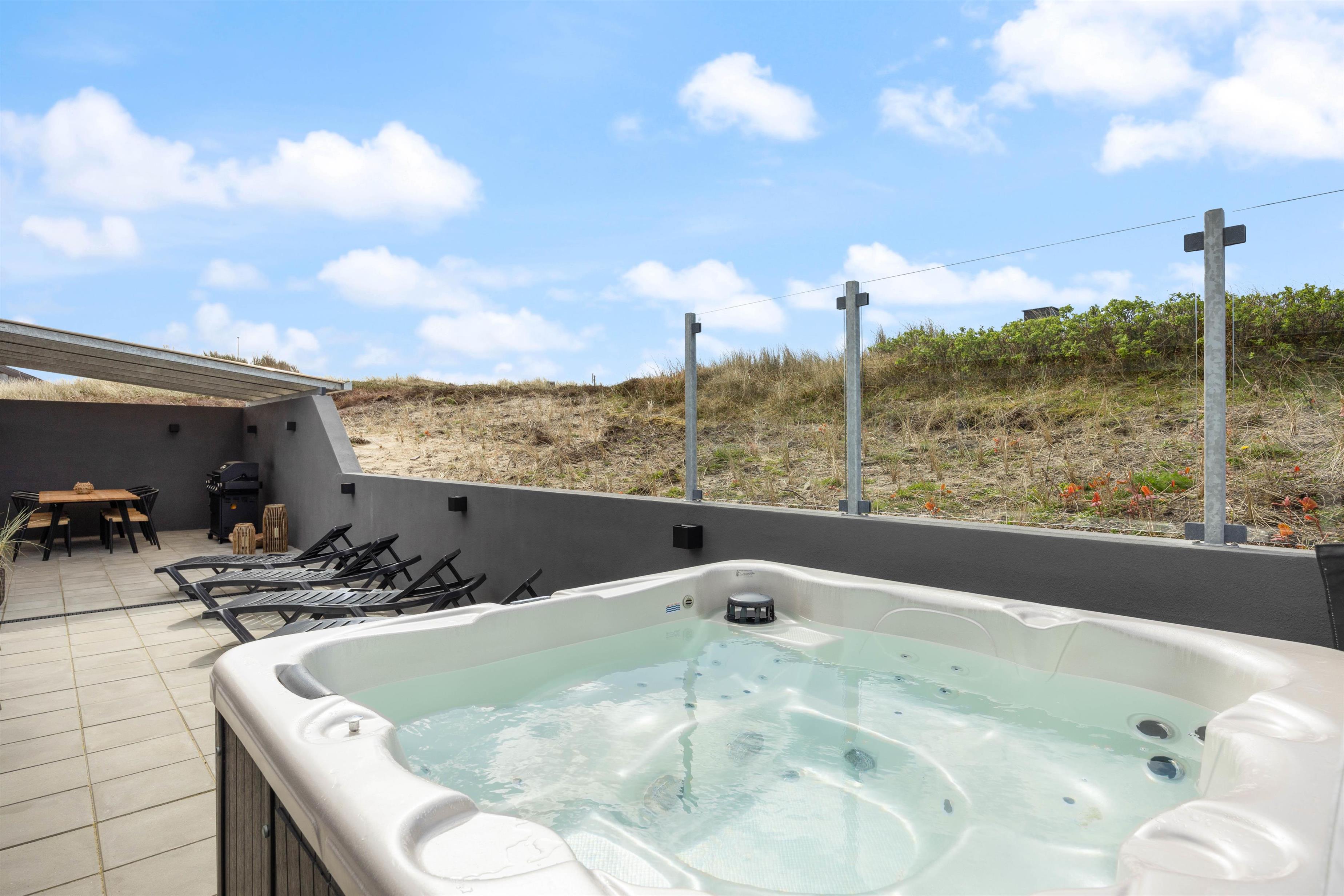 Nogle af ferieboligens absolutte highlights er uden tvivl den udendørs spa og udesaunaen på den læfyldte terrasse. Her kan man rigtig sidde og slappe af og lade batterierne op til en ny, spændende feriedag. Efter en lang gåtur på stranden kan I skylle fødderne af under udebruseren, som er tilgængelig fra april til november.