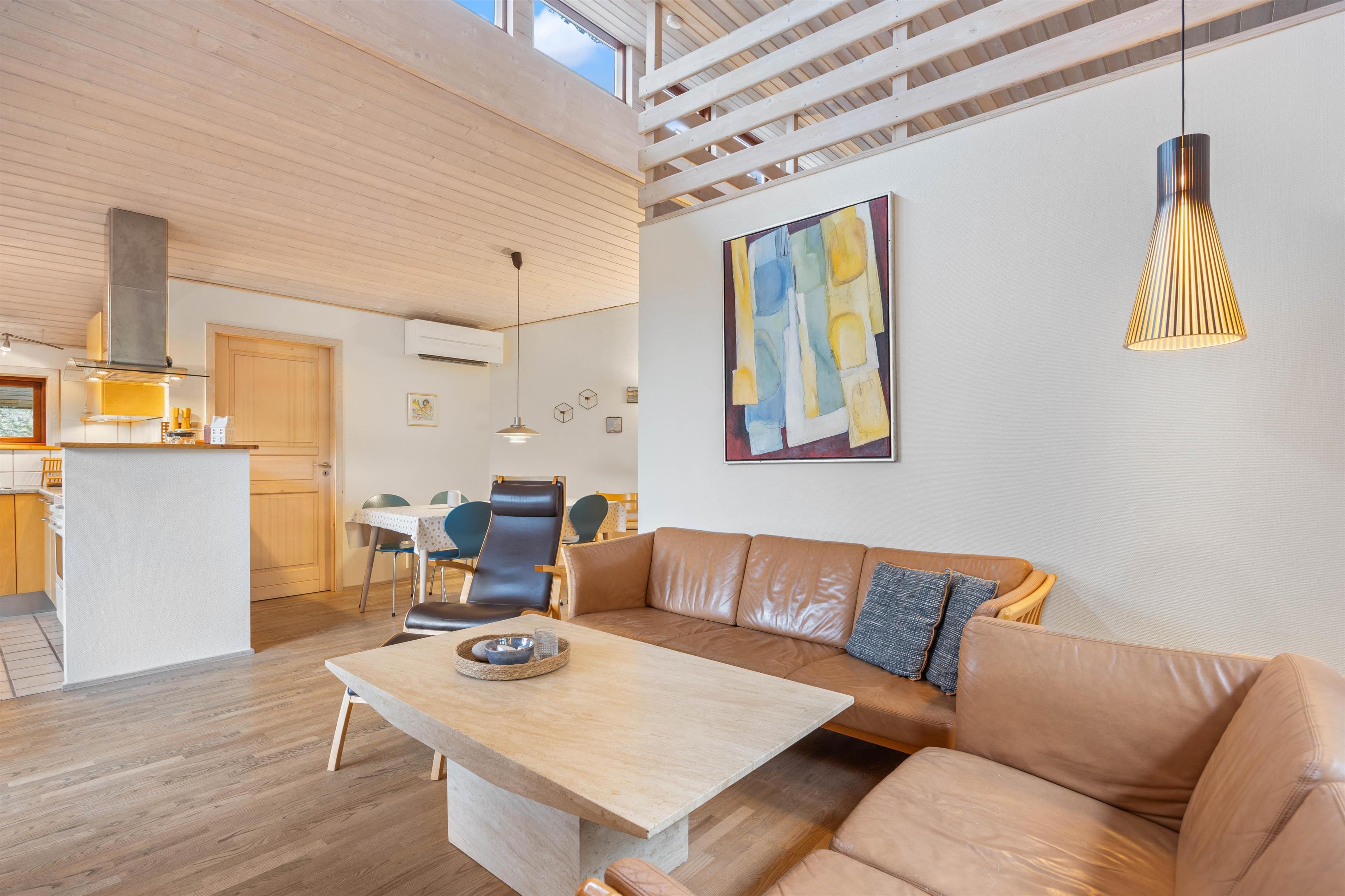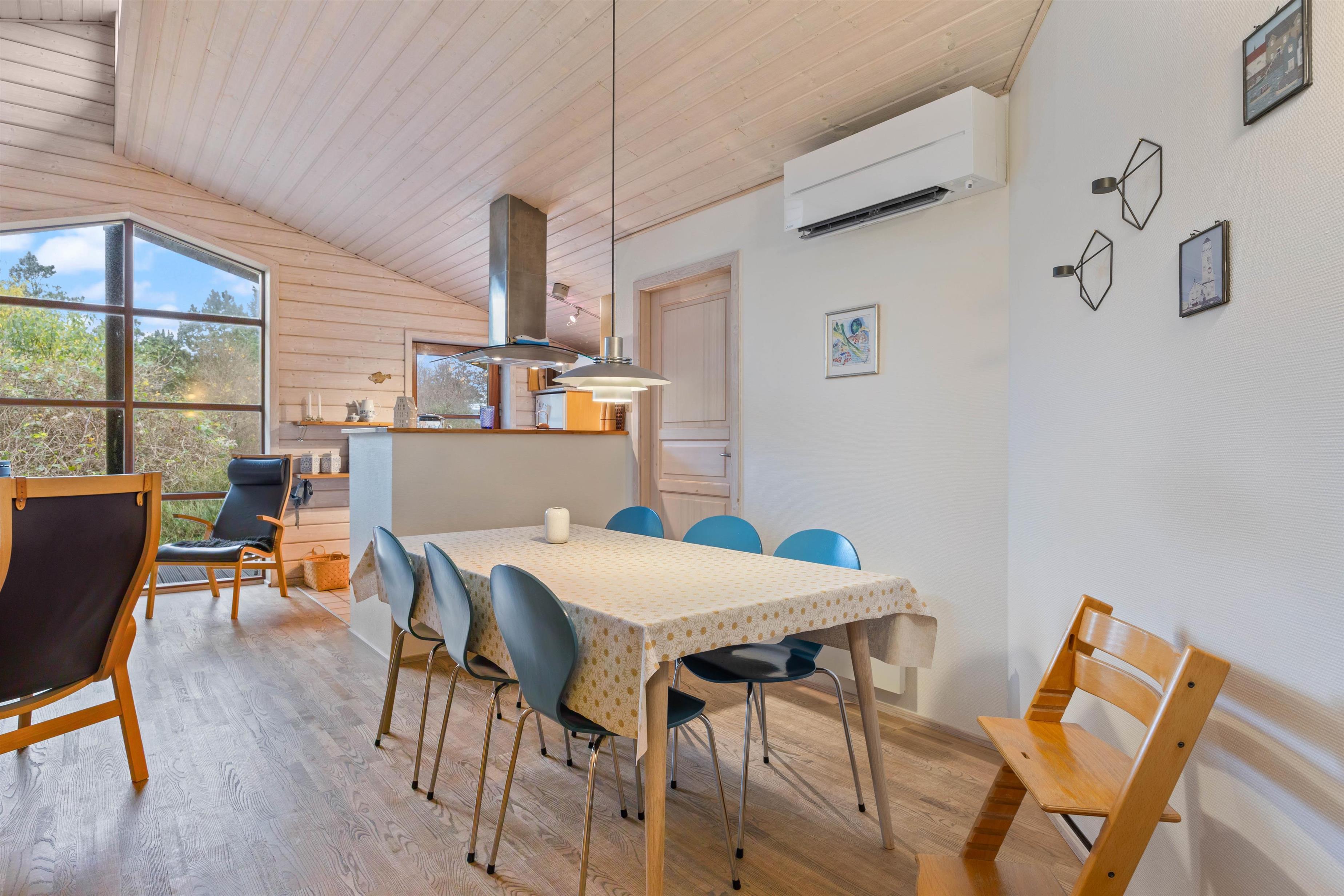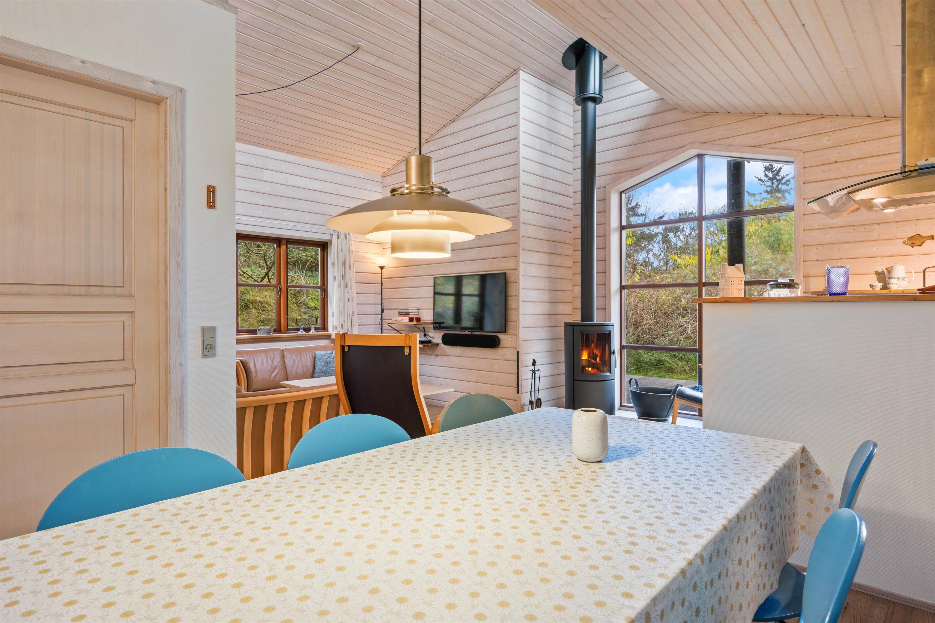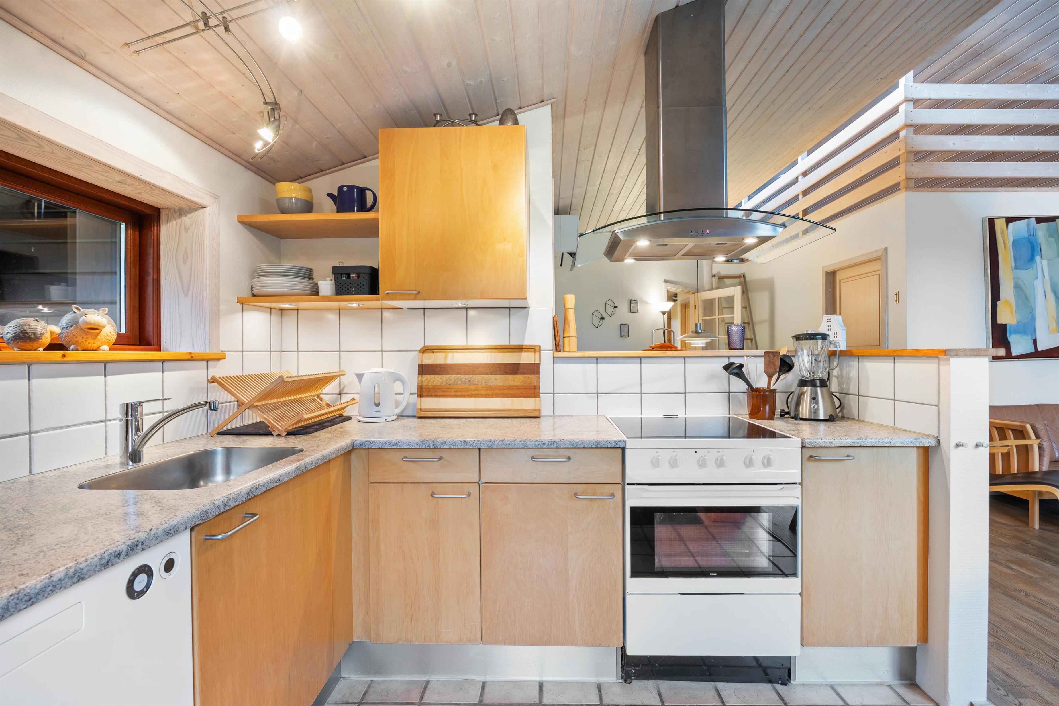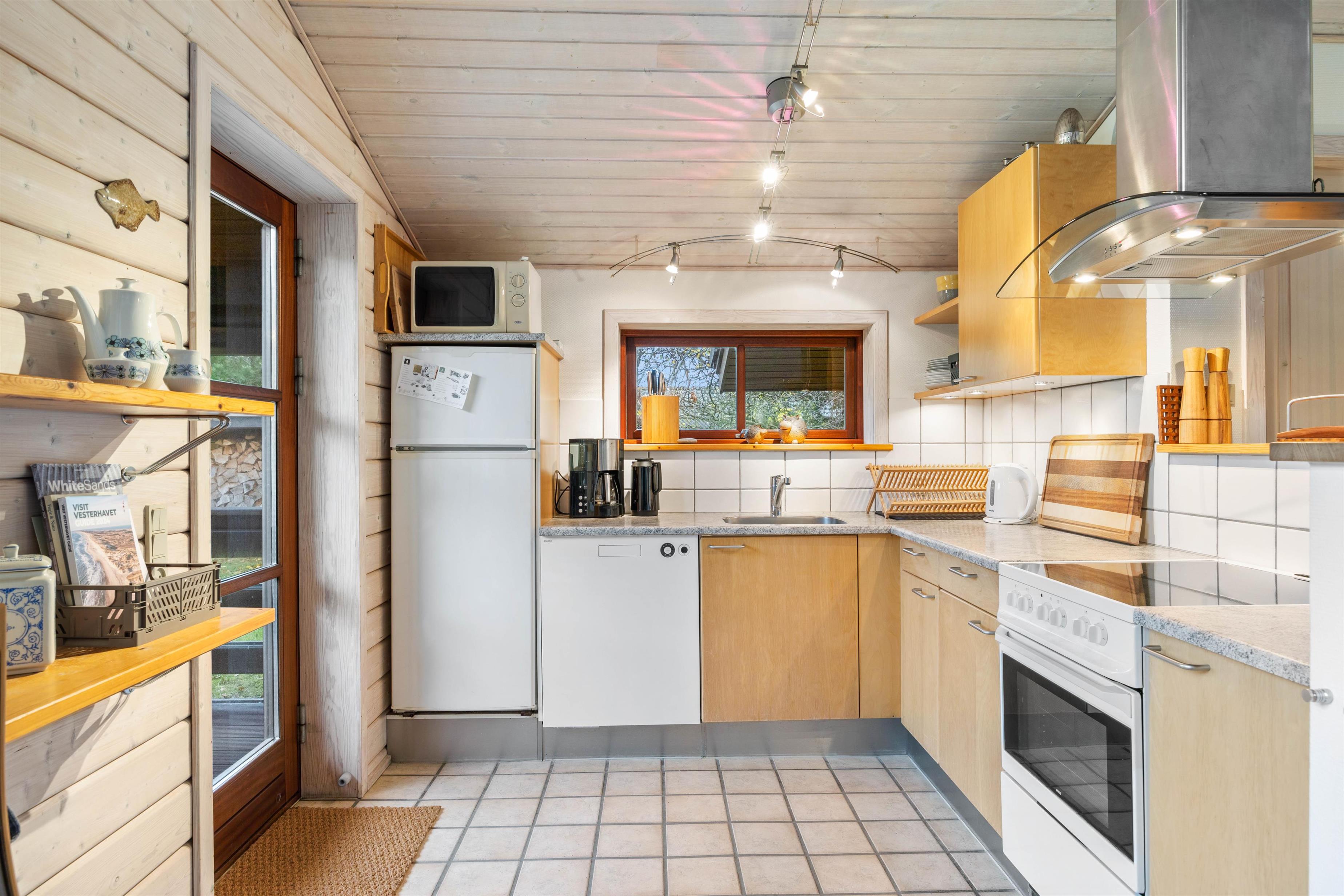 Feriehuset byder jer velkommen med et veludstyret og godt indrettet køkken, hvor I kan tilberede gode måltider, til hele familien. Her finder I også en opvaskemaskine, som tager sig af den kedelige opvask. I kan i stedet bruge tiden på at planlægge de næste dages ferieaktiviteter eller arrangere en sjov spilleaften sammen. På de lidt køligere aftener, kan det helt klart anbefales at tænde op for feriehusets brændeovn, som bidrager til den helt rigtige feriestemning. Køkkenet er udstyret med gulvvarme, og huset har en energibesparende luft-til-luft varmepumpe, der sørger for et behageligt indeklima hele året rundt.