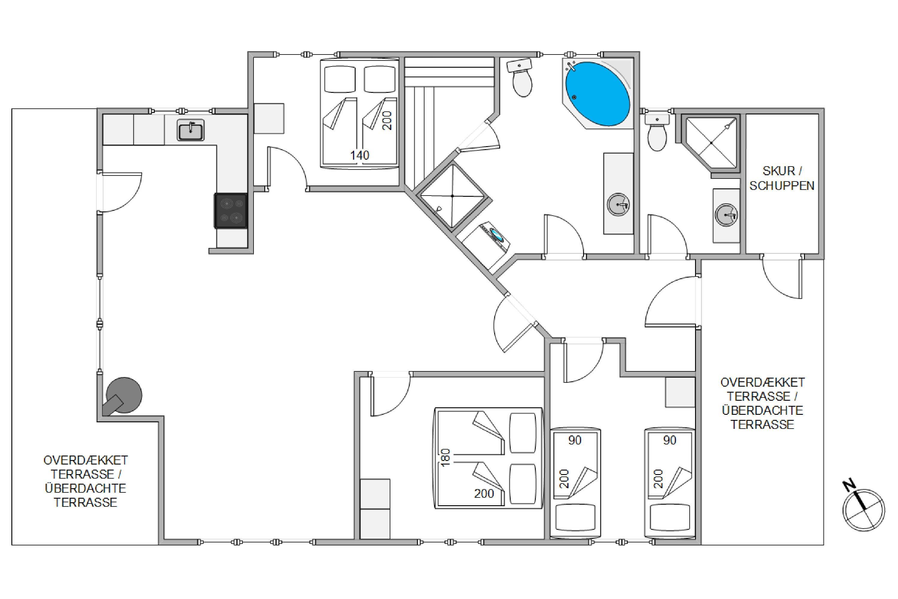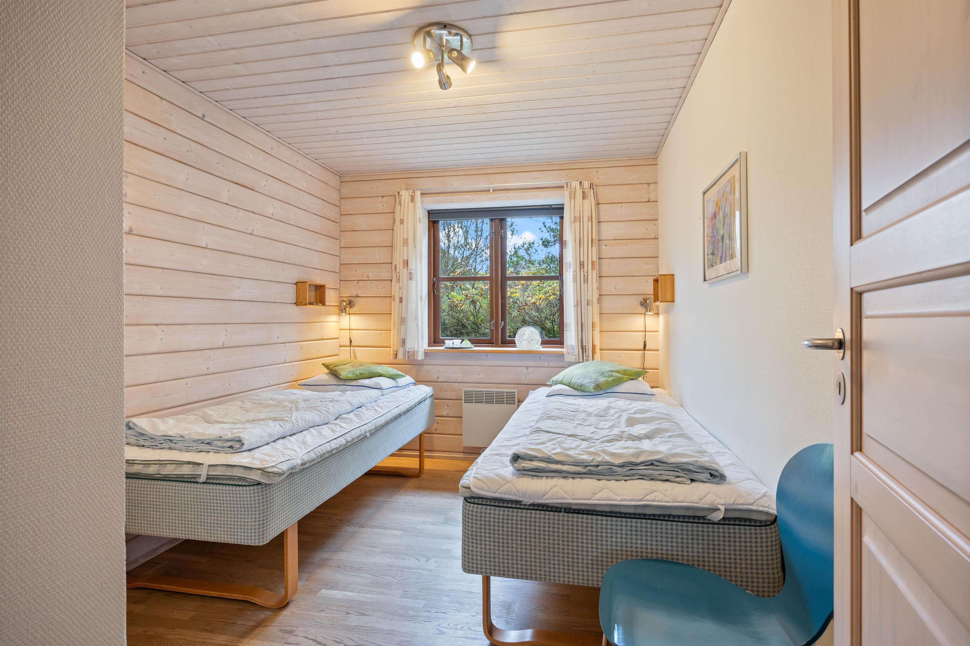 Der er tre gode soveværelser, som alle er hyggeligt og godt indrettet. To af soveværelserne er hver indrettet med en dobbeltseng og det sidste soveværelse er indrettet med to enkeltsenge. De to badeværelser er begge udstyret med gulvvarme, så I undgår kolde fødder om morgenen. Det ene af badeværelserne er ydermere indrettet med spa og sauna, så der er der rig mulighed for selvforkælelse og afslapning. Feriehuset råder også over en stor hems, hvor jeres børn kan lege.