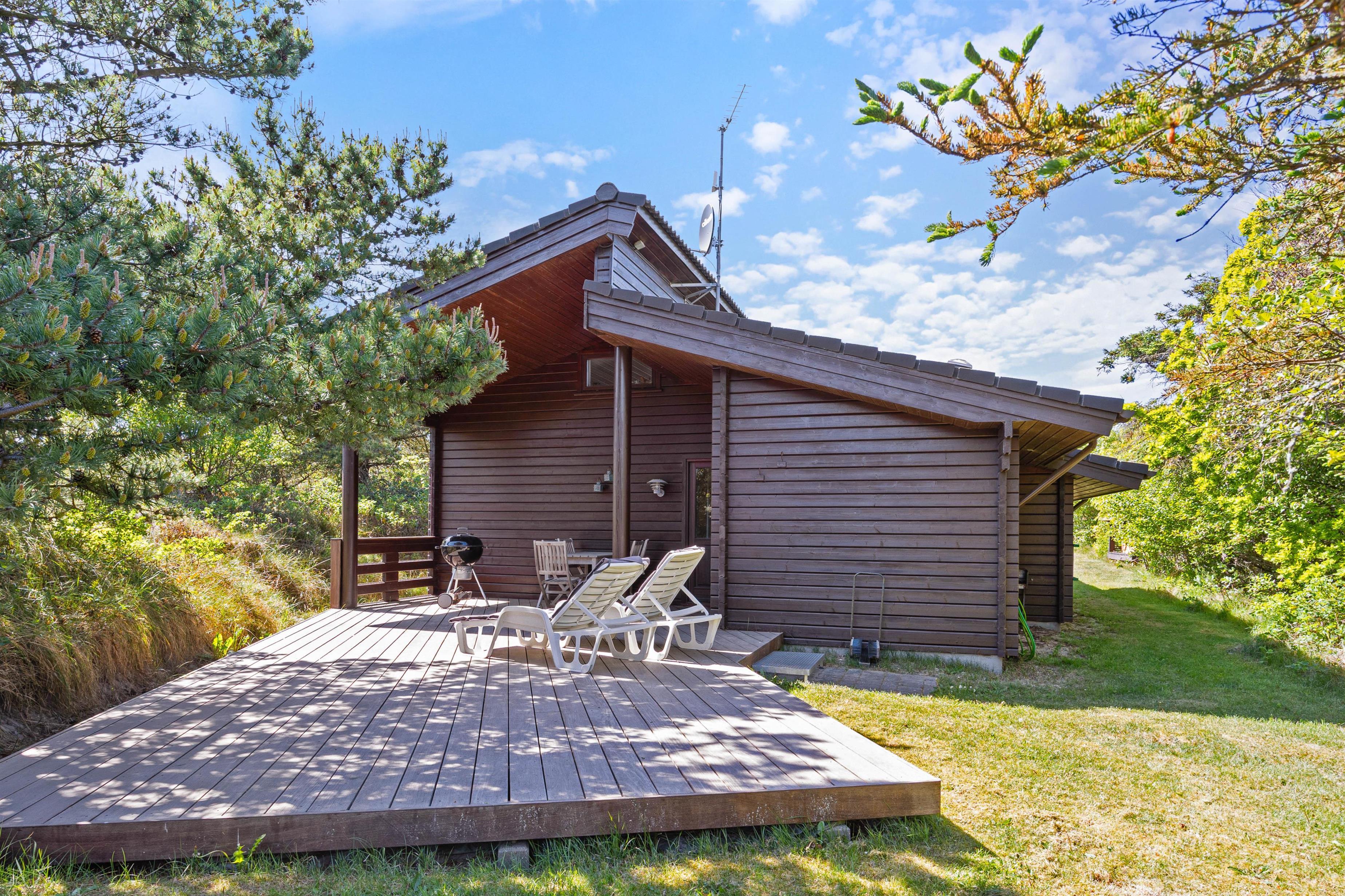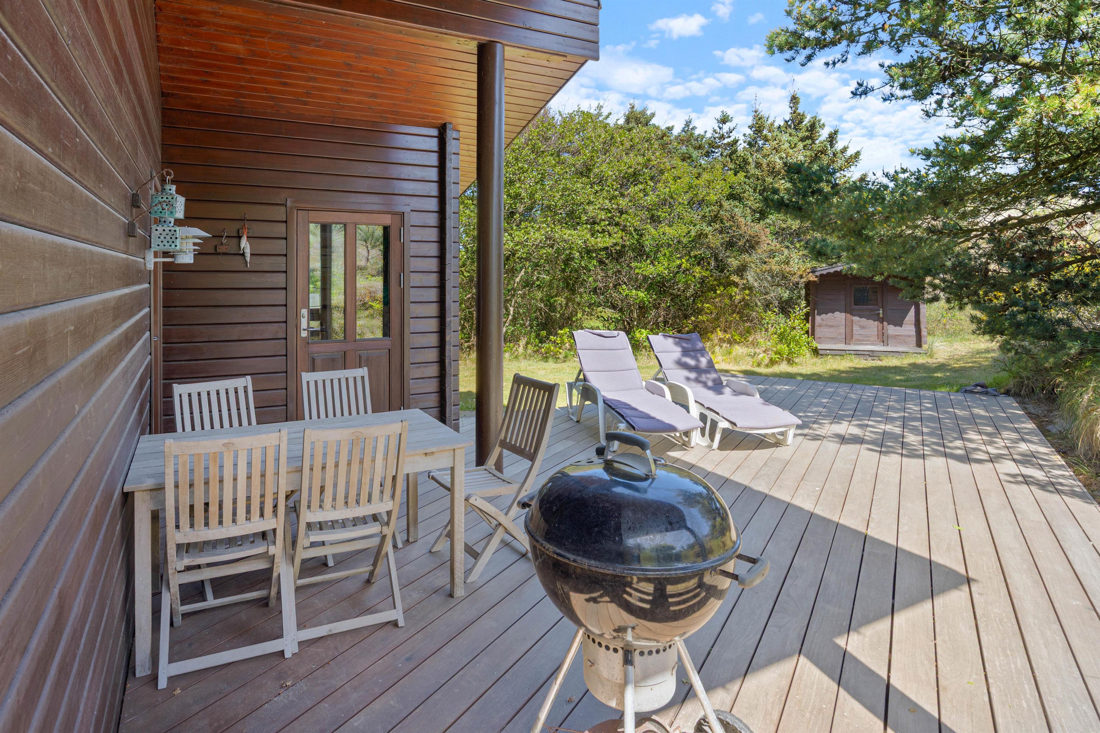 Feriehuset ligger i det smukke og betagende klitlandskab. Her har I mulighed for at slappe af i de behagelige havemøbler både på den afskærmet- og delvist overdækket terrasse. Skulle vejret ikke være med jer, kan I trække ind under halvtaget, og stadig nyde den friske Vesterhavsluft. Til aften er det oplagt at tænde op for sommerhusets grill, og tilberede et lækkert måltid mad til hele familien. Om efteråret kan I beundre den fantastiske stjernehimmel, med en kop varm chokolade og brød på grillen. Uanset årstiden er den Vestjyske Vesterhavskyst altid et besøg værd.