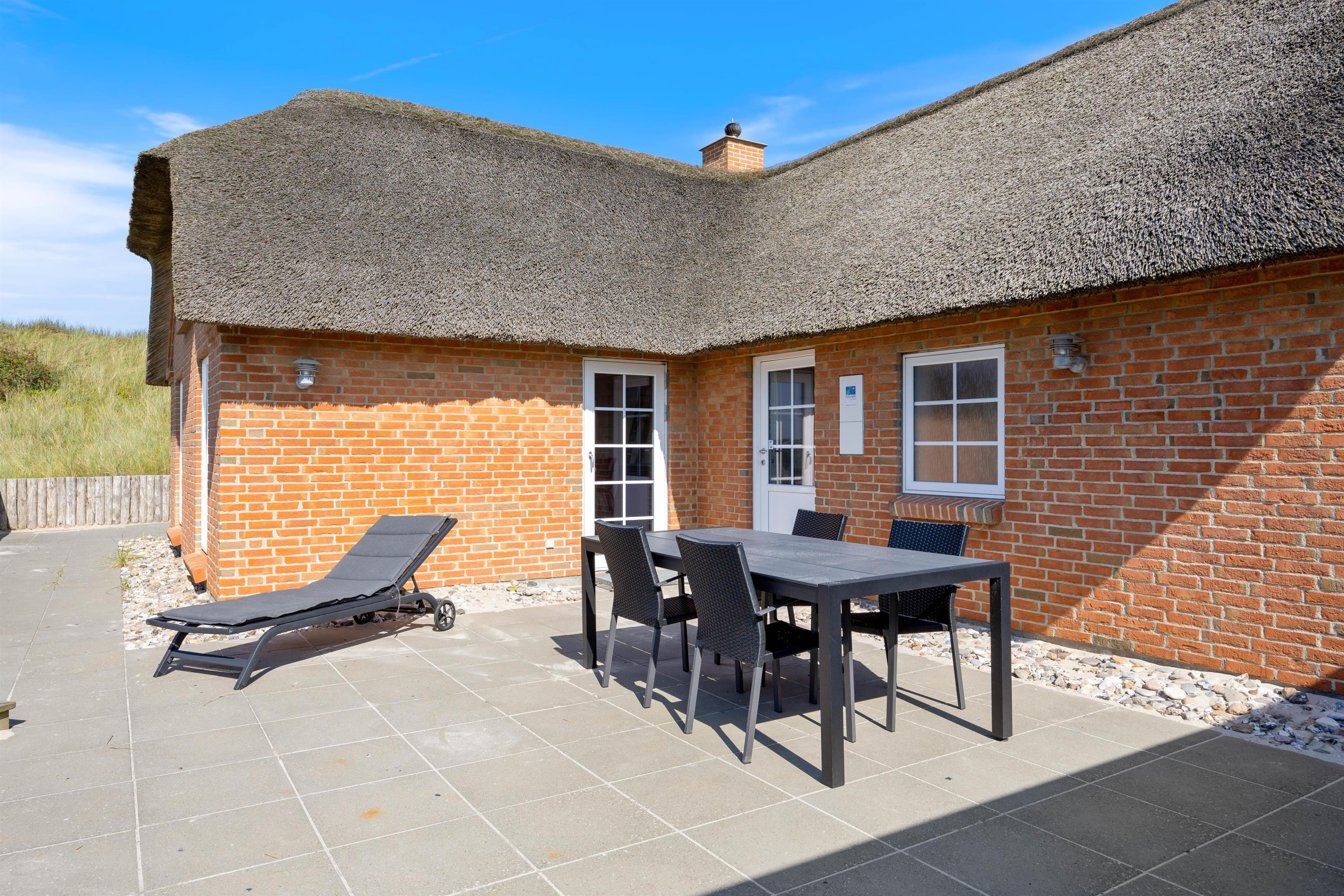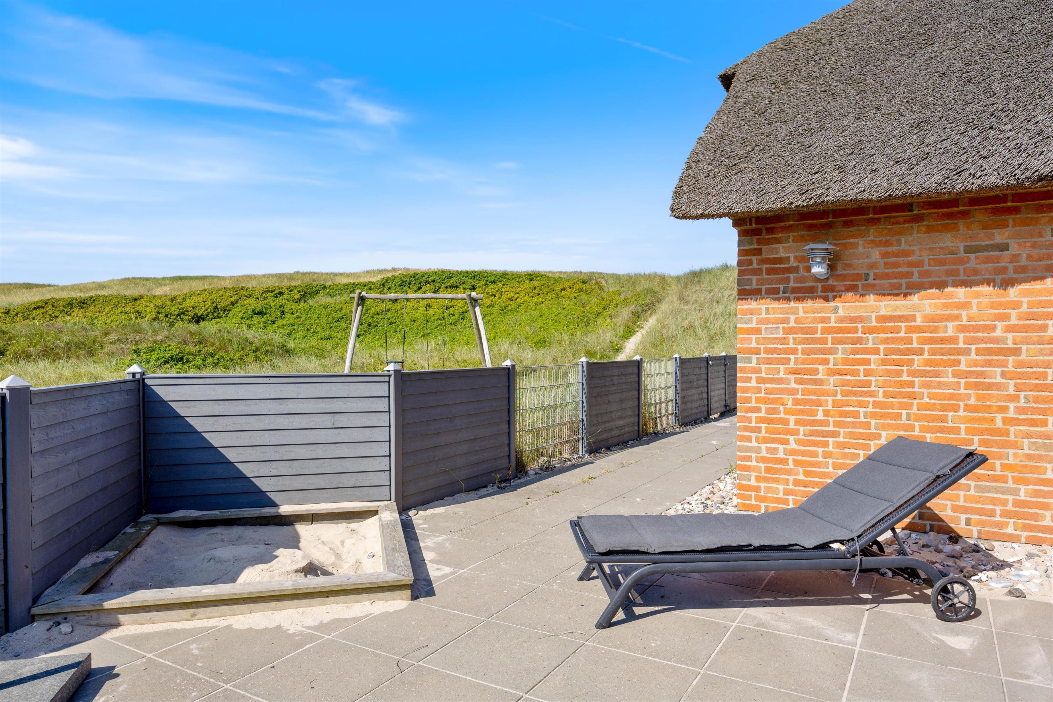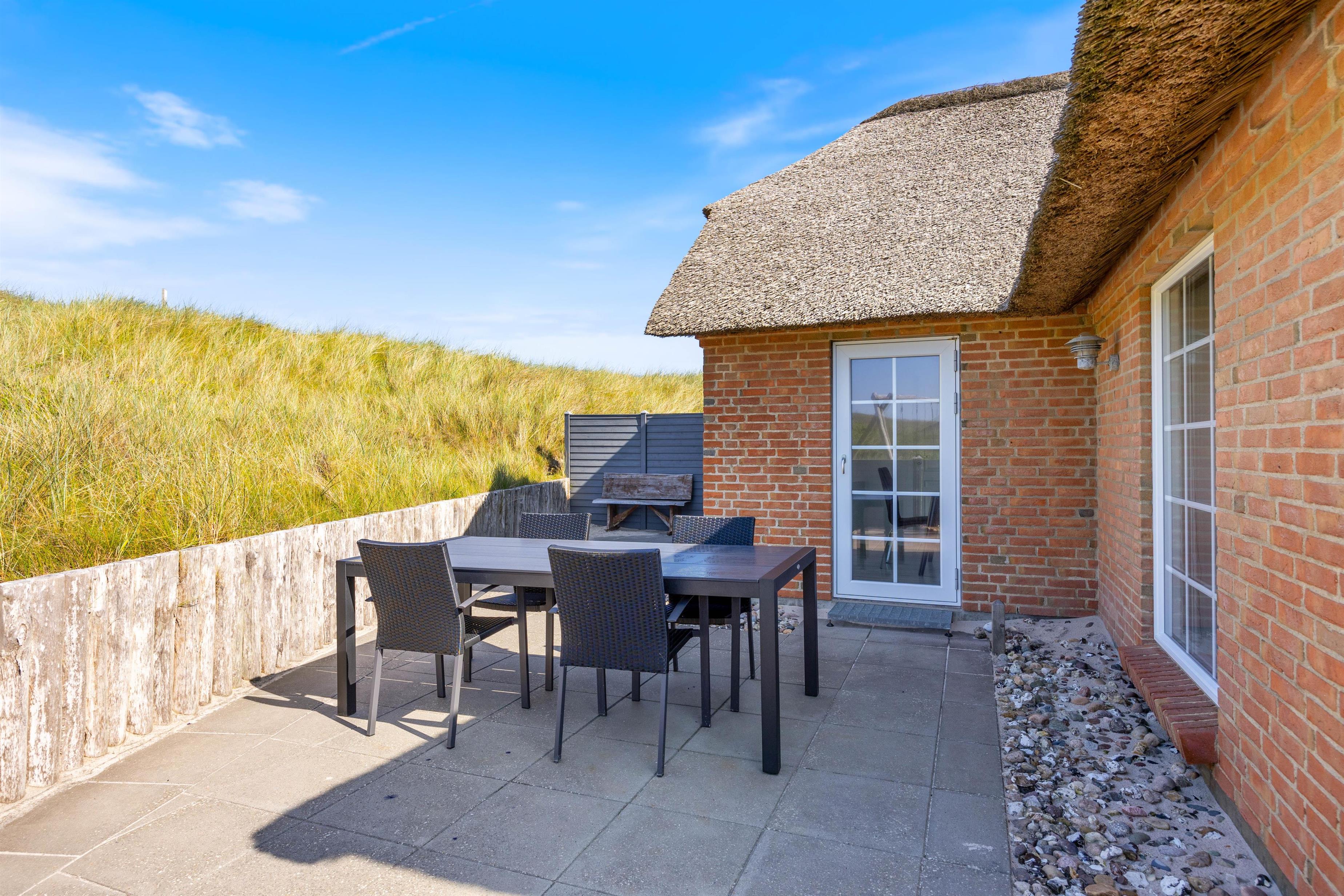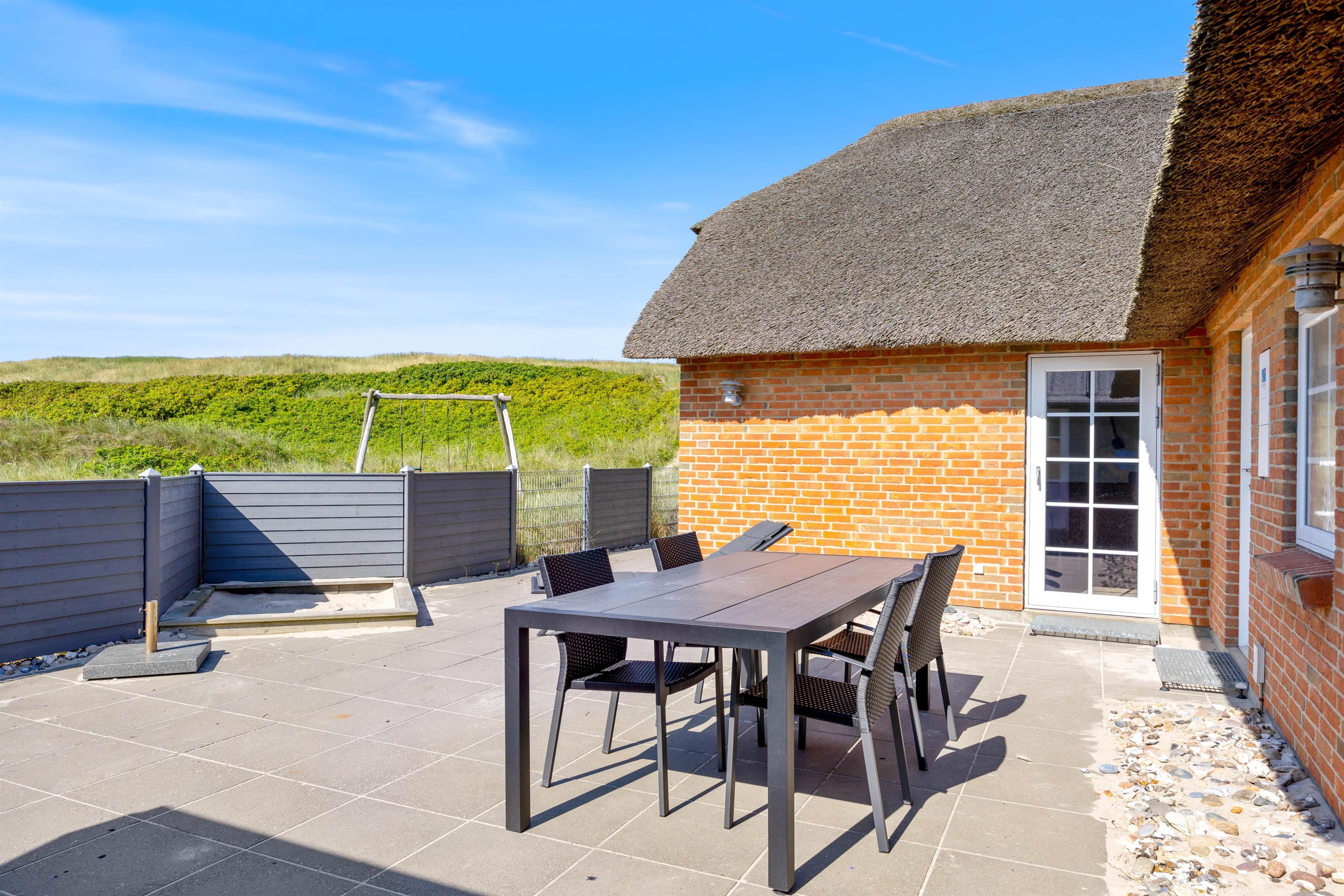 Fra stuen kommer I ud på terrassen, hvor I rigtig kan nyde den flotte udsigt ud over klitlandskabet, og hvis I hører godt efter, kan I næsten høre bølgernes brusen, mens I nyder et glas rødvin rundt om havebordet.