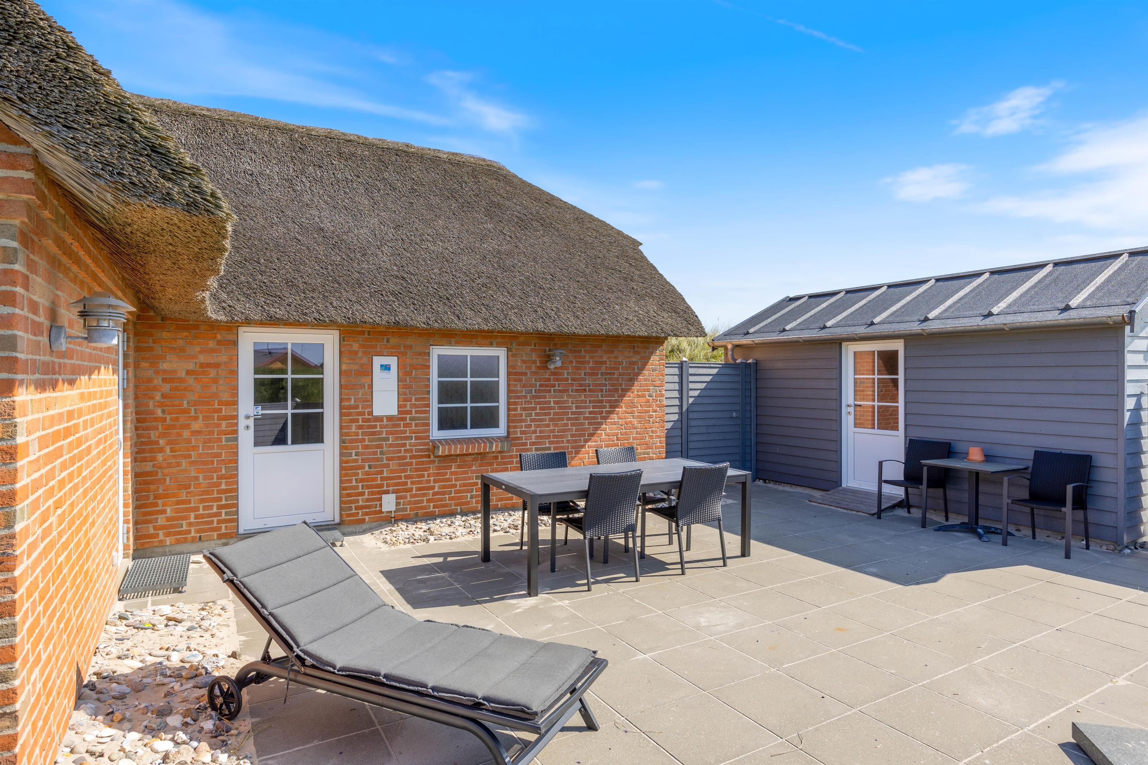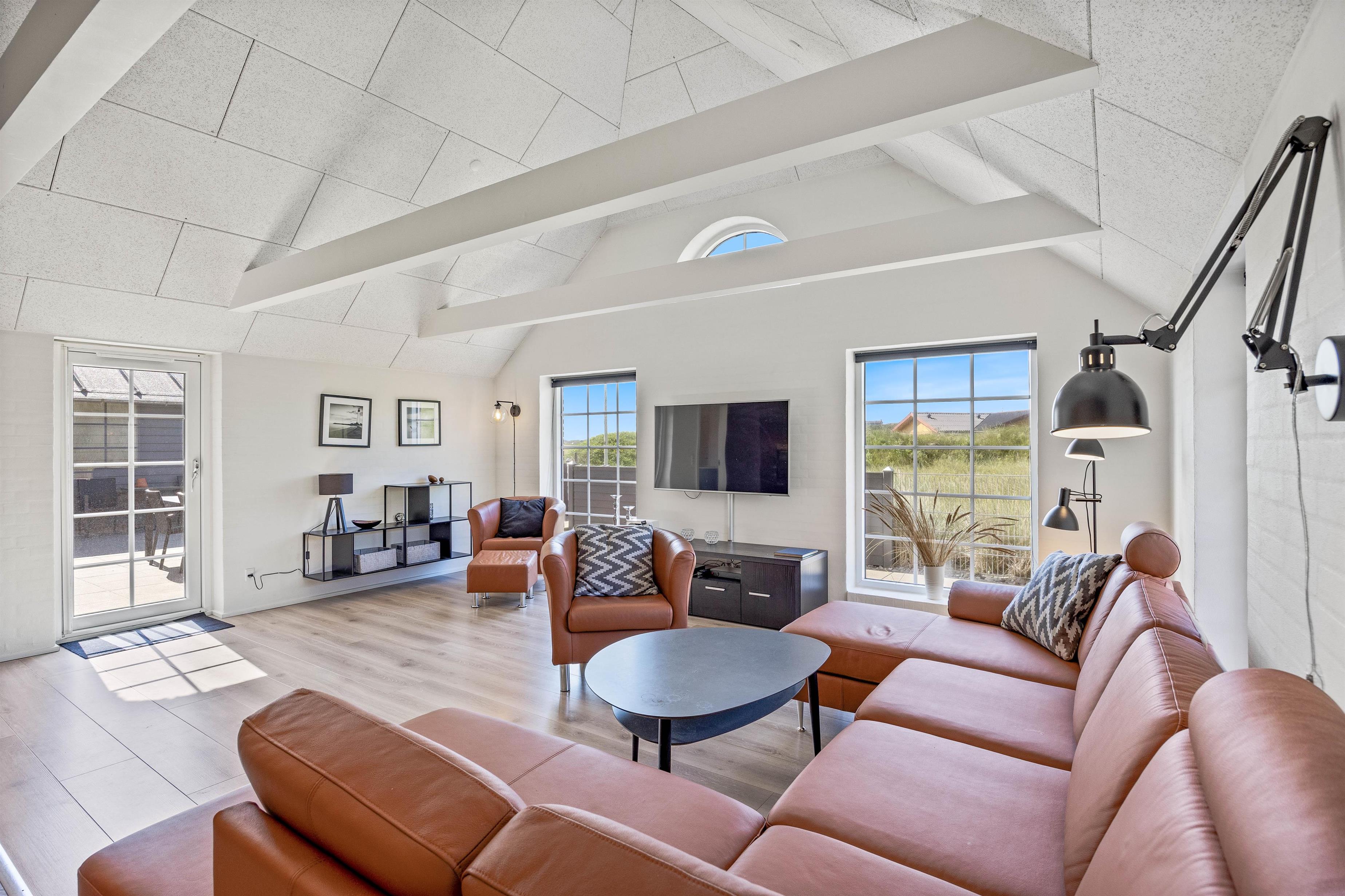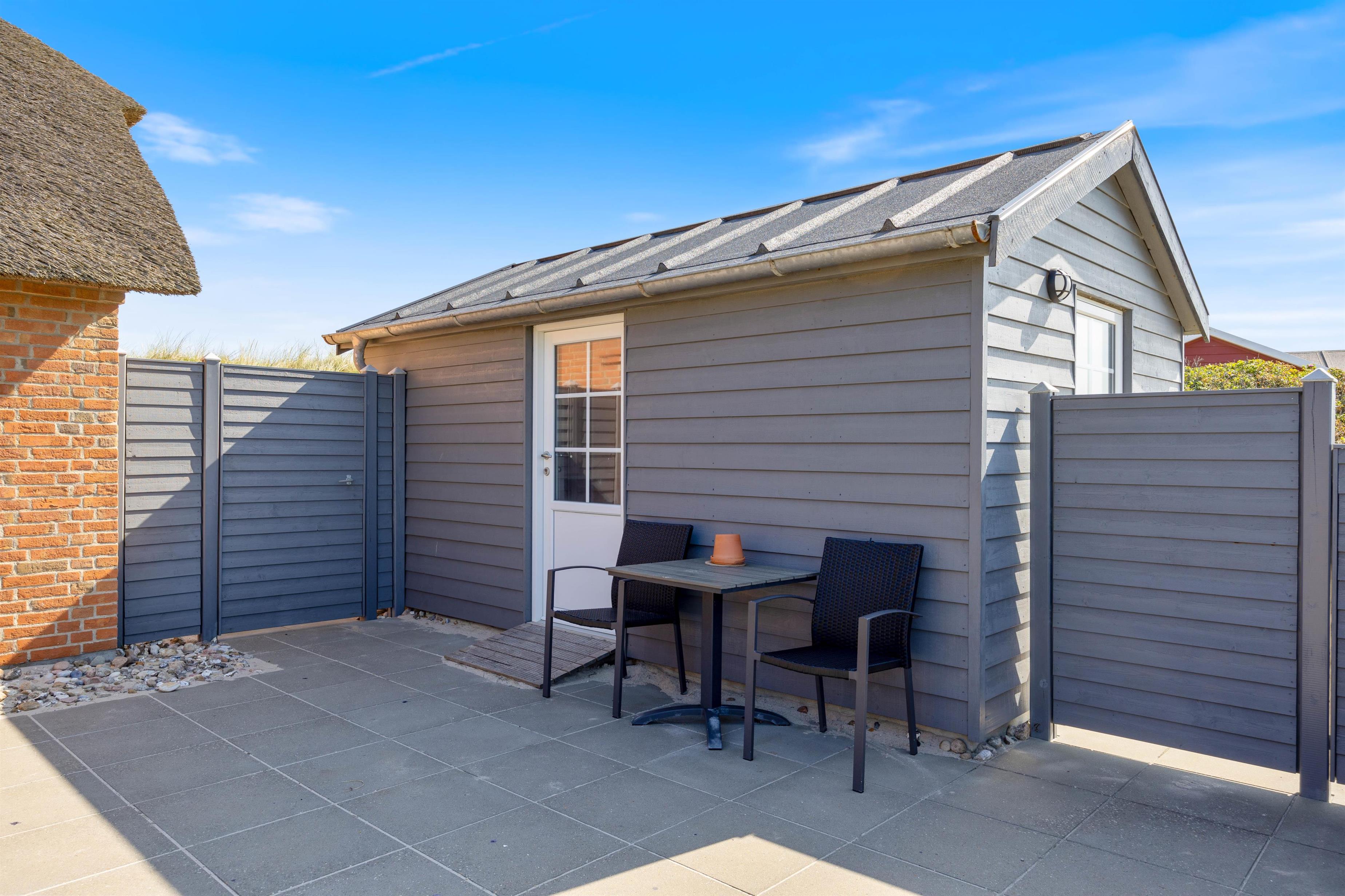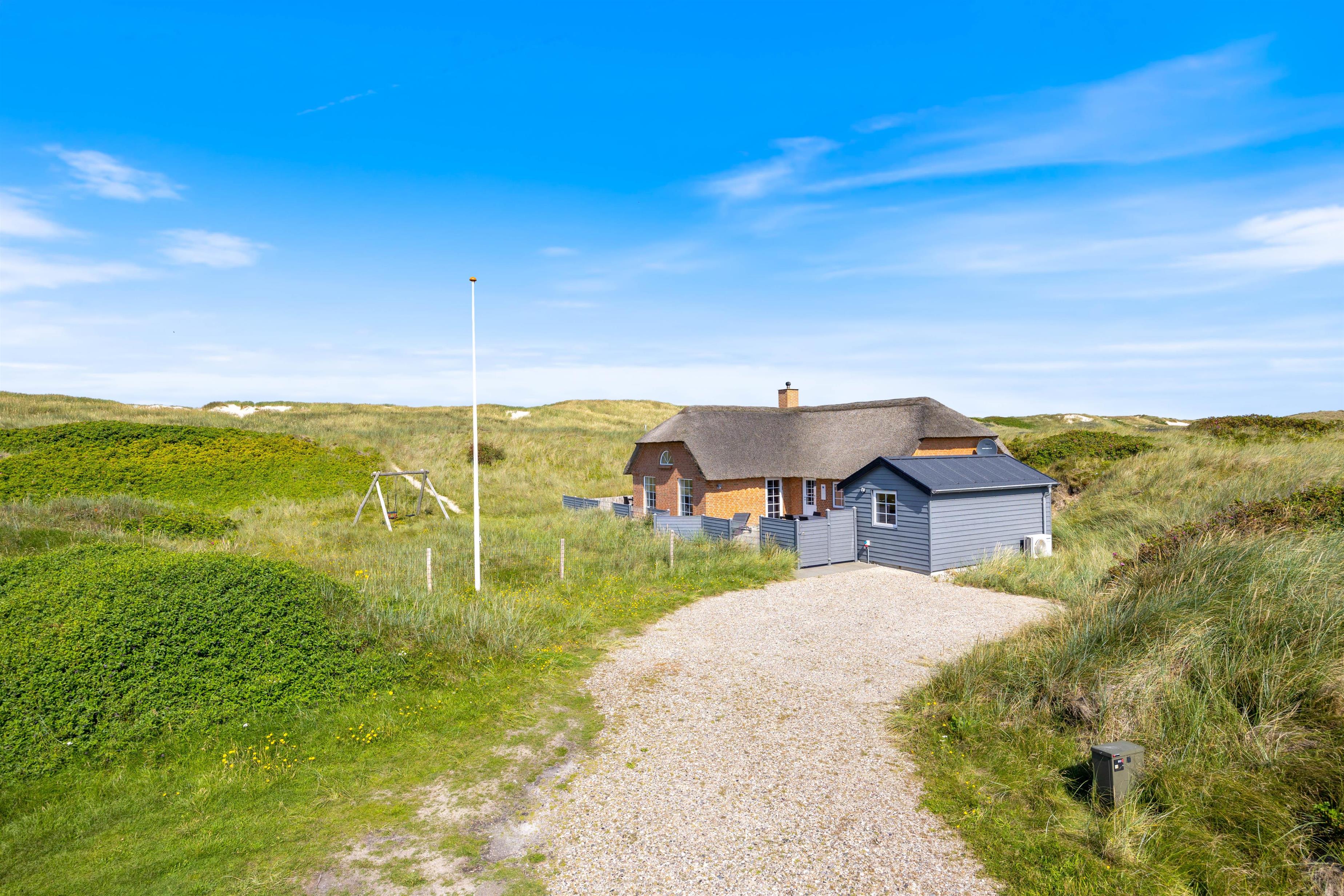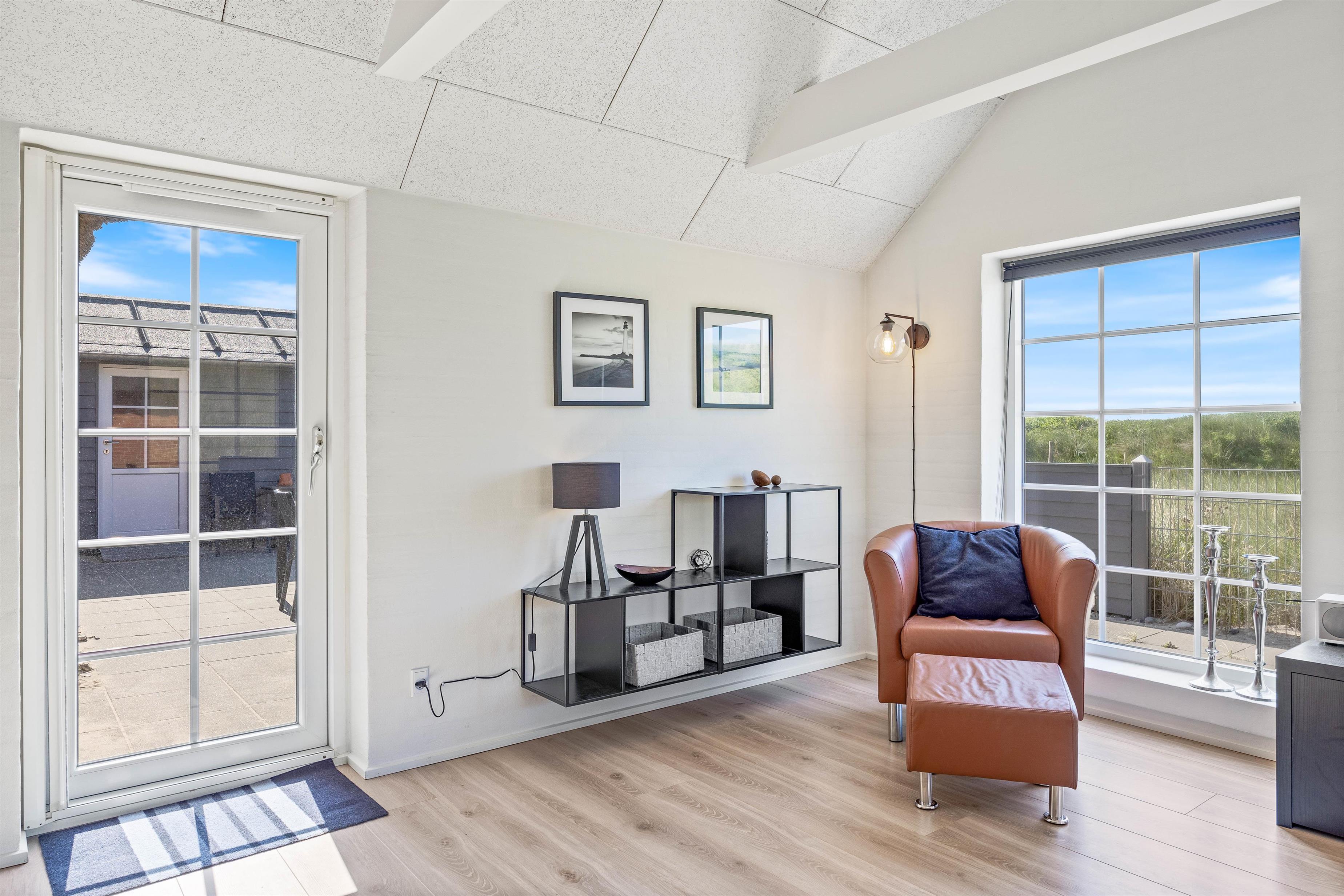 Fra stuen kommer I ud på terrassen, hvor I rigtig kan nyde den flotte udsigt ud over klitlandskabet, og hvis I hører godt efter, kan I næsten høre bølgernes brusen, mens I nyder et glas rødvin rundt om havebordet.
