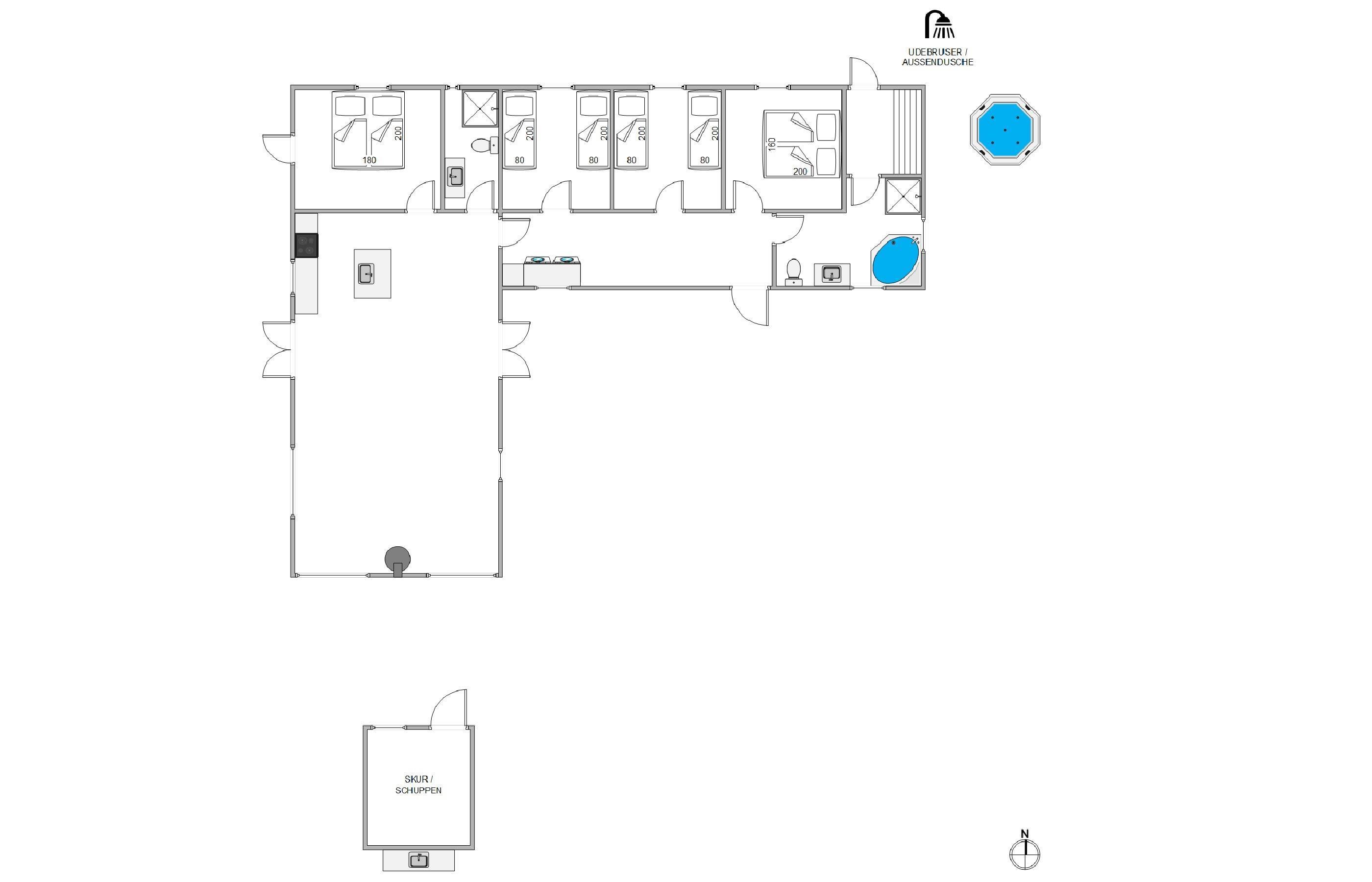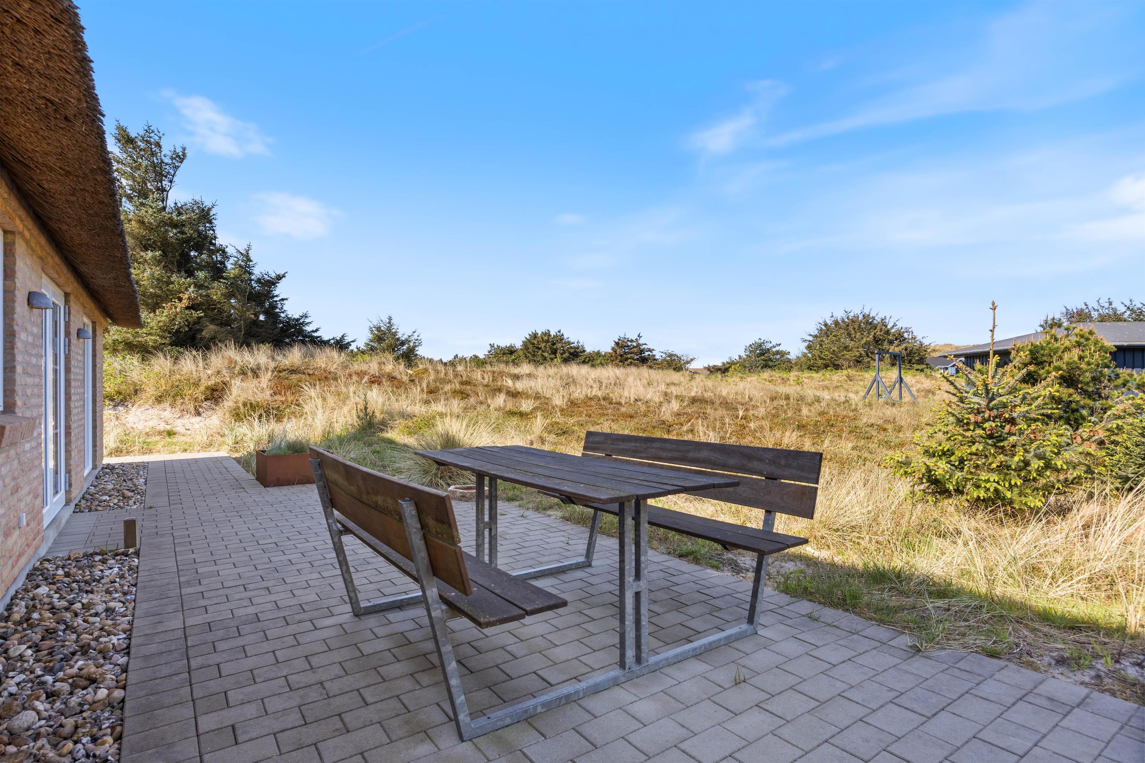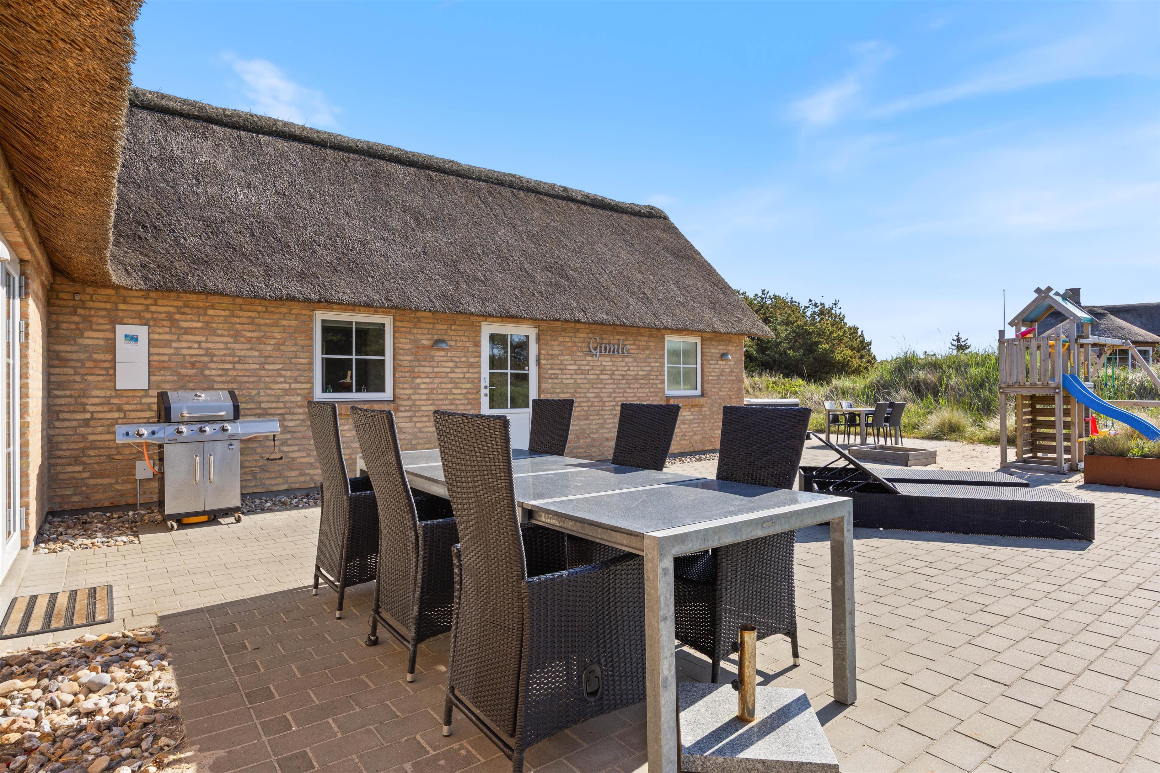 Rundt om sommerhuset finder I et skønt terrasseområde, hvor I nemt kan hive gasgrillen frem og varme nogle lækre bøffer til aftensmaden. Terrassen byder også på en lækker udespa, hvor der er god mulighed for masser af afslapning. På terrassen finder I desuden en udebruser, så I kan skylle resten af sandet af fra et dyp i havet. I kan benytte udebruseren fra april til november.