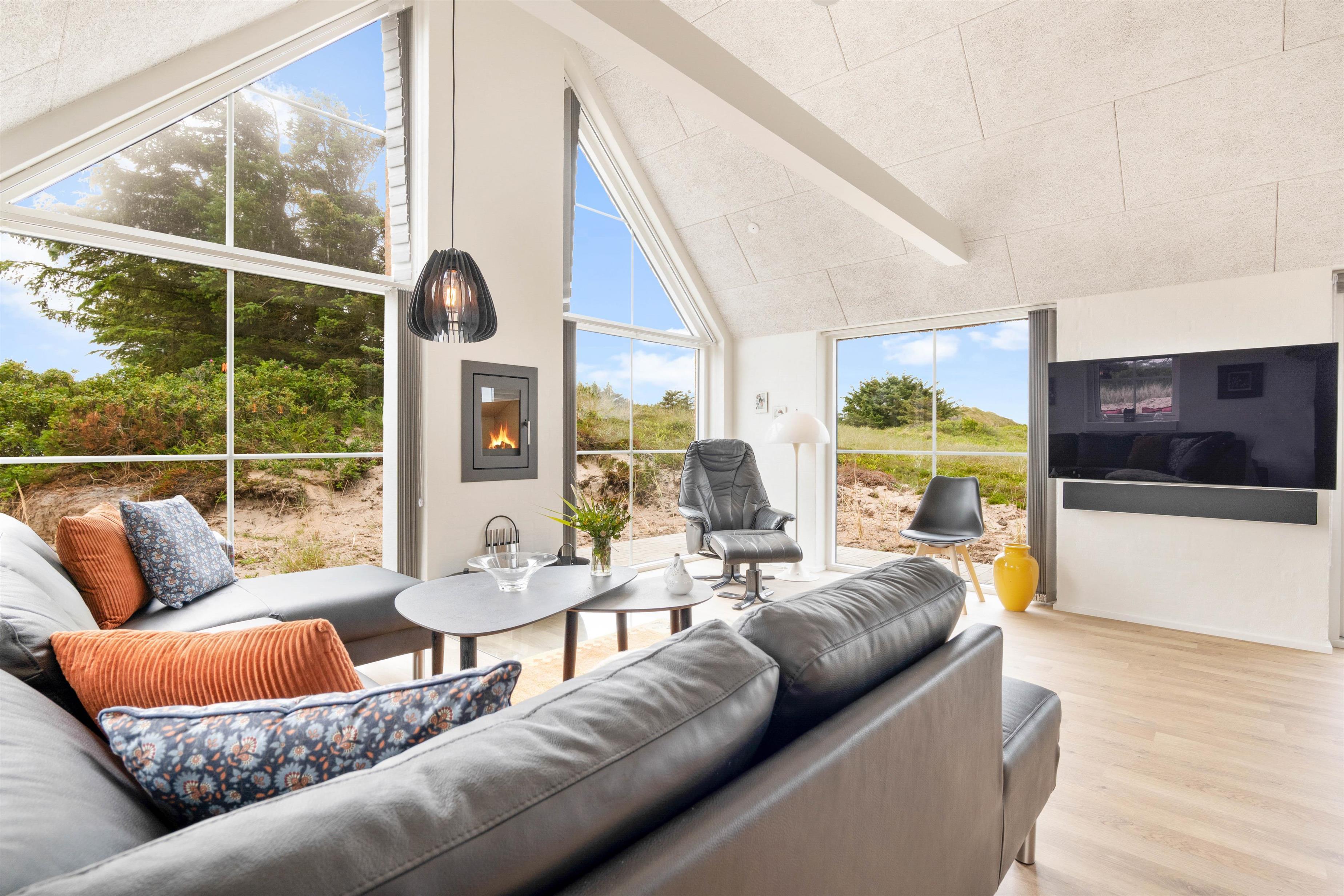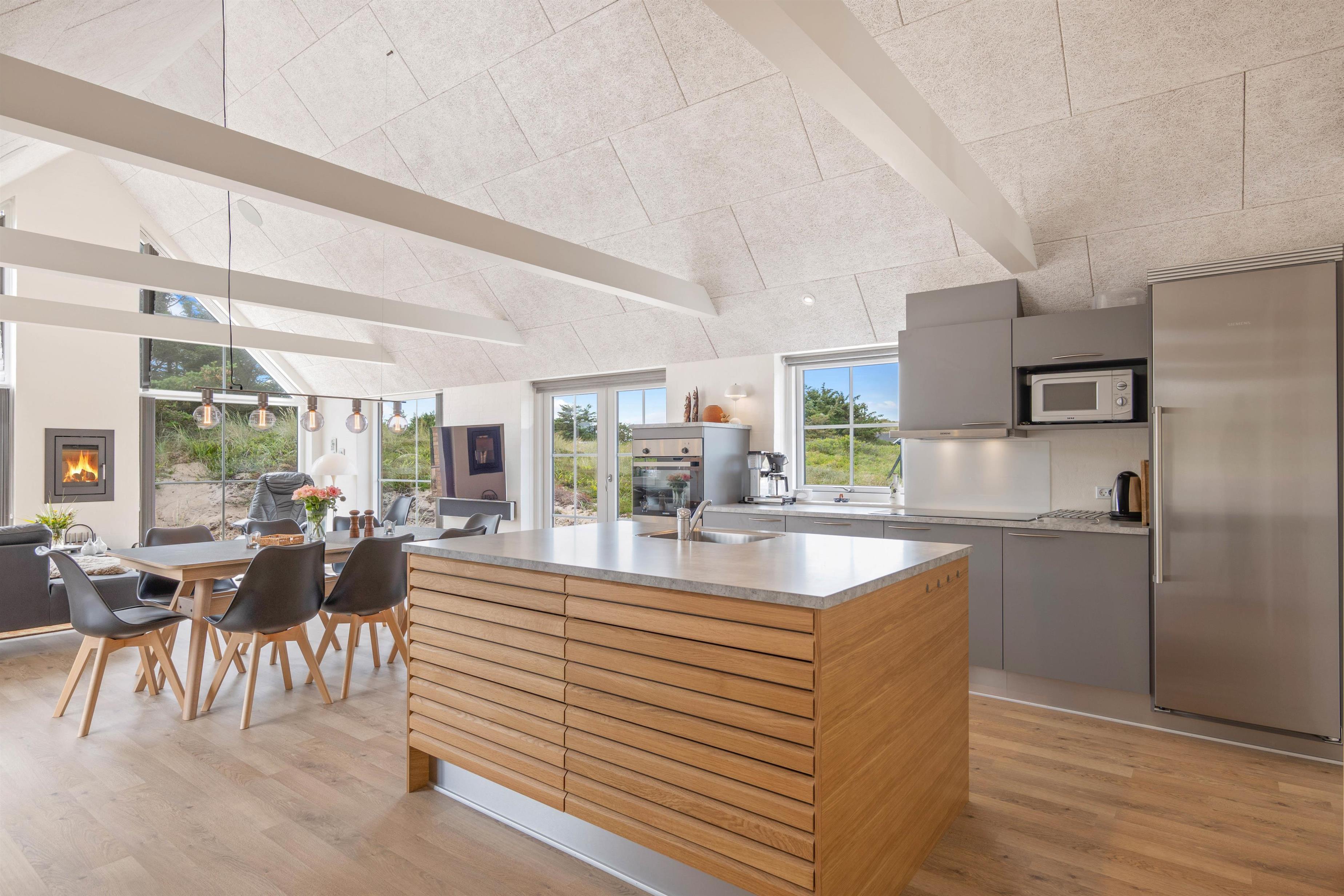 Køkken, stue og spisestue er i åben forlængelse og udgør på den måde ét stort rum, hvor hele familien kan samles. I køkkenet er der tænkt på alle nødvendige detaljer, så I kan bruge mindre tid til praktiske gøremål og mere tid med familien. I stuen kan I slænge jer i den bløde sofa efter en lang dag ved stranden og se jeres yndlingsfilm på fladskærms-tv’et, imens I får varmen fra den knitrende brændeovn.