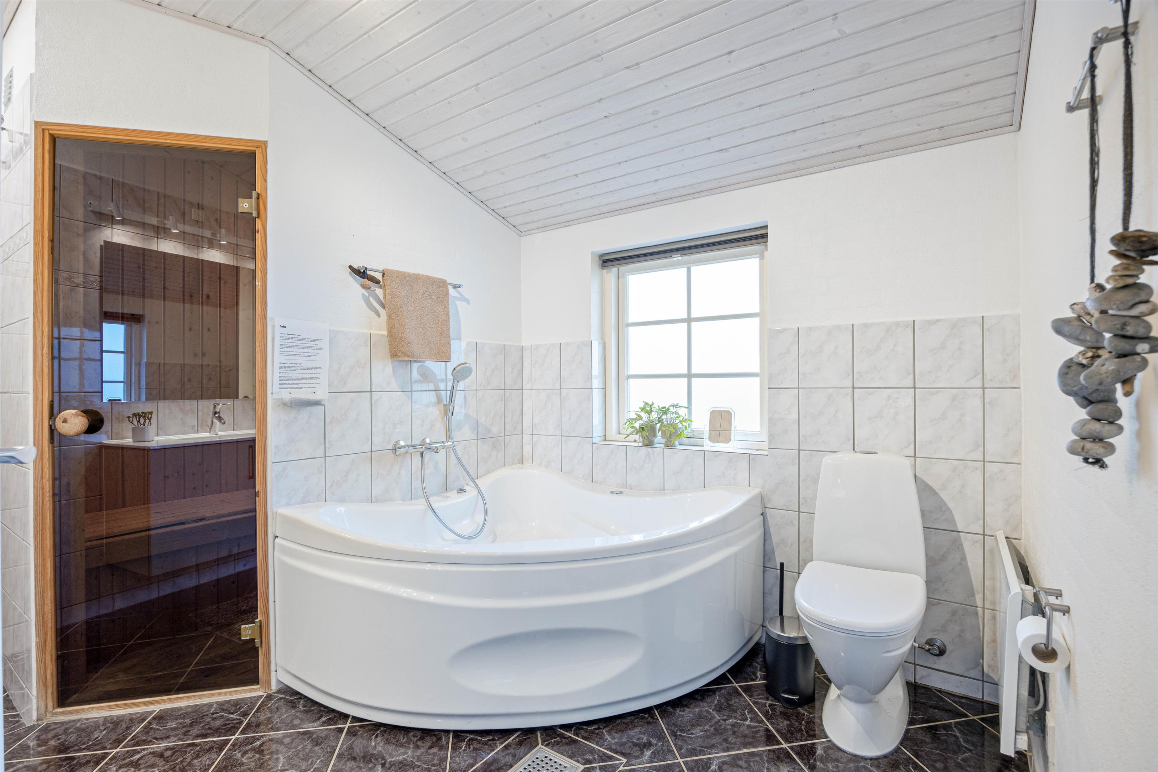 Kolde fødder er ikke noget I skal bekymre jer om, når I står op. Begge badeværelser er nemlig udstyret med gulvvarme. Ydermere er der på det store badeværelse alt I behøver for at slappe af. Her kan I nyde boblerne i spaen og blive ordentlig gennemvarme i saunaen.