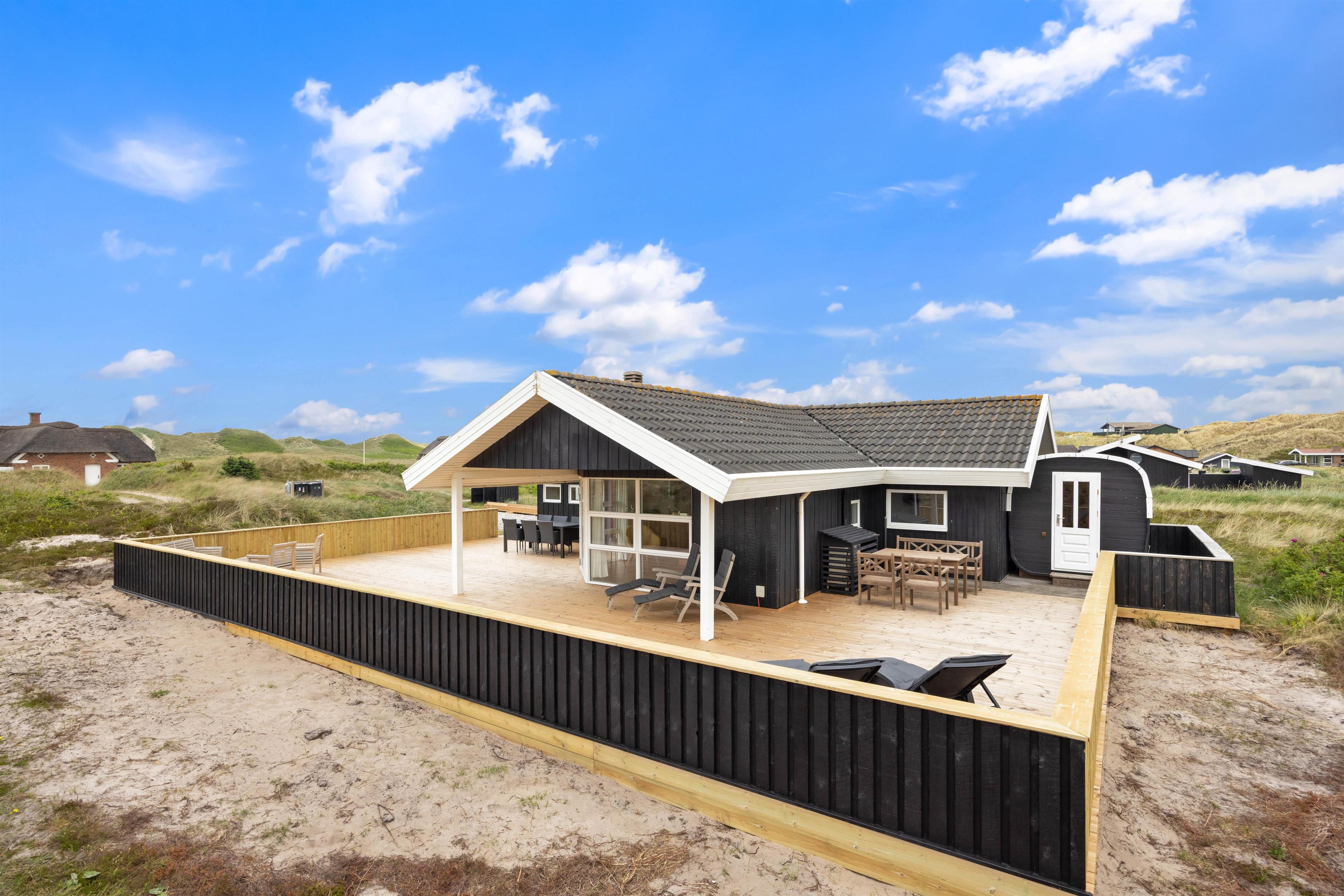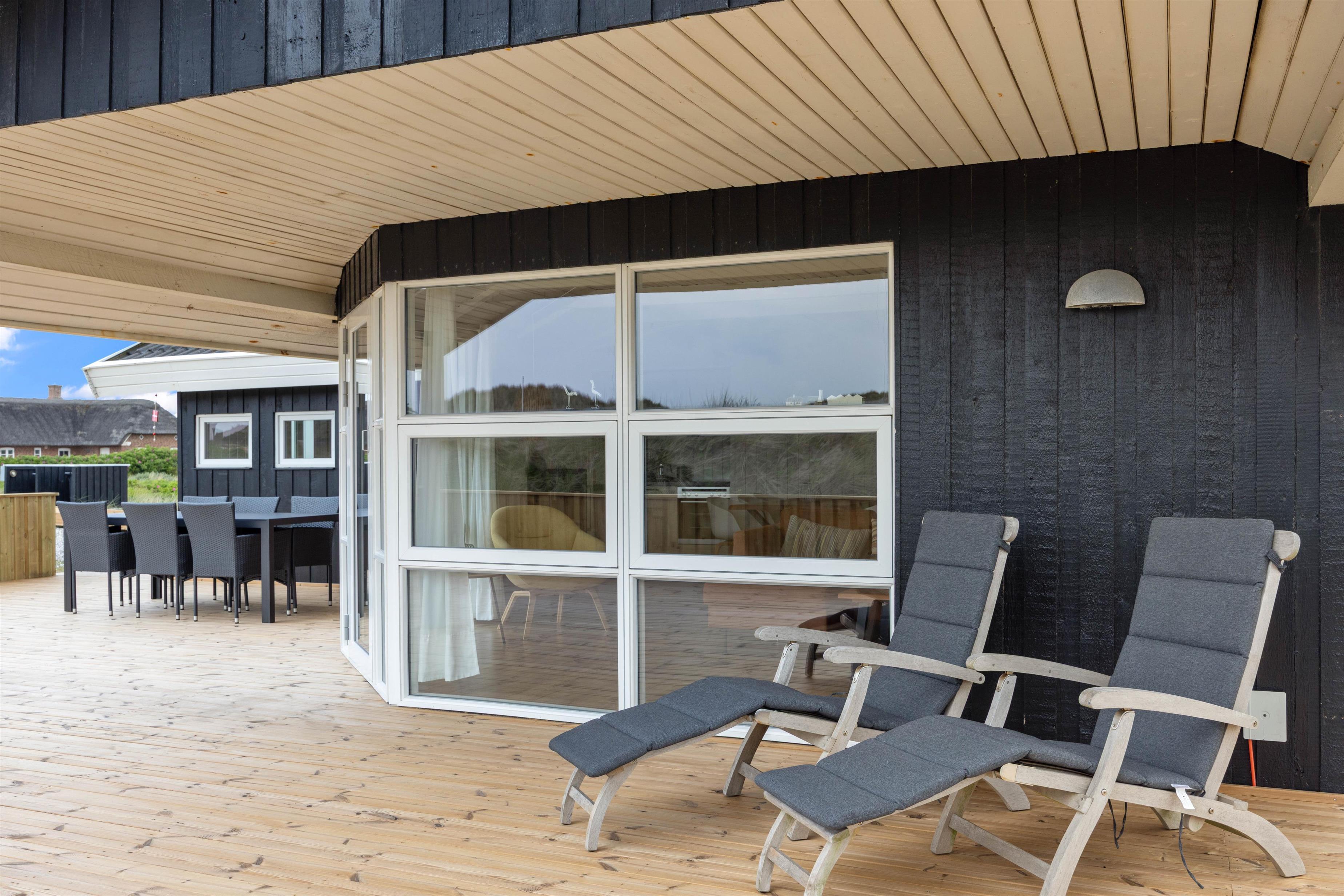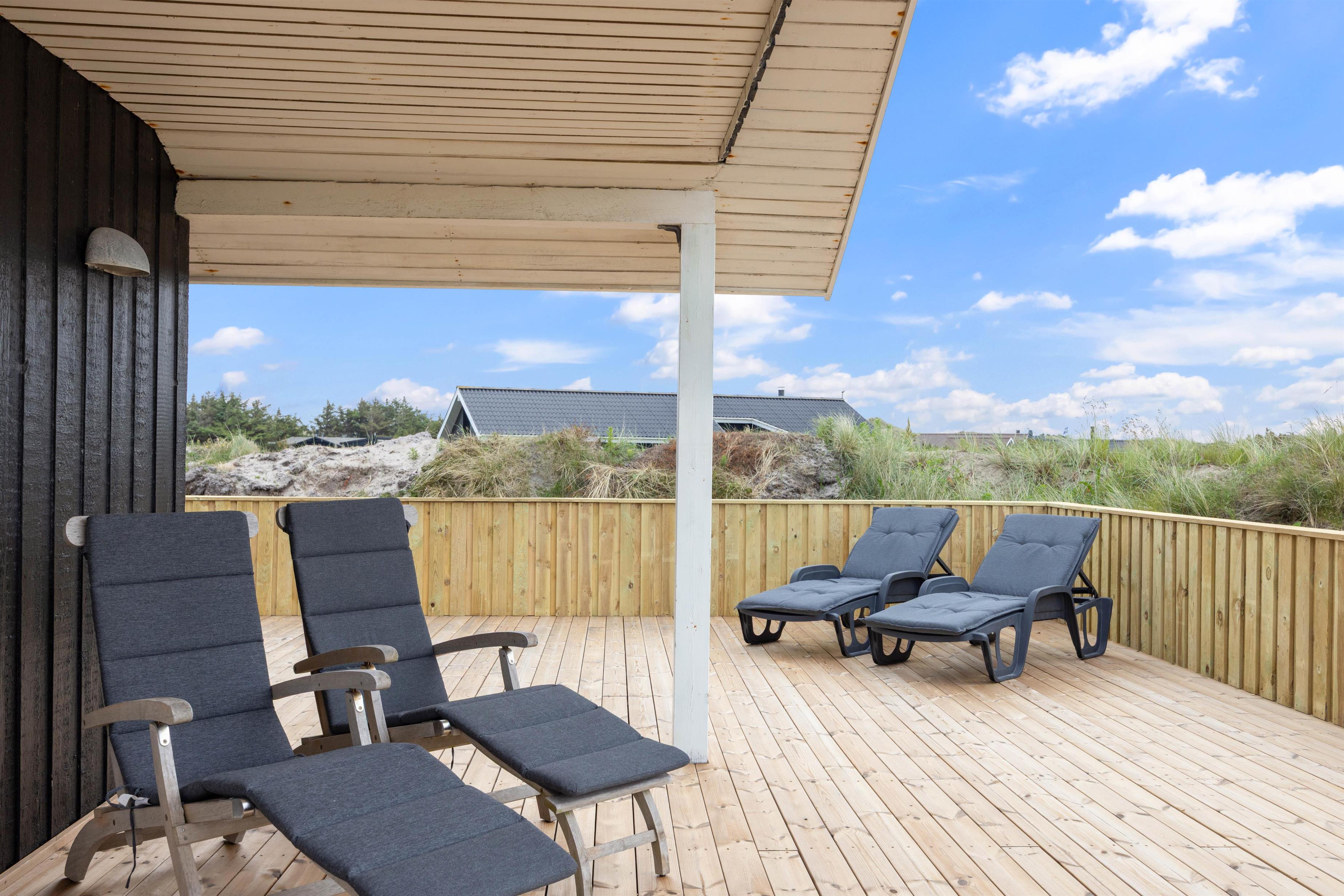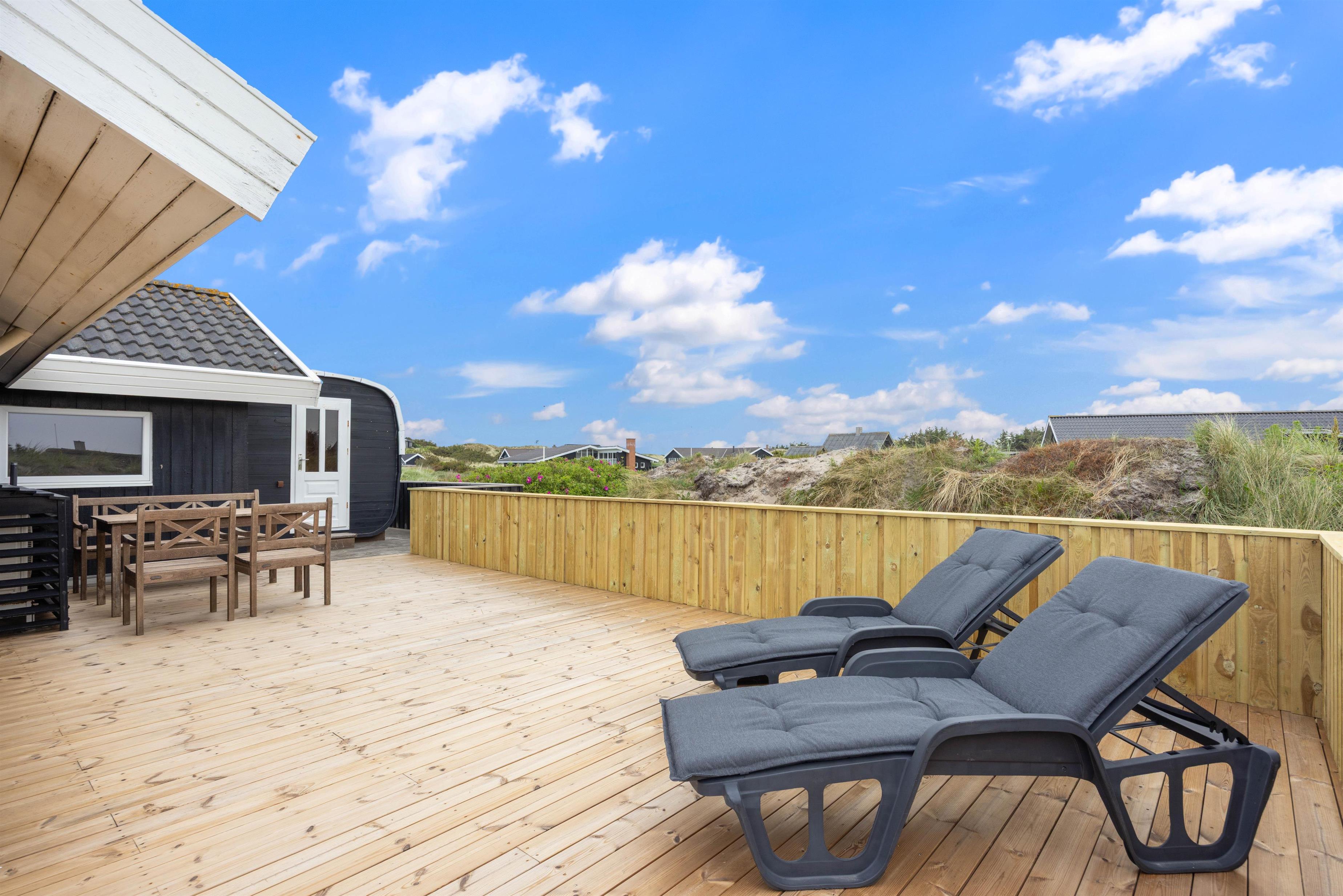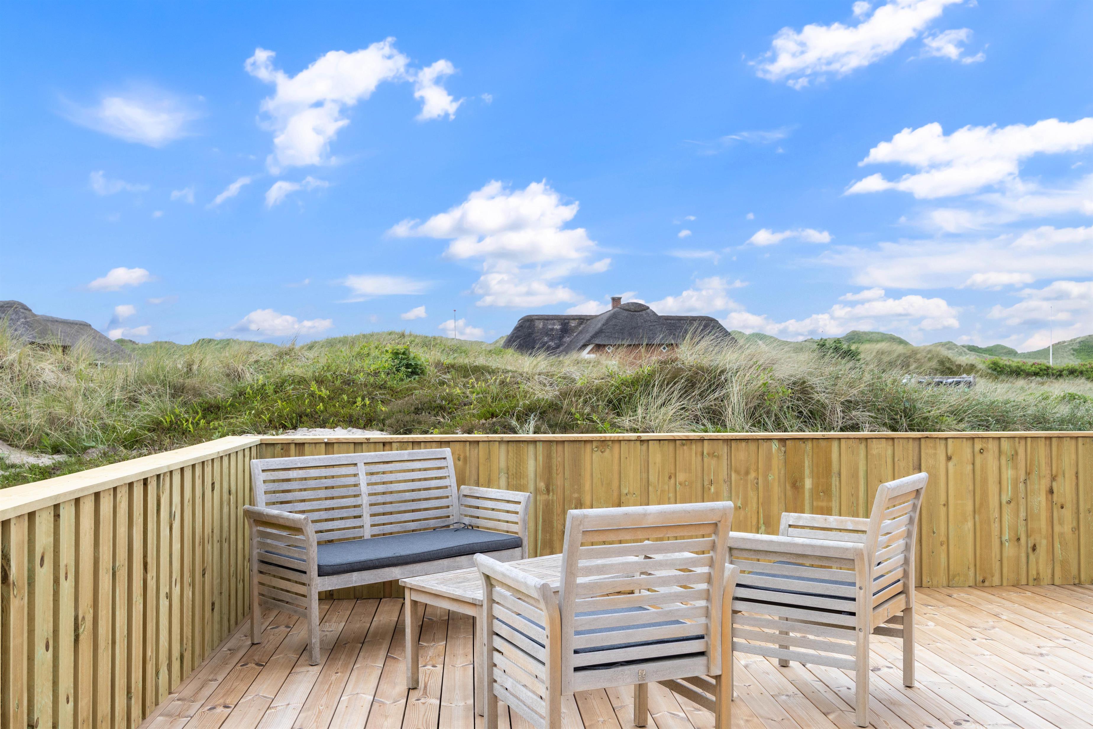 Udover havemøbler og liggestole har I også en grill til rådighed på terrassen. Om aftenen kan I samles på terrassen til en lækker middag med bøffer og vin, som I kan nyde, mens dagen så småt går på hæld, og I kan høre lyden af brændingen i baggrunden.
