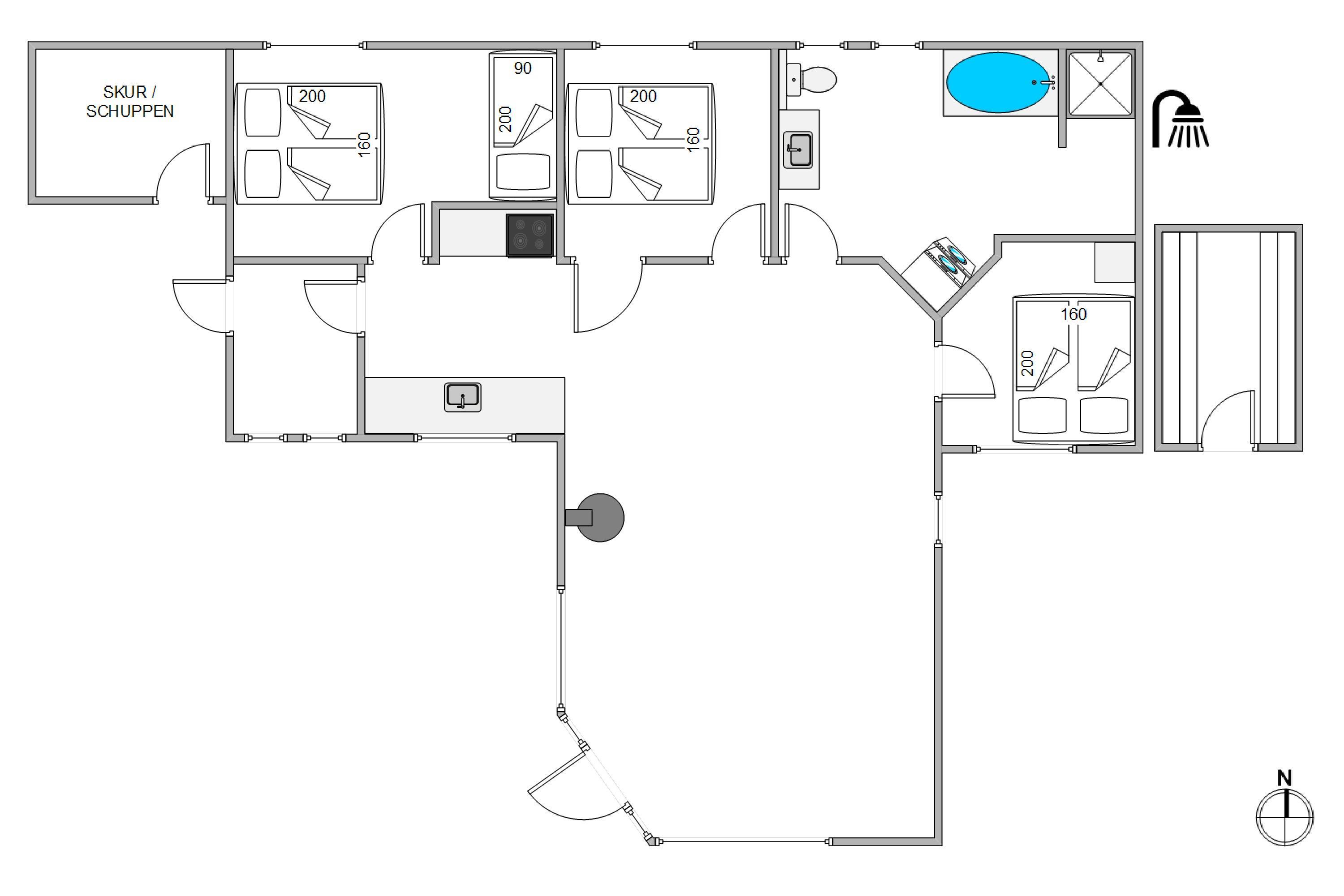 Sommerhuset er 82 kvadratmeter stort, og her kan I fordele jer på 3 soveværelser, hvor I kan få jeres skønhedssøvn på ferien. Desuden er der 1 badeværelse i sommerhuset, der er udstyret med gulvvarme. I har desuden en skøn sauna, hvor I kan nyde masser af afslapning på ferien.