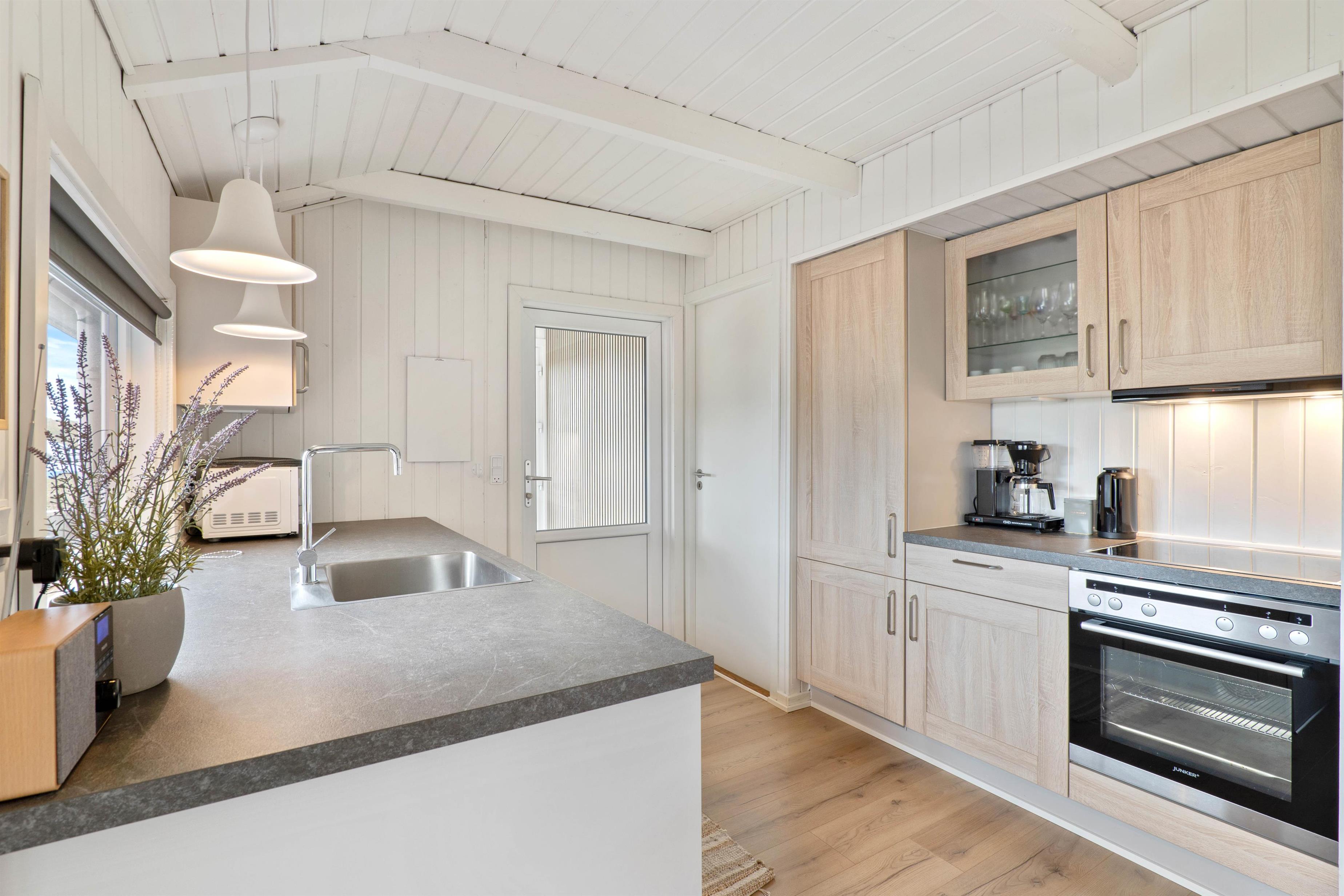 I feriehuset er køkken, stue og spiseplads samlet i alrummet, hvor I uden tvivl vil komme til at tilbringe mange dejlige feriestunder sammen med madlavning, spil og film. Desuden er der en brændeovn i alrummet, der sørger for god varme og for at holde feriestemningen i top.