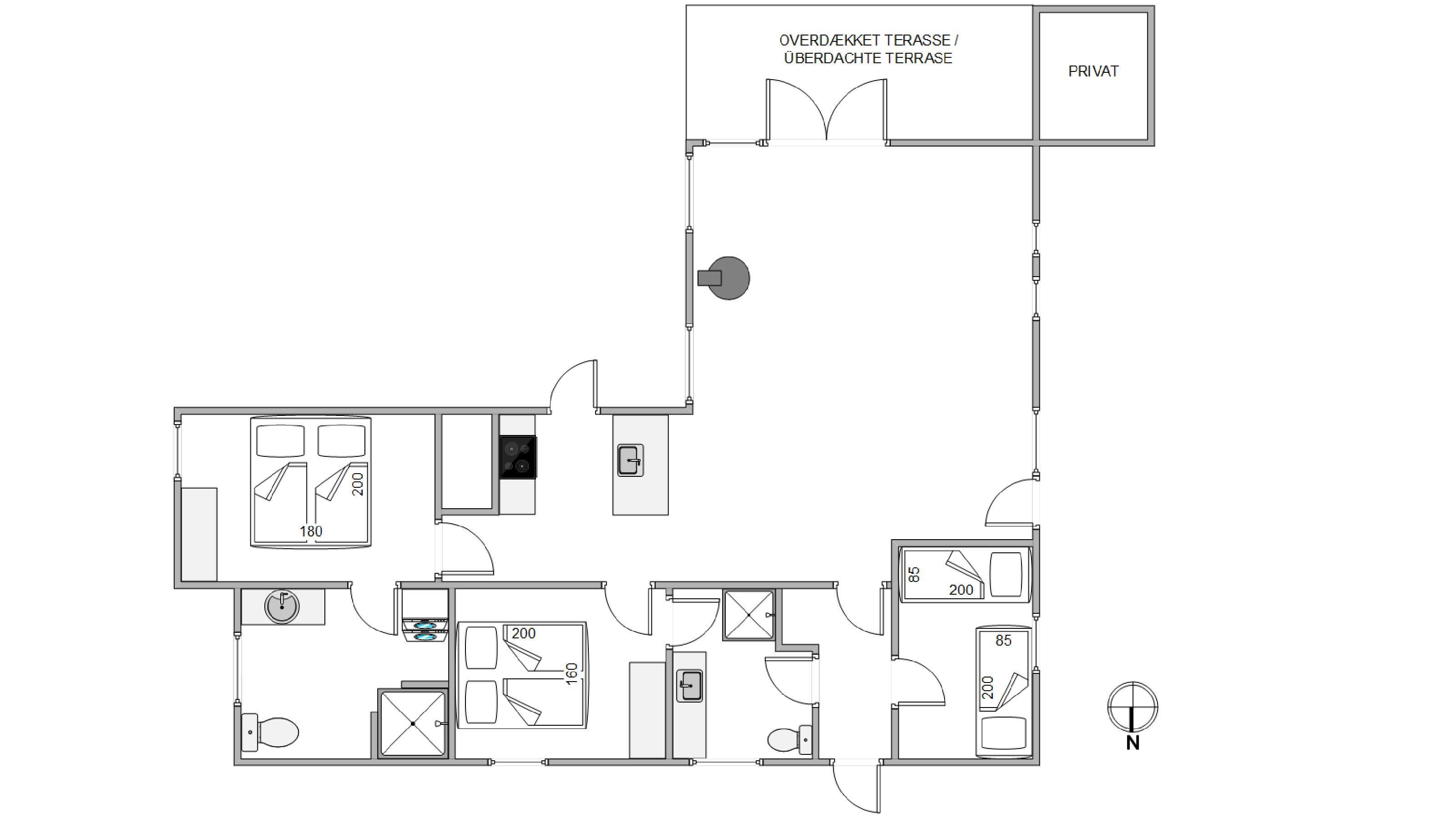 Feriehuset er både hyggeligt og praktisk indrettet, og mens køkkenet er udstyret med opvaskemaskine, kan I også hurtigt få vasket tøj ved hjælp af husets vaskemaskine og tørretumbler. En hurtig internetforbindelse sørger for, I kan streame film og serier i massevis, og de 2 badeværelser hjælper til at undgå de lange toiletkøer om morgenen.