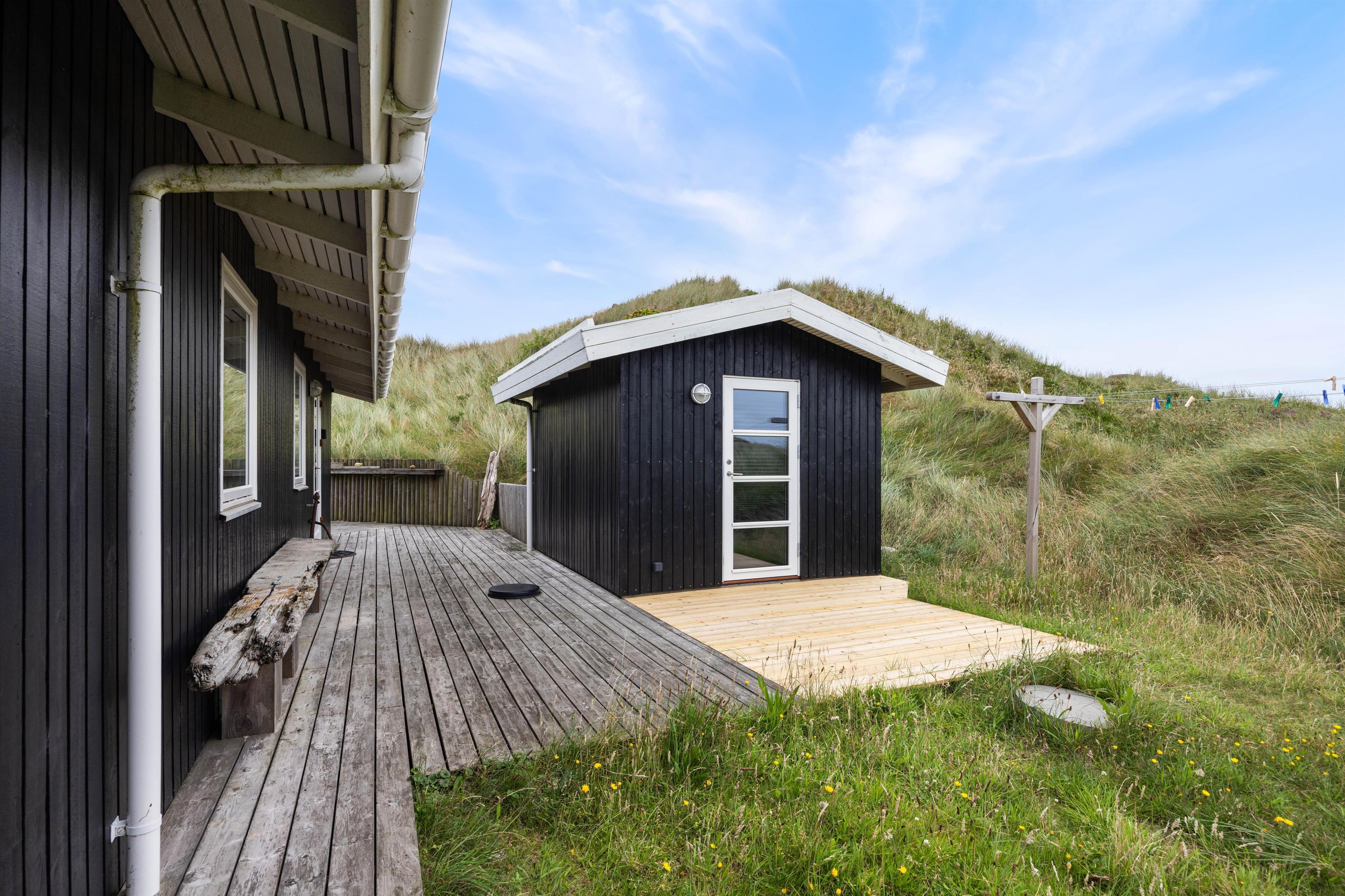 Sommerhuset på sortebærdalen 10 imponerer ikke kun indvendigt. Udenfor på adressen finder I nemlig nogle yderst indbydende arealer, hvor der er rig mulighed for at slappe af og nyde den skønne natur. Den dejlige træterrasse løber hele vejen rundt om huset, hvilket betyder at der mulighed for at nyde solens stråler og den friske luft uanset vind og vejr. Den ene del af terrassen som vender vest ligger godt beskyttet af den foranliggende klit, hvilket giver masser af privatliv. Samtidig kan I også nyde den overdækket terrasse, som giver jer mulighed for at nyde udelivet, på trods af det måske skulle dryppe lidt.
