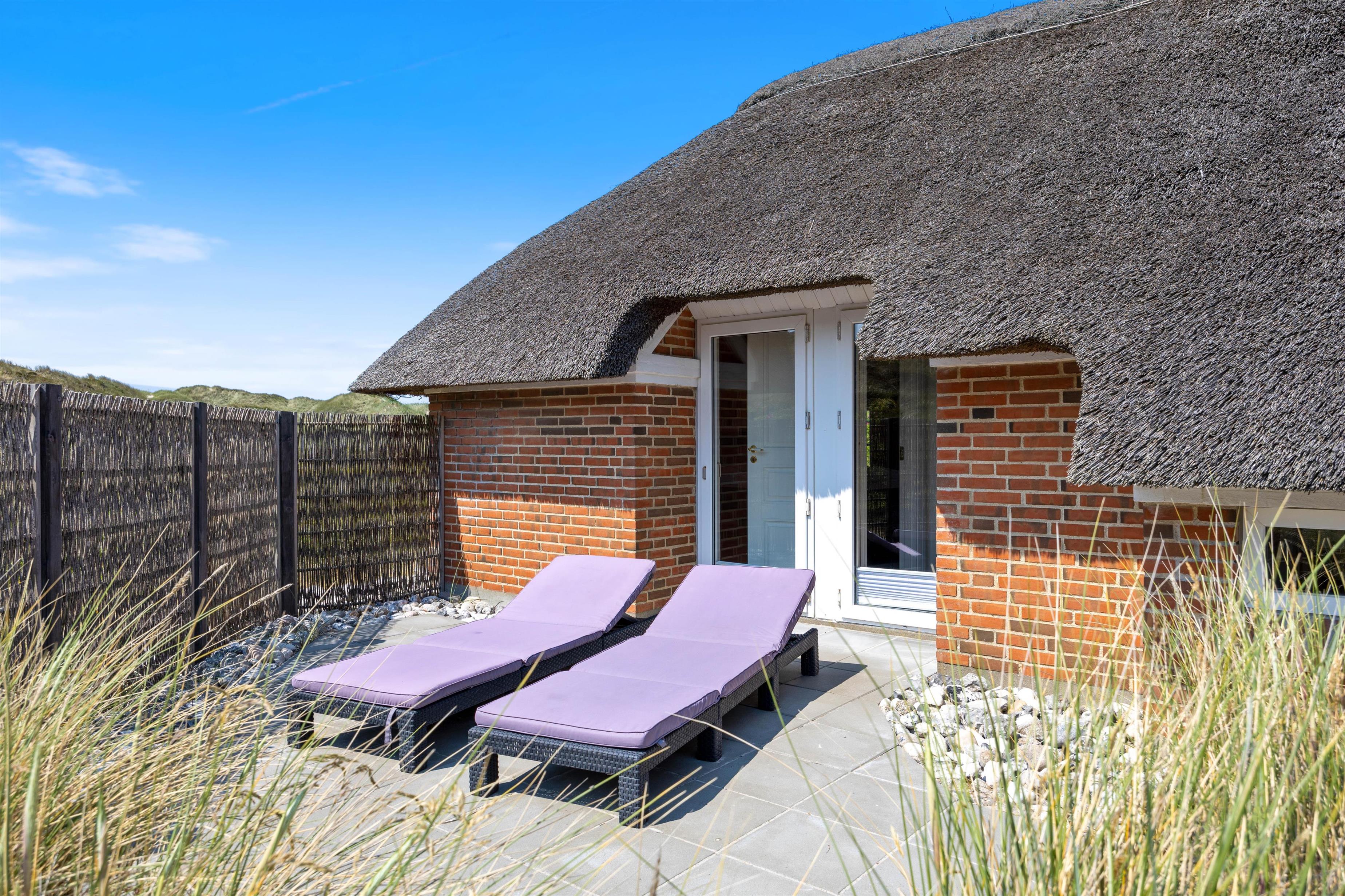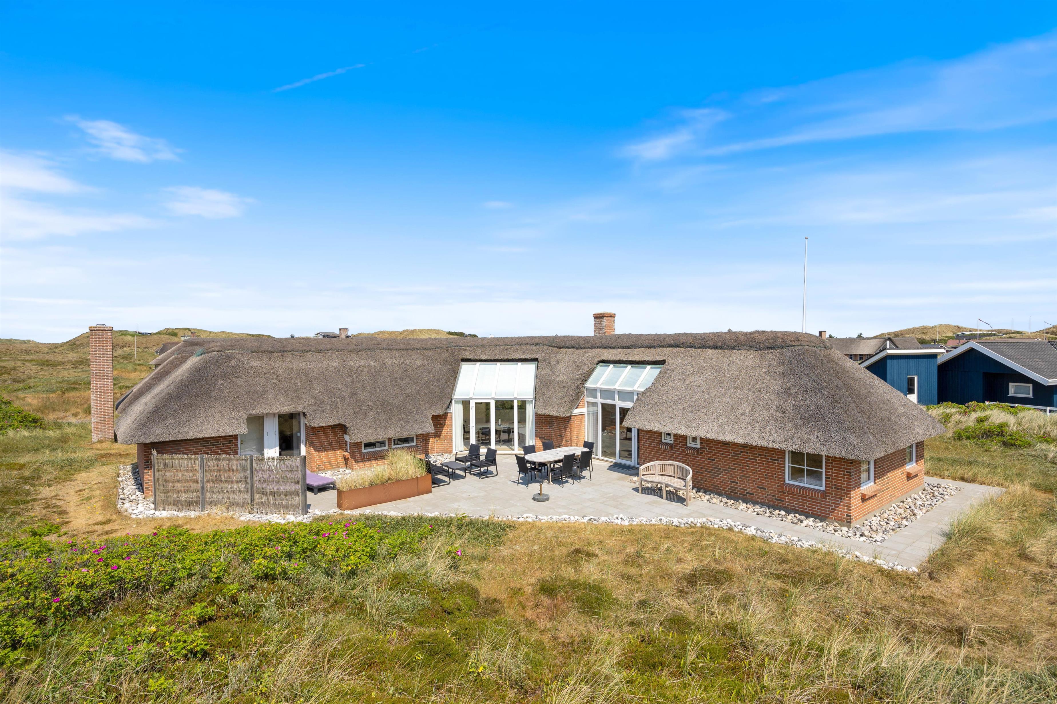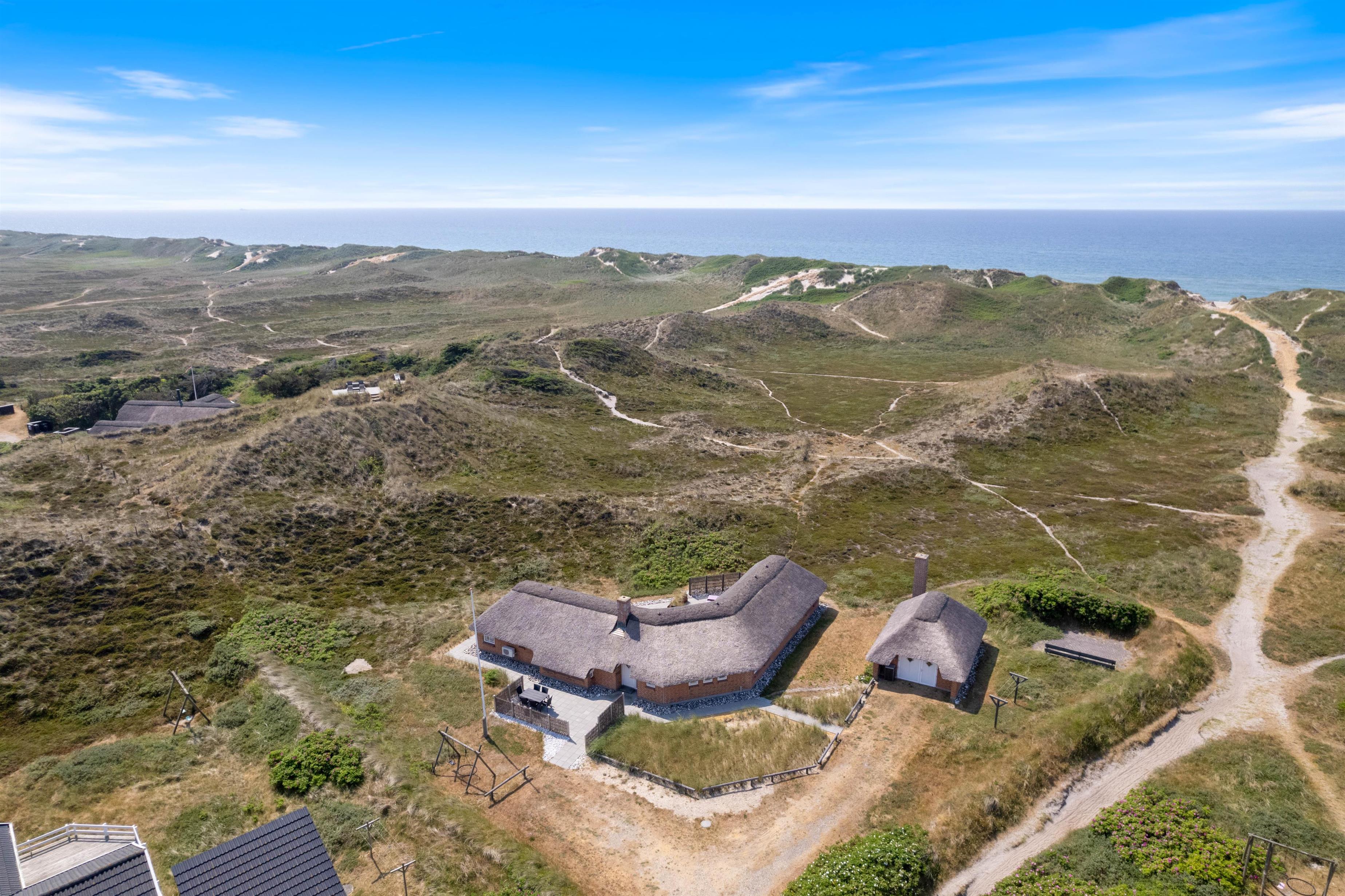 I baggrunden vipper marehalmen på smukkeste vis i sollyset, sølvgrønne- og lyngfarver stråler om kap med den klare blå himmel. Her i læ af klitterne og kun 200 meter fra havet ligger et smukt i 2019 nyrenoveret stråtækt hus klar til jeres ferie. Det 6 personers feriehus er dejligt lyst, men samtidigt hyggeligt med en gennemført stilfuld indretning.