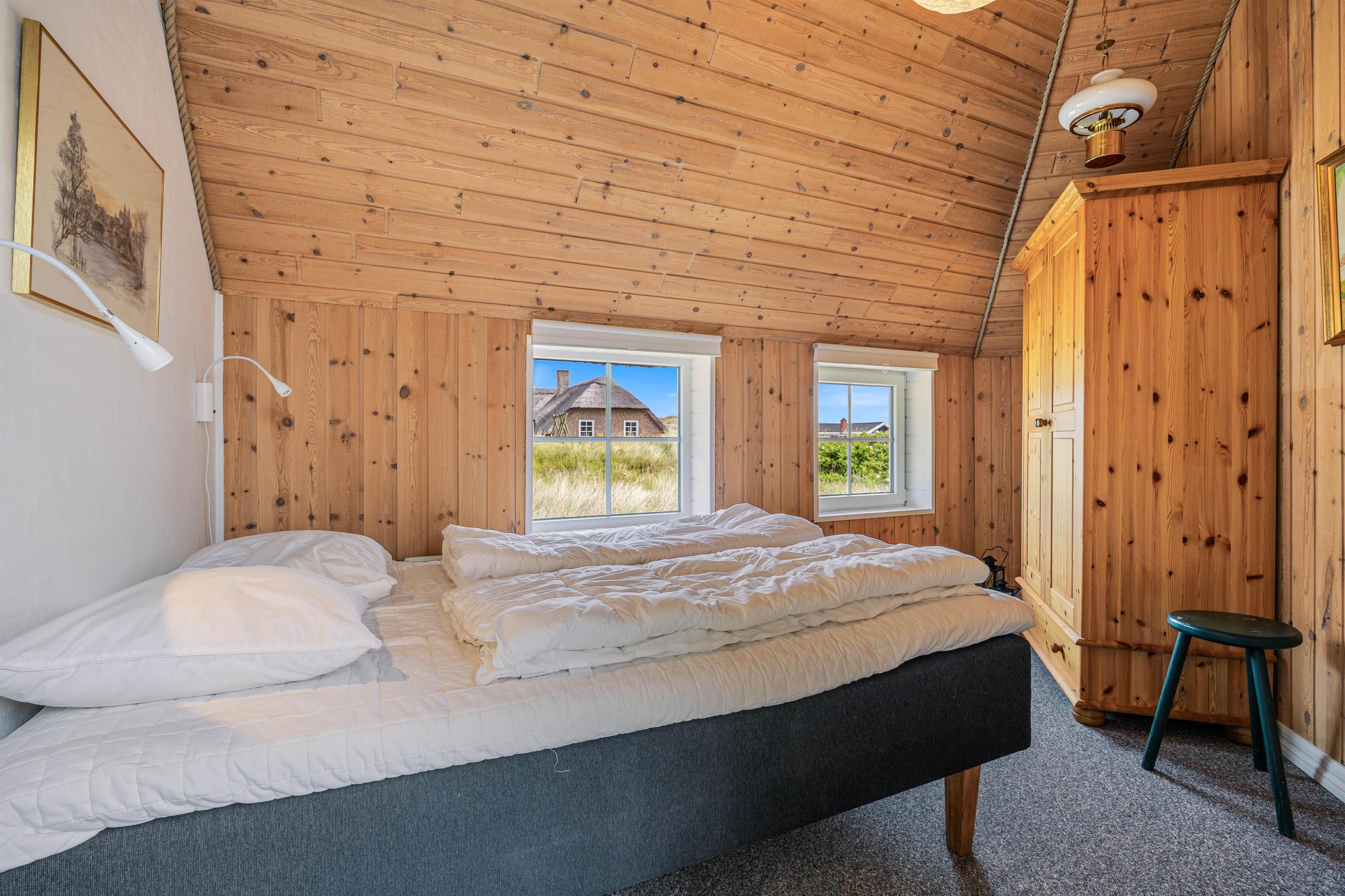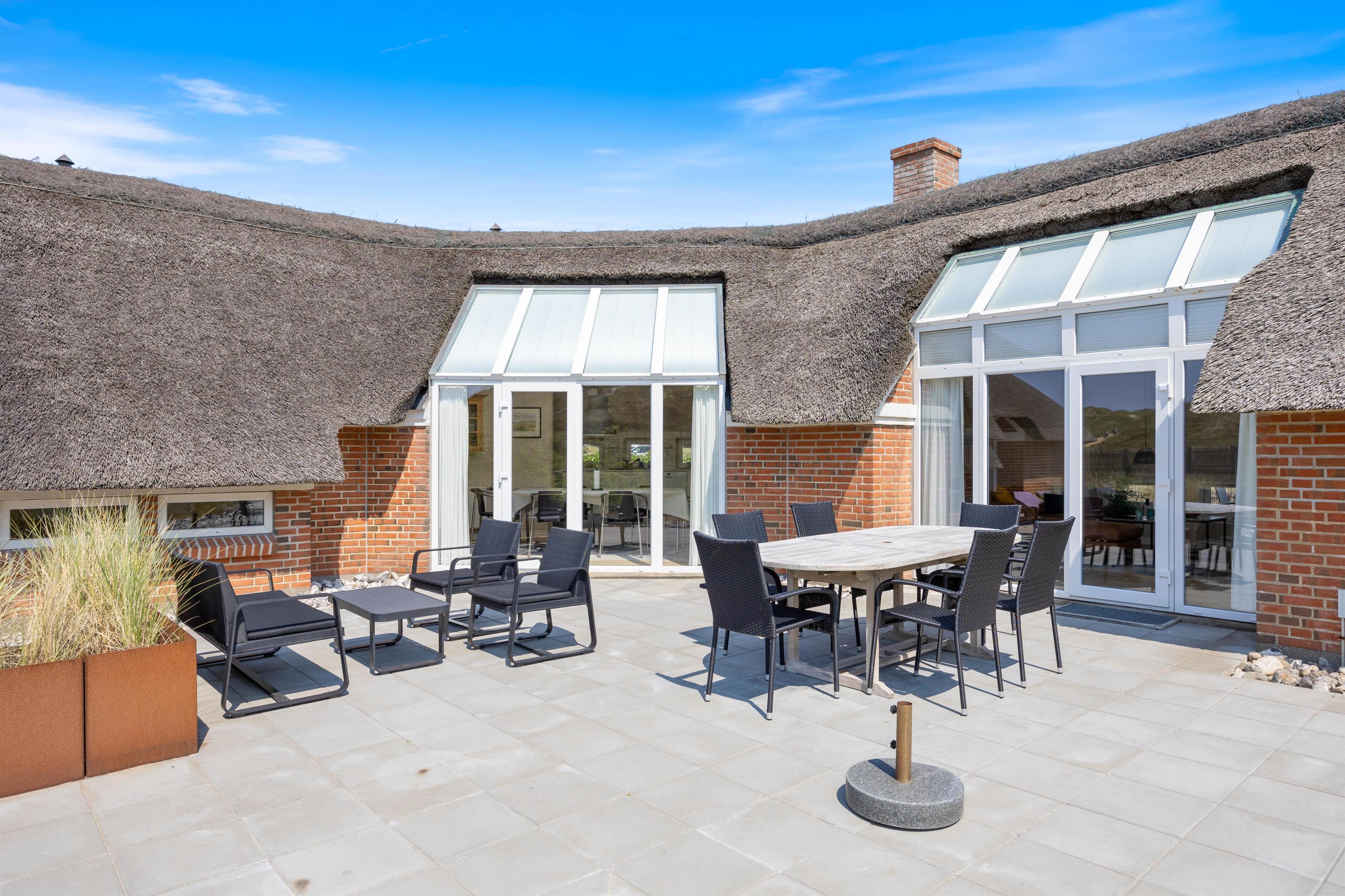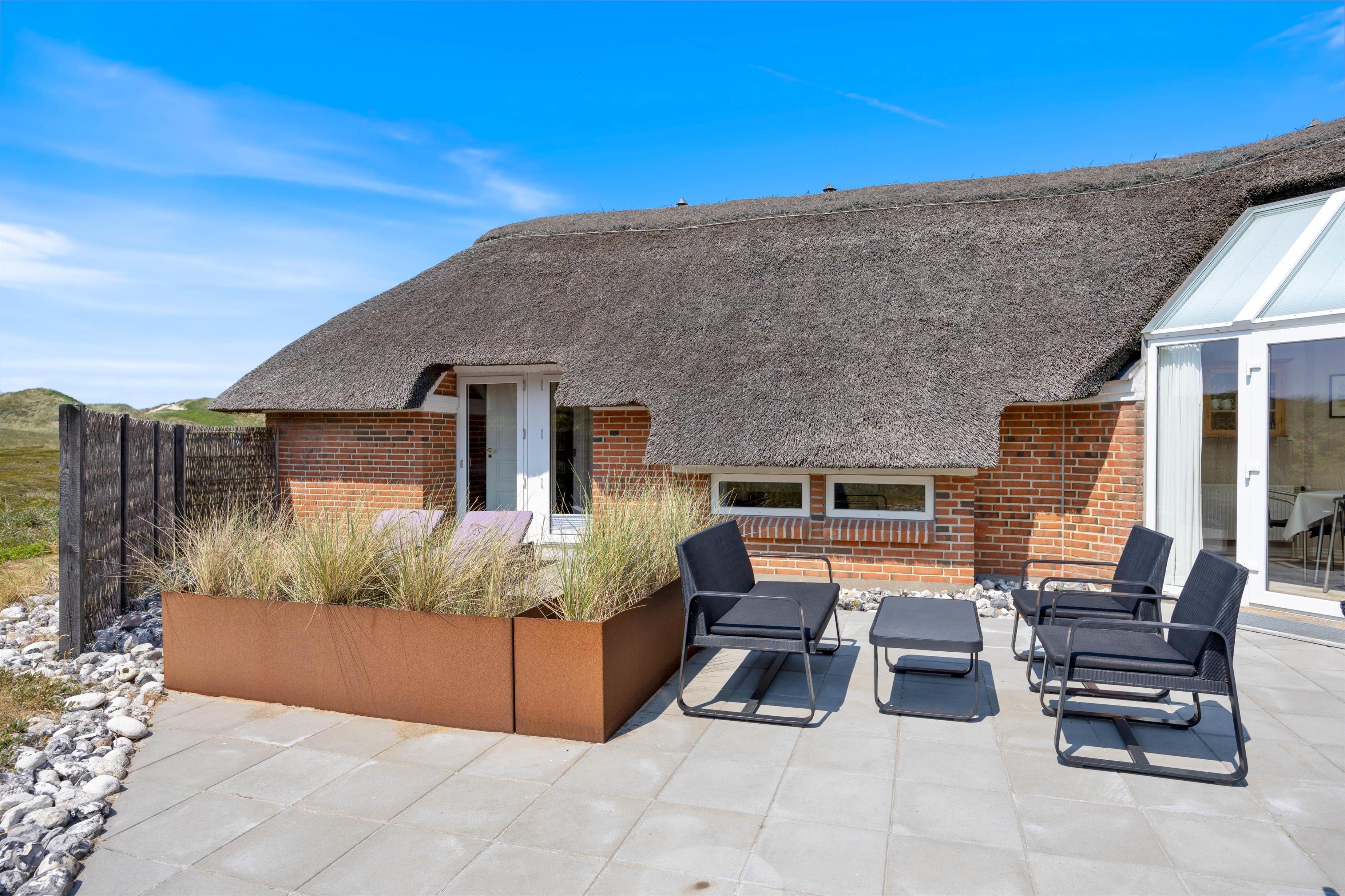 I baggrunden vipper marehalmen på smukkeste vis i sollyset, sølvgrønne- og lyngfarver stråler om kap med den klare blå himmel. Her i læ af klitterne og kun 200 meter fra havet ligger et smukt i 2019 nyrenoveret stråtækt hus klar til jeres ferie. Det 6 personers feriehus er dejligt lyst, men samtidigt hyggeligt med en gennemført stilfuld indretning.